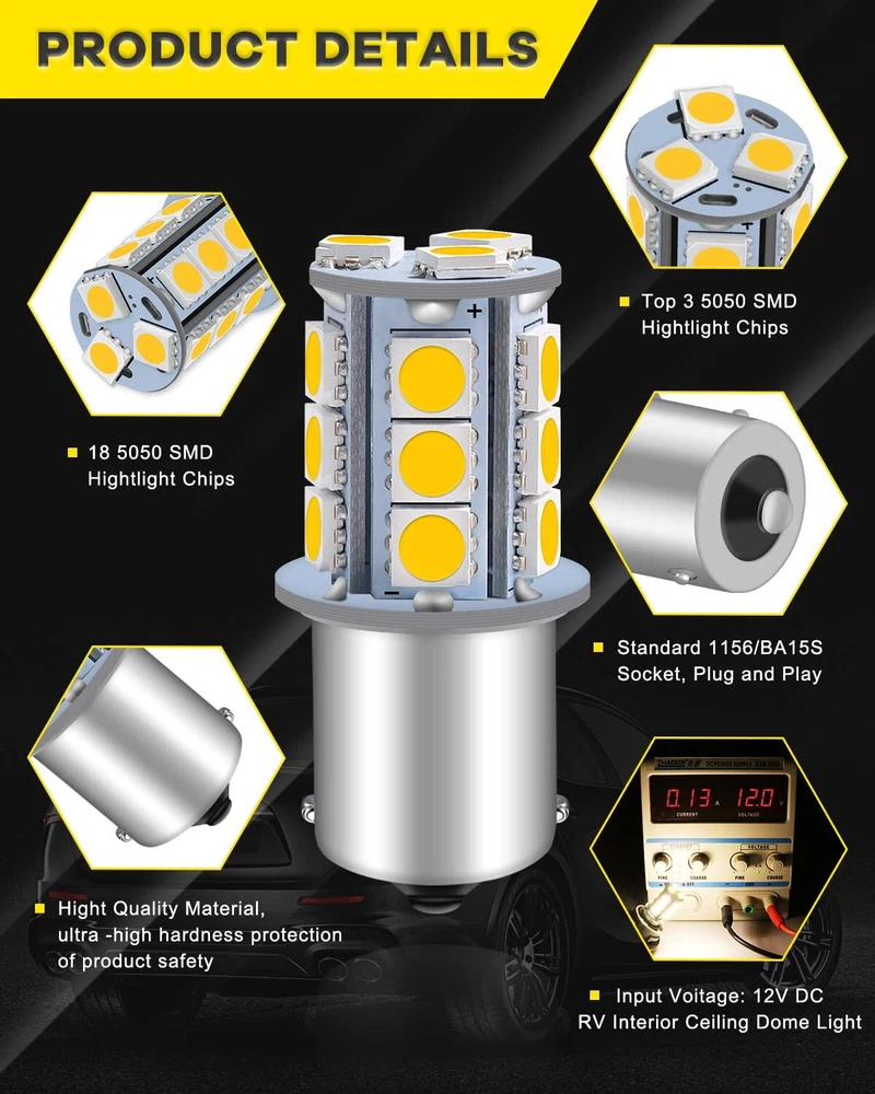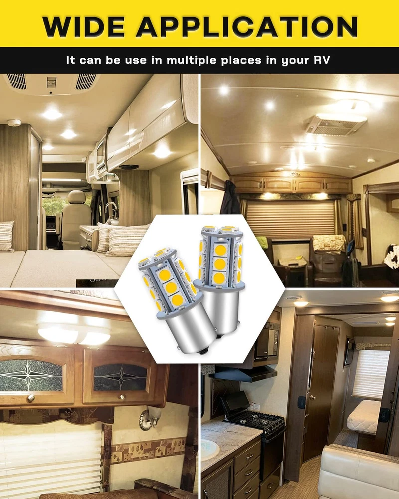 【Specification】Pack of 10 1156 led bulb. Voltage:12V DC. Power: 1.7W. LED chips: 5050 18SMD. 1141 led bulb rv warm white 3000K. 250Lum/bulb, 360° beam angle. Size: 43mm/1.69" * 19mm/0.75". Brighter and more comfortable rv light bulbs to provide you with a warm interior space 【Fitment】Compared to other cheap 1156 led bulbs, our cec 1141 led bulb is better and more sturdy, chips don't come off easily. Fits 1156 1141 1003 7506 BA15S 1073 1095 1383 1156A 1156NA 1195 12088 1295 1295NA 199 2396 3497 5007 5008 631 93 97 97A 97NA base 【Feature】7506 led bulb are 300% brighter than halogen bulb and more energy efficient, low power consumption. 1156 led light bulb with good heat dissipation, extend service life 【Upgrade Your Car】1003 12v led bulbs are used in many scenarios, such as rv interior light bulbs, camper led light bulb, travel trailer led bulb, motorhome, boat, 5th Wheel, turn signal lights, center high mount stop lights, lawn tractor light etc 【Buy with Confidence】Our 1156 BA15S 7506 1141 rv led light bulbs have passed testing, in terms of quality you can rest assured. Any question, please feel free to contact us