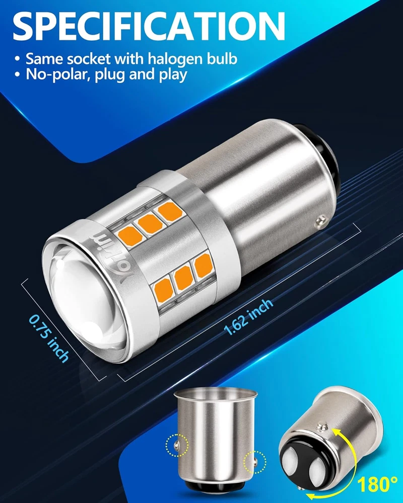 Store New Arrivals Add to Favorite View Feedback Contact 1157 LED Bulb Amber 2357 Led Bulb 300% Super Brighter 1157 LED Turn Signal Lights 2057 7528 BAY15D Led for Car Blinker Lights Side Marker Lights, Pack of 2 Description Item model number 1157-3215 Item Package Quantity 1 Operating Life 50000 Hours Light Source Type LED Wattage 3.6 watts Color Amber pack of 2 Manufacturer Part Number 1157-3215 Item Weight 1.76 ounces Voltage 12 Volts Auto Part Position Right Size 1157 Package Dimensions 3.19 x 2.2 x 1.06 inches Fit Type Vehicle Specific Fit 【GREAT OUTPUT】- Yorkim 1157 LED bulb is built with 21 PCS powerful 2835 SMD LED chips on multiple sides paired with an integrated special PC lampshade, 360 degree lighting angle, super bright without dark spots or shadow area, bright but no dazzling, 300% Brighter than halogen bulbs 【LONG LIFESPAN】chips: 2835 chips, voltage: 10-30V, color: Amber Yellow, lumen: 1500lm/bulb, Watt: 3.6W/bulb. Full aluminum housing and built-in upgraded smart IC driver for high heat consumption, constant current and great perfomance, lifespan can be up to 50,000 hours 【SAFE AND QUICKER】1157 led bulb is instant start, no delay, safe and reliable enough, no glare to other drivers. NOTE: When used as Turn signal lights Brake lights, a load resistor might be needed to prevent hyper flashing issue 【EASY INSTALLATION】No-polar design, fit in standard 1157 socket, just remove the original bulb and insert this 1157 LED bulb, plug and play in 10 minutes, no different than installing a normal bulb 【MULTI APPLICATION】Fit for 1157 BAY15D 1016 1034 1157 1157A 1178A 1196 2057 2057A 2357 2357A 2357NA 2397 3496 7528 ect, for Turn Signal Lights, Tail Lights, Parking Lights, Side Marker Lights, Daytime Running Lights etc Product Description Yorkim 1157 2357 2057 7528 BAY15D led bulbs amber, obvious lighting for led turn signal light bulb Yorkim 1157 LED bulb amber is built with 21 PCS powerful 2835 SMD LED chips on multiple sides paired with an integrated projector, high quality chips can offer you great light, and the projector makes the light more focused. 360 degree lighting angle, ensures the light more uniform and much fuller, super bright without dark spots or shadow area, bright but no dazzling. 300% Brighter than halogen bulbs, provide ultra bright, beautiful and clear light, updates your car a modern look PLEASE CHECK YOUR BULB SIZE BEFORE PURCHASING, THIS IS THE 1157 BAY15D 2057 2357 7528 BULB Dual Function This 1157 led bulb can be used as Turn Signal light or day running light NOTE: When used as Turn signal lights, a load resistor might be needed to prevent hyper flashing issue Canbus Error Free Built-in intelligent constant current IC driver, canbus error free for more than 95% vehicles, no flikering, no error code, stable input current protects the circuit, low power consumption, great performance Great Heat Dissipation Voltage: 10-30V Color: amber yellow Watt: 3.6W/bulb Full aluminum housing and built-in upgraded smart IC driver for high heat consumption, constant current and great perfomance, lifespan can be up to 50,000 hours. Yorkim 1157 led bulbs can be 300% brighter than the dim yellowish halogen bulbs Wide Application: This 1157 led bulb can be commonly used for turn signal light, day running light,blinker light and ect. This doesn't mean that the bulb can fit for all position for your vehicle, it depends on year/make/model and exact position. So please check the fitment data before making an order. Δ How to Find Correct Bulb Size for Your Vehicle? 丶Check your vehicle user manual or original halogen bulb, the part number is marked above. 丶Search "automotive bulb look-up" online, and enter your vehicle info to find out the correct size. 丶Ask a question in 'Customer questions & answers', write down your vehicle year, make and model and which position you are replaceing. ABOUT US We offer the best prices around on high quality products. Our E-store includes media such as books, movies, music and games while offering electronics, toys, sporting apparel, clothing, tools, general home, garden items and more. SHIPPING We are always working hard to ensure your package arrives as soon as possible. Please understand that some factors like weather, high postal traffic, and the performance of shipping companies are outside of our control. We offer free shipping to the lower 48 states and ship within 2 business days of payment, usually sooner. We do not accept P.O. Boxes. Please provide a physical address. For shipping outside of the continental USA, we only use eBay's Global Shipping Program.The item is shipped to KY and then sent to the rest of the world. International customers are responsible for all duties and taxes. Continue to check out in order to calculate costs for shipping the item to your country. Messages regarding eBay's Global Shipping Program MUST be directed at eBay EXCLUSIVELY. RETURNS We offer a 30-Day Return Policy on items which you are not completely satisfied with. You have the option for a full-refund or an exchange of the item. No returns are available on items shipped outside of the USA. PAYMENT We accept PayPal. CONTACT US This page content is yet to come Please ad us to your favorite seller and visit again later Thank You CUSTOMER SATISFACTION We try our very best to make sure every customer is completely satisfied. If there's a problem, message us! We're happy to help. WE ACCEPT Copyright © 2021 AutoDS. | All Rights Reserved