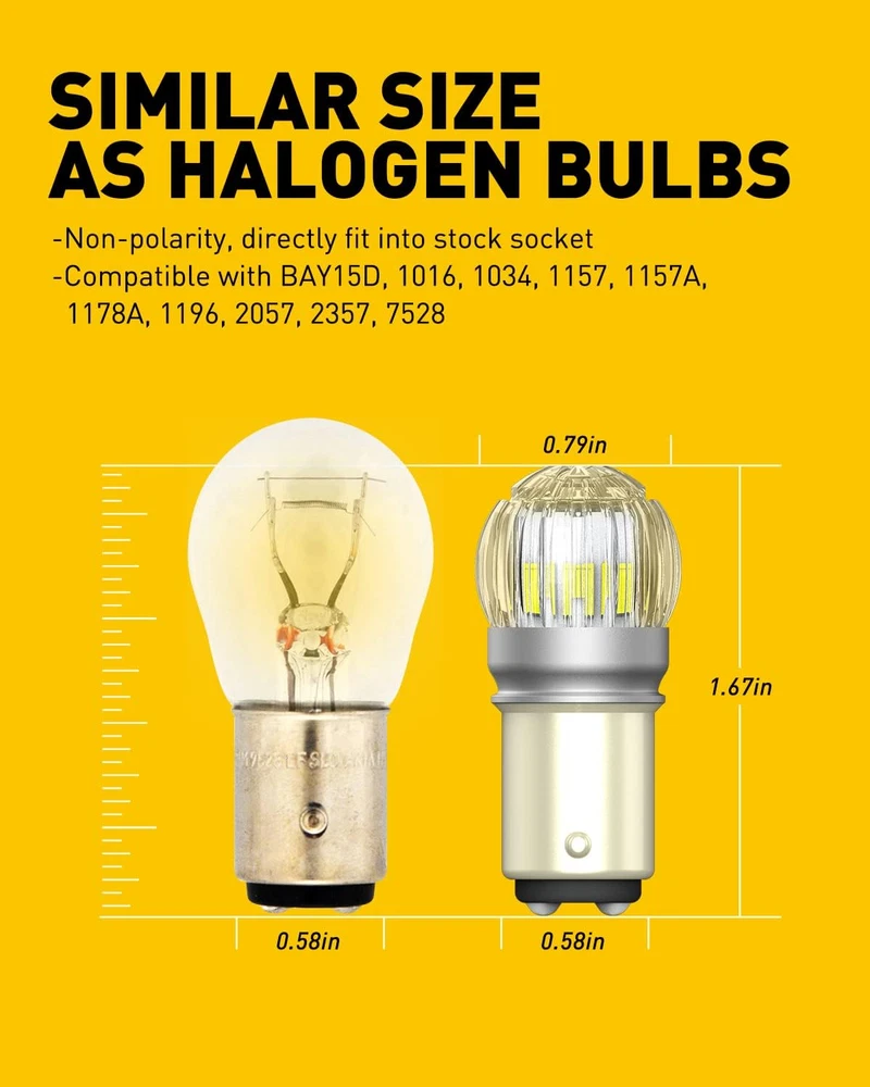 Store New Arrivals Add to Favorite View Feedback Contact 1157 LED Bulb White, 400% Brighter 1:1 Size, 7528 2057 2357 BAY15D LED Lights for Reverse Backup Light, Tail Light, Brake Signal Light, DRL, Pack of 2 Description Item Package Quantity 1 Light Source Type LED Color Temperature 6000 Kelvin Color White Mirror Lighting Type automotive-exterior-tail-light-bulbs Wattage 7 watts Manufacturer Part Number -US6T1157W2 Specific Uses For Product Backup reverse light, day time running light, brake turn signal tail light, side marker light Item Weight 1.13 ounces Voltage 12 Volts Auto Part Position Rear Operating Life 30000 Hours Package Dimensions 3.66 x 2.76 x 1.06 inches Size 1157/2357 【Awesome Pattern & Full Brightness】AUXITO design those 1157 white led bulbs with scientific theory with almost 1:1 shape and same light emitting point. Giving 6000K fuller light in your lens, more stylish and clean 【Ultra Bright & Safer Upgrade】 AUXITO 1157 led bulbs white utilize newest powerful and high quality 3030SMD led chips. Generating 400% brighter output and larger lighting area than halogen, see more clearly when reversing. Keep safe 【Directly Fit & Multi Application】 Non-polarity, auxito 1157 led BULBS are plug and play for stock backup reverse lights, brake lights, turn signal lights, etc. Compatible with socket BAY15D 1016 1034 1157 1157 1178 1196 2057 2357 2357NA 2397 3496 7528 94, etc. 【Stable Use & Longer Lifespan】 Hidden hollow-carved and aviation grade aluminum body, expediting the heat dissipation of the led white 1157. With special PC lampshade protecting led chips and components, those 1157 led can work up to 30,000 hours 【Specification & Note】Voltage: DC 12V. Power: 7W/Bulb. Lumen: 3200LM/Pair. Color: White. Pls note: The bulbs are error free when used as reverse backup light. The 50W 6ohm load resistors or flash relay may be required when use them for turn signal blinker light. Message AUXITO if you need any help Product Description Why I CHOOSE AUXITO 1157 BAY15D 2057 7528 LED BULBS? 360 ° illumination Instant bright light with no delay. Provide your dim halogen light with 6000K cool white Super Brighter AUXITO BAY15D LED bulbs adopt newest and high light SMD LED chips. 300% brighter than halogen bulb LED Chip Cover Specially designed with high quality led chip cover, protecting led chips and components, safer and more stylish Built-in intelligent IC driver Wide operating voltage protection and temperature control. Ensure stable performance and longer lifespan Product Dimension Those 7528 led bulb is with similar size as halogen bulbs. Non polarity socket, install in few minutes Exquisite Packaging These 1157 LED bulbs come with exquisite package box, protecting the LED bulbs from squeezing and collision, ensure you get the bulbs intact AUXITO 1157 BAY15D 2357 LED BULBS Voltage: DC9-18V Power: 7W Application: Backup reverse lights, tail lights, brake lights, turn signal lights, DRL, etc Fits: 1157 BAY15D 1016 1034 1157 1157A 2057 2057A 2357 2357A 2357NA 2397 3496 7528 Notes: The 50w 6ohm load resistors or flash relay may be needed to avoid error code or hyper flash issue when use as turn signal or brake light No more darkness when reversing. Much brighter to be aware when turning signal ABOUT US We offer the best prices around on high quality products. Our E-store includes media such as books, movies, music and games while offering electronics, toys, sporting apparel, clothing, tools, general home, garden items and more. SHIPPING We are always working hard to ensure your package arrives as soon as possible. Please understand that some factors like weather, high postal traffic, and the performance of shipping companies are outside of our control. We offer free shipping to the lower 48 states and ship within 2 business days of payment, usually sooner. We do not accept P.O. Boxes. Please provide a physical address. For shipping outside of the continental USA, we only use eBay's Global Shipping Program.The item is shipped to KY and then sent to the rest of the world. International customers are responsible for all duties and taxes. Continue to check out in order to calculate costs for shipping the item to your country. Messages regarding eBay's Global Shipping Program MUST be directed at eBay EXCLUSIVELY. RETURNS We offer a 30-Day Return Policy on items which you are not completely satisfied with. You have the option for a full-refund or an exchange of the item. No returns are available on items shipped outside of the USA. PAYMENT We accept PayPal. CONTACT US This page content is yet to come Please ad us to your favorite seller and visit again later Thank You CUSTOMER SATISFACTION We try our very best to make sure every customer is completely satisfied. If there's a problem, message us! We're happy to help. WE ACCEPT Copyright © 2021 AutoDS. | All Rights Reserved