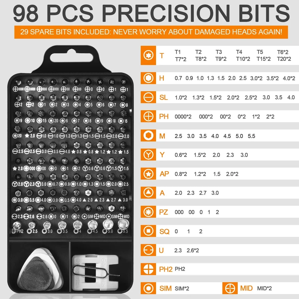 In the hustle and bustle of daily life, have you ever worried about finding the right tool? Ever been stuck with a stubborn little screw? Today, let us present to you - 115-in-1 multifunctional screwdriver set, your problem-solver and your best partner in precision life. 【One thing with multiple uses, precision down to the smallest detail】 From TVs and air conditioners to mobile phones, cameras, and even your car, this set of tools covers 117 different types of screw heads to meet your daily disassembly, assembly and maintenance needs for all equipment. Whether it is a simple repair of home appliances or a delicate operation of digital products, we can easily handle it and solve it perfectly. 【Professional combination, excellent quality】 Made of chromium vanadium alloy, the hardness is as high as 55-60HRC, ensuring that every twisting is accurate. The magnetic handle design prevents the screws from falling off, and the aluminum alloy extension rod combines hardness and flexibility to make your operation more stable and reliable. 【Detailed care, considerate accessories】 The set includes an extension pole with moderate hardness and softness, suitable for operation in narrow corners; anti-static power tweezers and anti-slip silicone handles, providing thoughtful consideration for various occasions. There is also a professional storage box. The PP material is sturdy and durable, the internal space is reasonably planned, and the accessories are arranged in an orderly manner. It is easy to carry and more secure to use. The 115-in-1 multifunctional screwdriver set is more than just a tool, it is a powerful assistant in your life and the embodiment of the pursuit of precision and perfection. Choosing it means choosing an efficient, convenient and reliable life. Take action now and make every corner of your life full of possibilities. Bit Included Specification Triangle:2.0, 2.3, 2.7, 3.0 Pozidriv :PZ000, PZ00, PZ0, PZ1, PZ2 Mini Hexagon Socket :M2.5, M3.0, M3.5, M4.0, M4.5, M5.0, M5.5 Phillips:PH0000*2, PH000*2, PH00*2, PH0*2, PH1*2, PH2*2 Hexagon:H0.7, H0.9, H1.0, H1.3, H1.5, H2.0, H2.5, H3.0*2, H3.5*2, H4.0*2 Torx:T1, T2, T3, T4, T5, T6*2, T7*2, T8*2, T9*2, T10*2, T15*2, T20*2 U-Type:U2.3, U2.6*2 Square:SQ1, SQ1, SQ2 Pentalobe:0.8*2, 1.2*2, 1.5, 2.0*2 Y-Type:Y0.6*2, Y1.5*2, Y2.0, Y2.3, Y3.0 Schlitz:SL1.0*2, SL1.3*2, SL1.5*2, SL2.0*2, SL2.5*2, SL3.0, SL3.5, SL4.0 Special Type:SIM*2, MID*2, P