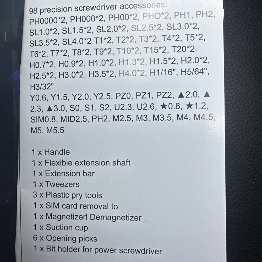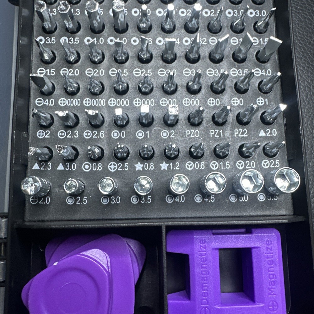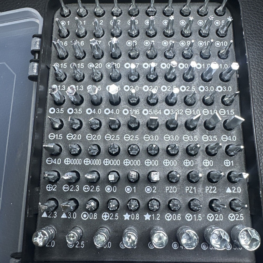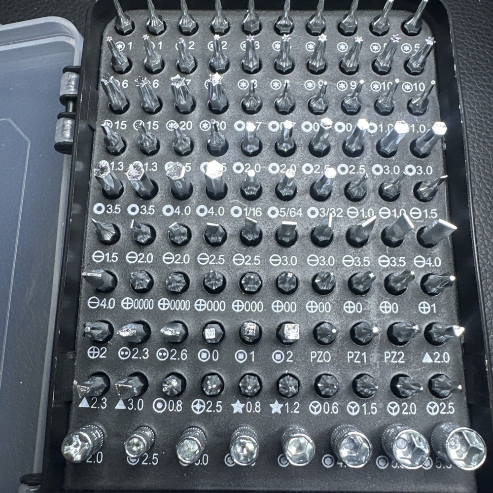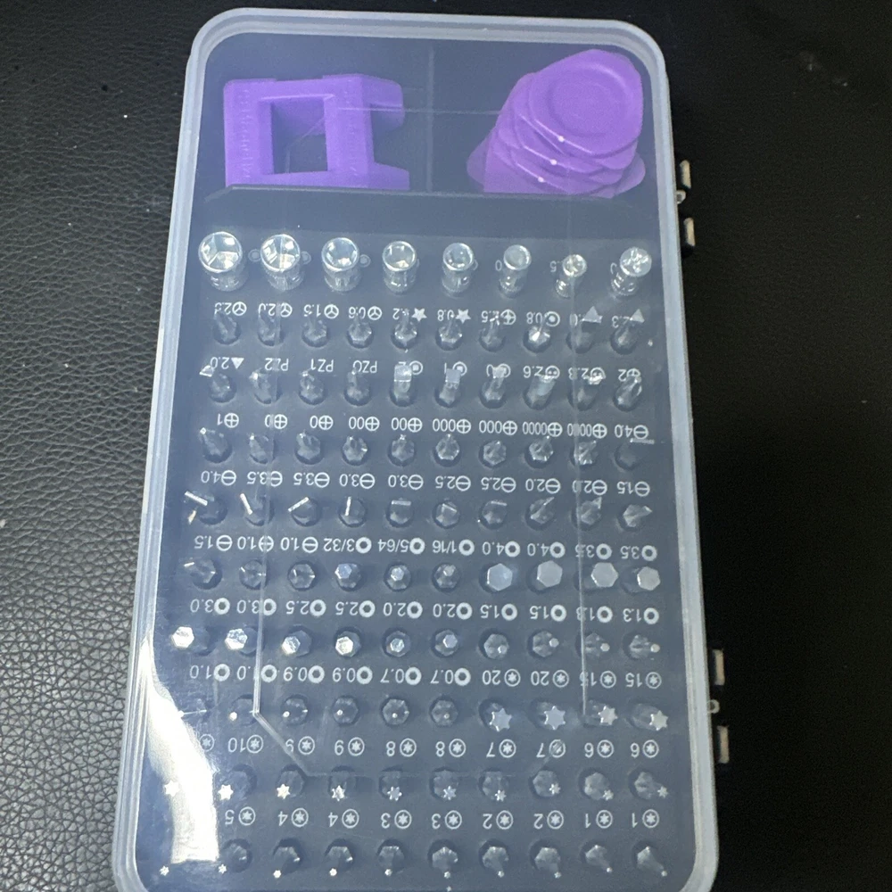 Features: Magnetic Country/Region of Manufacture: China Number of Pieces: 115 Manufacturer Warranty: None Brand: Unbranded Color: Black and purple Star Size: T1 -T15 Material: Chrome Vanadium Steel, Plastic System of Measurement: Metric/Standard Model: Precision Set Type: Screwdriver MPN: None Drive Type: Mixed Set