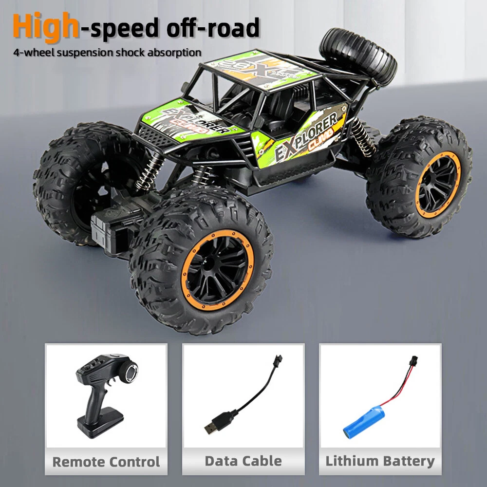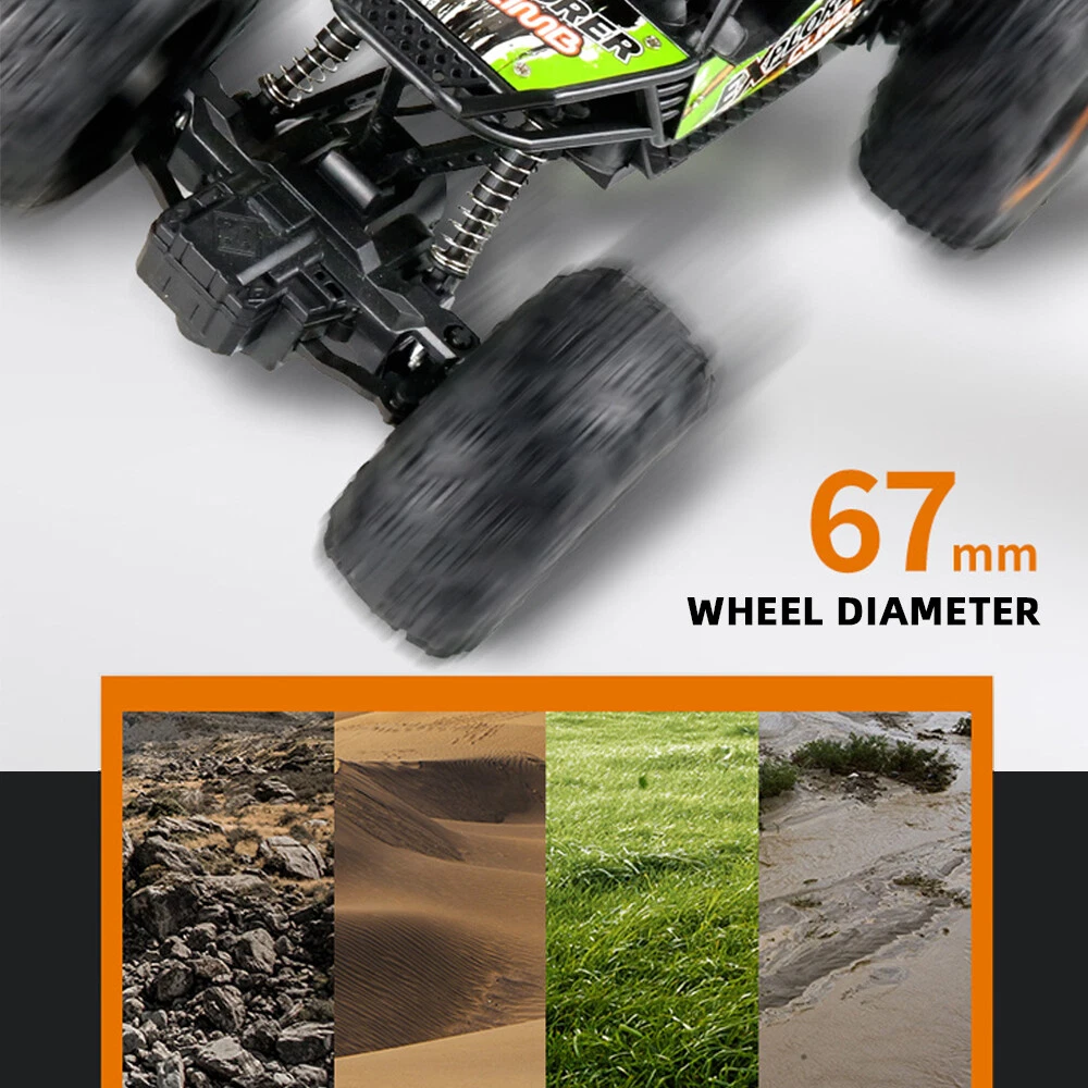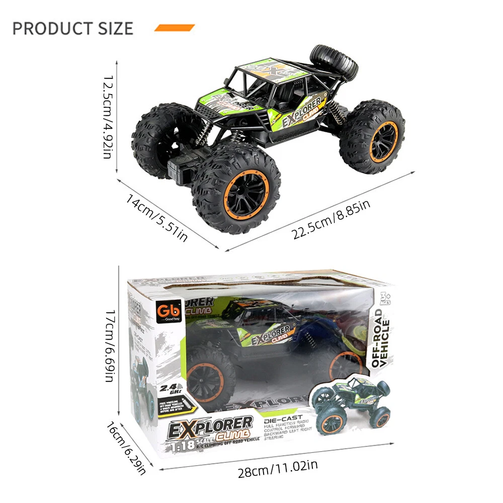 About this item Powered with superb and fast brushed RC 380 motor in unceasingly efficient drivetrain , this 4WD rc trucks Rampage speeds topping to 36 KPH, which finds operators in marvelous enjoyment. All is fulfilled in hobby class design with classic ball bearings, solid gear diff., independent suspension. This rc monster truck is durable, speedy, funny and yet affordable, which is advisable to be toys gifts for boys and adults. 2.4GHz full-function proportional radio control system suffices a stable control range within 280 feet. Reliable transmission forward, brake and reverse would never fail. Splash waterproof electronic components make a all-terrain vehicle out of this truck. No worries to run this remote control cars on grassland , sands, and bumpy grounds. Flexible and solid PVC truck body, high grip knobby off-road tires, and equipped with two long-time service 7.4V Li-Po battery packs, and one qualified USB charger, our remote control truck comes in 99% Ready-To-Run version. Specifications: Product size (cm): 22.5*14*12.5cm Body battery: 3.7V 5A 500 mA lithium battery Remote control batteries: 5AA batteries * 2 (not included) Charging time: about 60 minutes Working time: about 25 minutes or so Remote control distance: 40 meters Body ratio: 1:18 Product list : 1x remote c ontrol car 1x handle remote control 1x USB charging cable 1x 3.7V battery