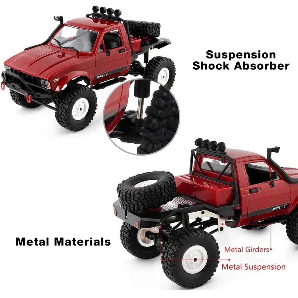 Product Description Features: The car can move to a long distance and satisfied your wish. Functions: go forward, go back, turn left and right. Great strength for the car to move through any rugged road, sand, mud, rock rugged mountain road. Bright Headlamp The car headlight can be lighted. Headlights are wired and quite bright - good for night driving. Full Proportional Control The 2.4Ghz remote control has the functions of high frequency, fast response and long control distance, so that you will not receive radio interference when playing with the remote control car. Big Soft Tires The WPL C14 4WD crawler truck is highly realistic, and it comes with the soft tires for all terrain. On Oct 22, 2024 at 03:17:24 PDT, seller added the following information: On Jan 2, 2025 at 03:17:36 PST, seller added the following information: