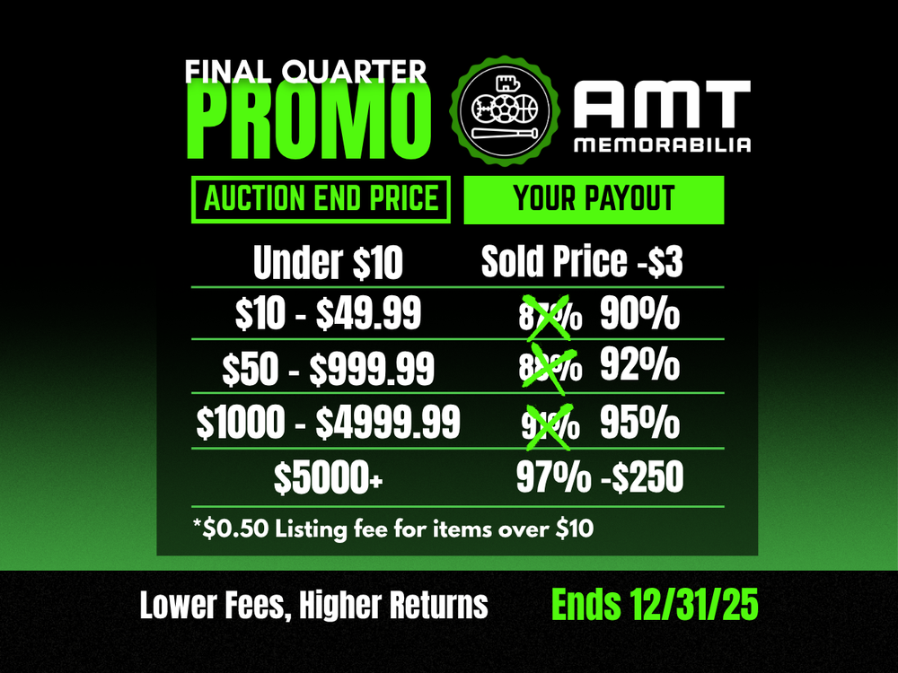 AMT Memorabilia is actively accepting consignment submissions. We offer highly competitive payout rates, and your items will be showcased to our 25,000+ eBay followers. Please feel free to reach out for more information! This listing is for the item listed in the photo and picture above. Payment is due within 7 days of auction ending. Item Condition: All listings feature high-quality front and back photos so you can review the exact card you'll receive. Cards are photographed inside a penny sleeve and/or top loader for protection any visible marks or debris are typically on the holder, not necessarily the card itself. All raw listings are to be considered a PSA/SGC/BGS 7 OR HIGHER. Shipping - United States: For buyers located in the United States, shipping charges start at $5.50 for 1 item. Each additional raw card purchased will have an additional $0.25 charge to the shipping charges. Additional graded cards will have a $0.50 charge. Lot shipping will begin at $6.00 and each additional lot will be 0.25 per card (8 card lot will be an extra $2.00 to ship) Shipping - International: For buyers located overseas, shipping charges for 1 item will be shown to you based on your location. These initial shipping charges vary depending on your location. Each additional raw card purchased will have an additional $0.50 charge to the shipping charges. Additional graded cards will have a $2.00 charge. Want us to sell YOUR ITEMS? AMT is actively accepting consignments on all sports cards, trading cards, certified memorabilia, and other collectibles. Check out our fee structure in the listing photos above! The rates shown are the only fees you pay! Our fees are based on the FINAL SALE PRICE on eBay! This means you aren't pay double fees, just one simple fee shown! We take care of everything: Scanning, Listing, Shipping and Packing with our own supplies! You do NONE of the work and can pay less in fees! Its hassle-free selling, made simple!
