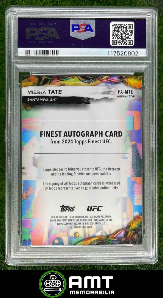 Parallel/Variety: Finest Autographs Refractors Year: 2024 Manufacturer: Topps Sport: MMA Grade: 10 Season: 2024 League: N/A Autographed: Yes Card Number: FA-MTE Player/Athlete: Miesha Tate Professional Grader: Professional Sports Authenticator (PSA) Set: Finest UFC