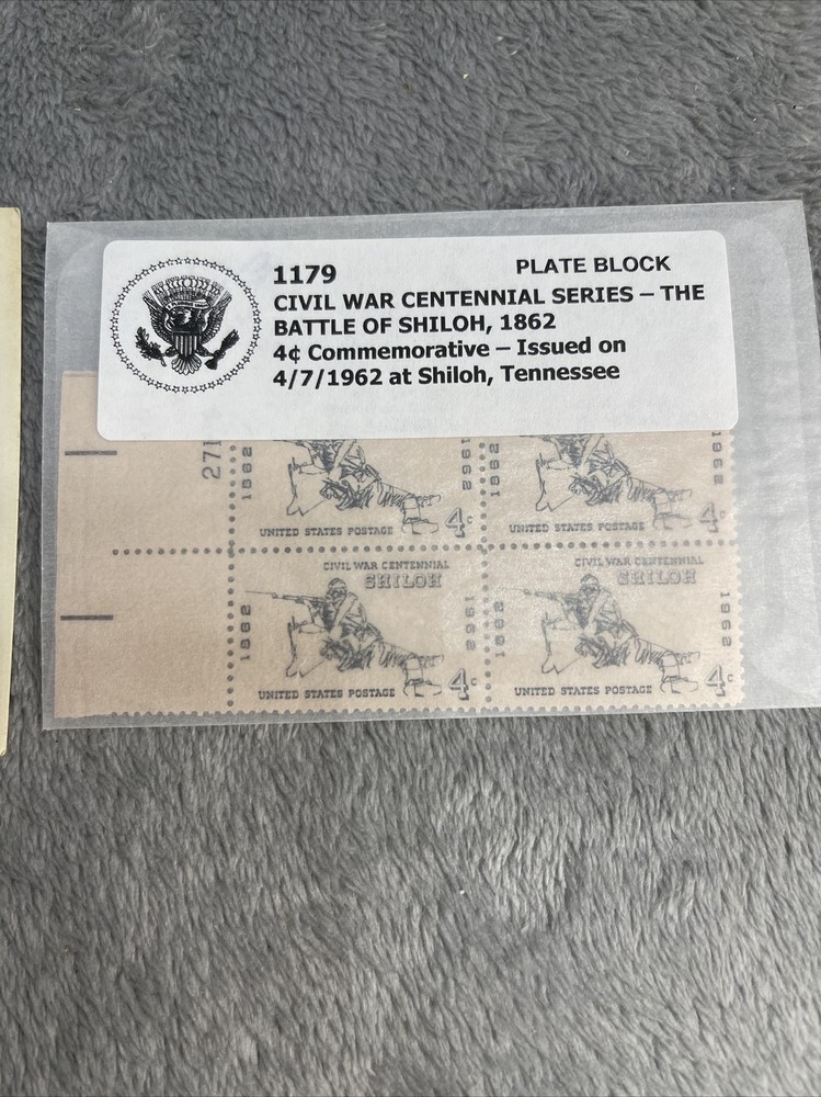 Up for sale is a plate block and single stamp commemorating the American Civil War Centennial. The stamp depicts the Shiloh battlefield and is in mint never hinged condition. The plate block includes four 4-cent stamps and also features the same design as the single stamp. Both items are from the United States and were issued in 1962 with a face value of 4 cents each for a total of 20 cents. The color of the stamps is black and peach blossom. Although ungraded, these items are of high quality and come with no certification.