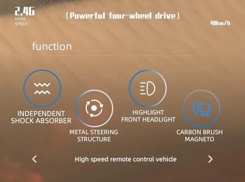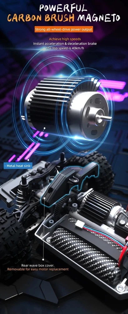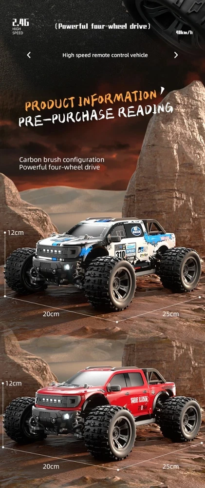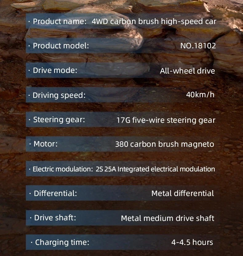 This 1:18 scale remote control vehicle is a high-speed monster truck that's ready to go right out of the box. With a brushed motor and electric fuel type, it can reach speeds up to 28km/h. It has a 4WD drivetrain and is designed for off-road use, making it perfect for hobby-grade enthusiasts. The truck features a multi-color design made of durable plastic, and is suitable for ages 8 and up. Whether you're a kid or an adult, this RC vehicle is sure to provide hours of entertainment. 1/18 2.4G Remote Control Vehicle 28km/h High Speed 4WD Off-road Electric Is Electric-lithium battery State of Assembly-Ready-to-Go Flight Time-about 35-40mins Tire Track-155mm Wheelbase-165mm Remote Distance-more than 80M Scale-1:18 Dimensions-25*19*11cm Model Number-18102 Package Includes Original Box,Batteries,Operating Instructions,Remote Controller,USB CABLE Material-Metal,Plastic Body Battery-7.4V 1500mAh lipo- Charging time-about 180-210 mins Remote Control Battery-3*AA (Not Included) Motor-RC380 high speed carbon brush strong magnet (magnetic protection ) 25A 2S integrated control (splash-proof)