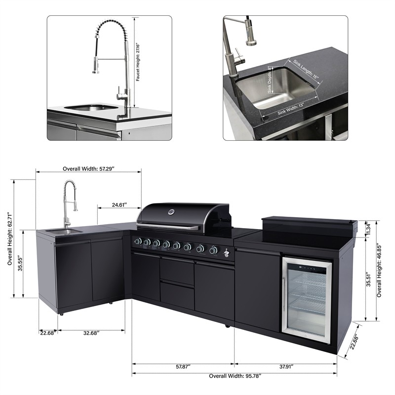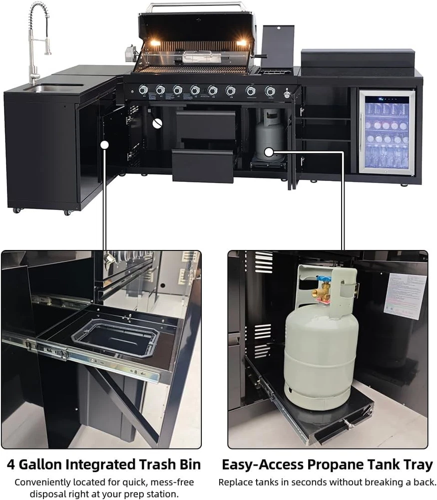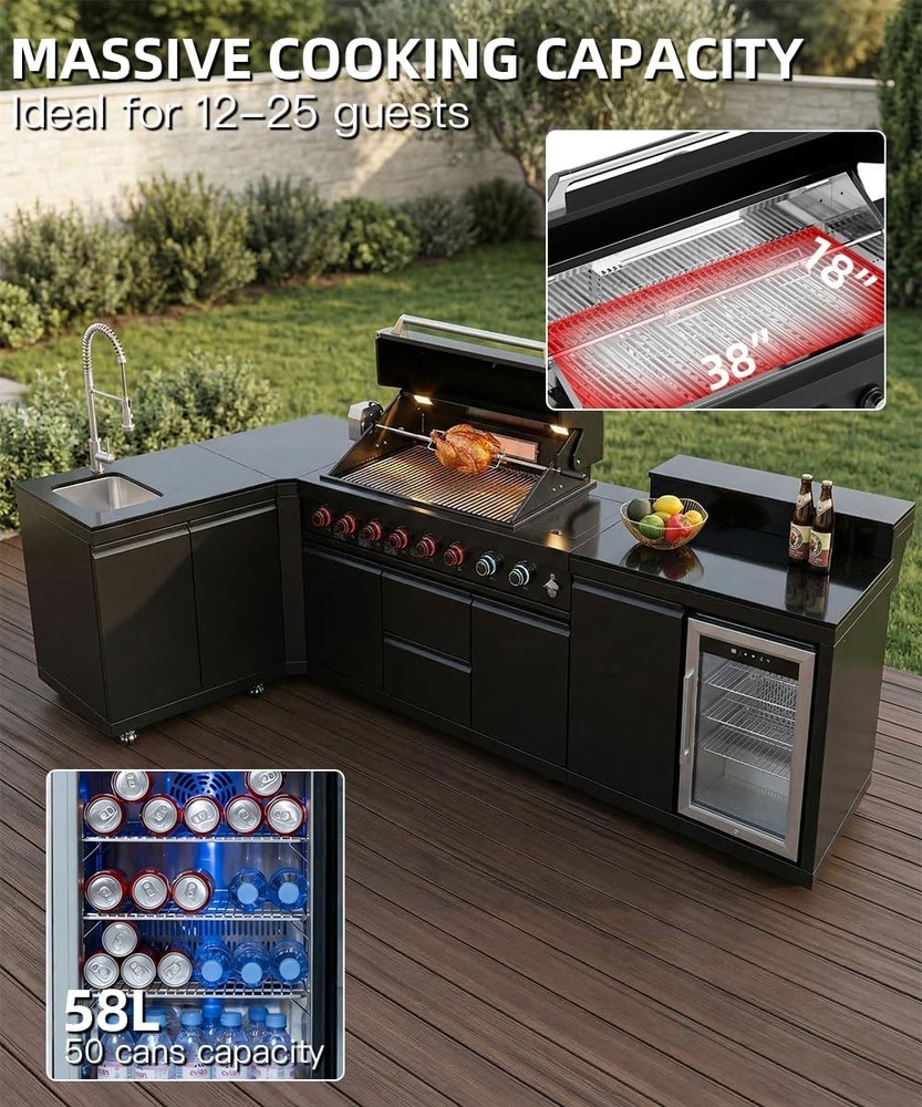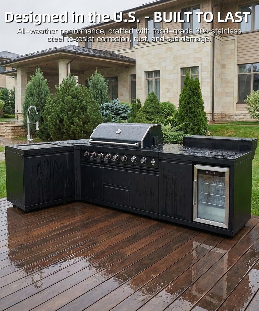 6-Burner 99000 BTU Deluxe Stainless Steel Gas Outdoor Kitchen Bar Barbecue Island Grill + sink with double-door storage cabinet bar counter + Refrigerator + Three-Tier Corner Cabinet Product Features Multifunctional Outdoor Kitchen Island —Combines grilling, refrigeration, dishwashing, and food prep space into a 118-inch-long island countertop. Perfect for backyard barbecues and family gatherings, it delivers a complete outdoor cooking experience. Powerful Heat and Professional Grilling Zone — Equipped with six burners delivering a total heat output of 99,000 BTU and a rotisserie kit, it allows you to quickly sear steaks, roast whole chickens, or cook multiple dishes simultaneously, easily accommodating gatherings of 15 or more people. Premium Materials, Built to Last —Constructed from 304/430 stainless steel with a granite countertop, it offers rust resistance, durability, and easy cleaning while maintaining a stylish, professional appearance in outdoor settings. Versatile Configuration, Conv enient and Practica l —Features an outdoor-grade refrigerator/wine cooler, a stainless steel sink with a faucet, and ample storage cabinets to keep beverages, ingredients, and tools organized and readily accessible. Designed for backyard gatherings —featuring a modular design with casters on the base of each component, allowing for easy movement to the garden or patio. Installation is simple; pre-assembled modules can be connected with just basic tools, saving hours of tedious setup work. Specifications Primary Material: Premium 304 Marine-Grade Stainless Steel Countertop: 5mm Brushed Stainless Steel (Main) & Elegant Granite (Side) Color: Black Stainless Steel Overall Dimensions (Assembled): 118" L x 55" W x 47" H Product Weight: 840 lbs Grate Material: 8mm Stainless Steel Rods Burner Configuration: 4 Main Tubular Stainless Steel Burners + 1 Rear Ceramic Infrared Burner Total Heat Output: 99000 BTU Fuel Type: LPG (To use natural gas, a conversion kit is required. Contact us for details.) Ignition: Electronic Voltage: 120V Included Features: Pull-out propane tank tray, 120V heavy-duty rotisserie (holds 25 lbs), warming rack, hood temperature gauge, halogen cooking lights, control knob indicator lights. Certifications: CSA, ETL, ISO9001, BSCI certified. Packaging: 5 separate wooden crates Product description Previous page The heart of every party—large-scale grilling for the whole family. Next page 1 Family Gathering 2 Essential for Garden 3 Perfect Match Payment 1. We accept paypal and all forms of credit card. 2. Payment is required to be made within 7 days of ordering to avoid a UPI case. Shipping 1. All items are dispatched from our demostic warehouse in CA, GA or NJ, America. 2. Under normal conditions, delivery will take between 3 and 8 working days after dispatch, depending on your location. Remote areas will required longer delivery time. 3. If you're given a tracking number, please use it to track the delivery status of your order. We regret that our warehouse is not accessible to the public. As such, we don't offer a pick-up option. 4. Please note: Some products maybe dispatched in more than one carton, they may arrive at different time. If you only received partial box please don't worry, contact us and we will tell you where are the rest packages. Returns We accept returns, Please contact our customer service team immediately if: 1. You changed your mind and wish to request a return; 2. Your product was damaged during transit; 3. You wish to make a warranty claim for any product you have purchase; 4. You're not satisfied with any product that you have purchased. Please note all returns must be directed to through Customer Service, please do not return or post items before obtaining instructions from us. If you do, there is a risk that your returned item may not be identifiable and accepted. Applicable freight fees will be deducted from your refund incases where you changed your mind and wish to return the product. This also applies to order cancelled while in transit.