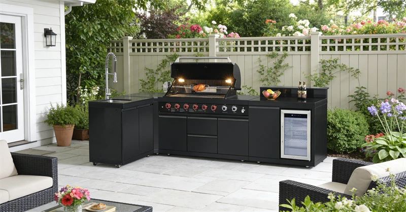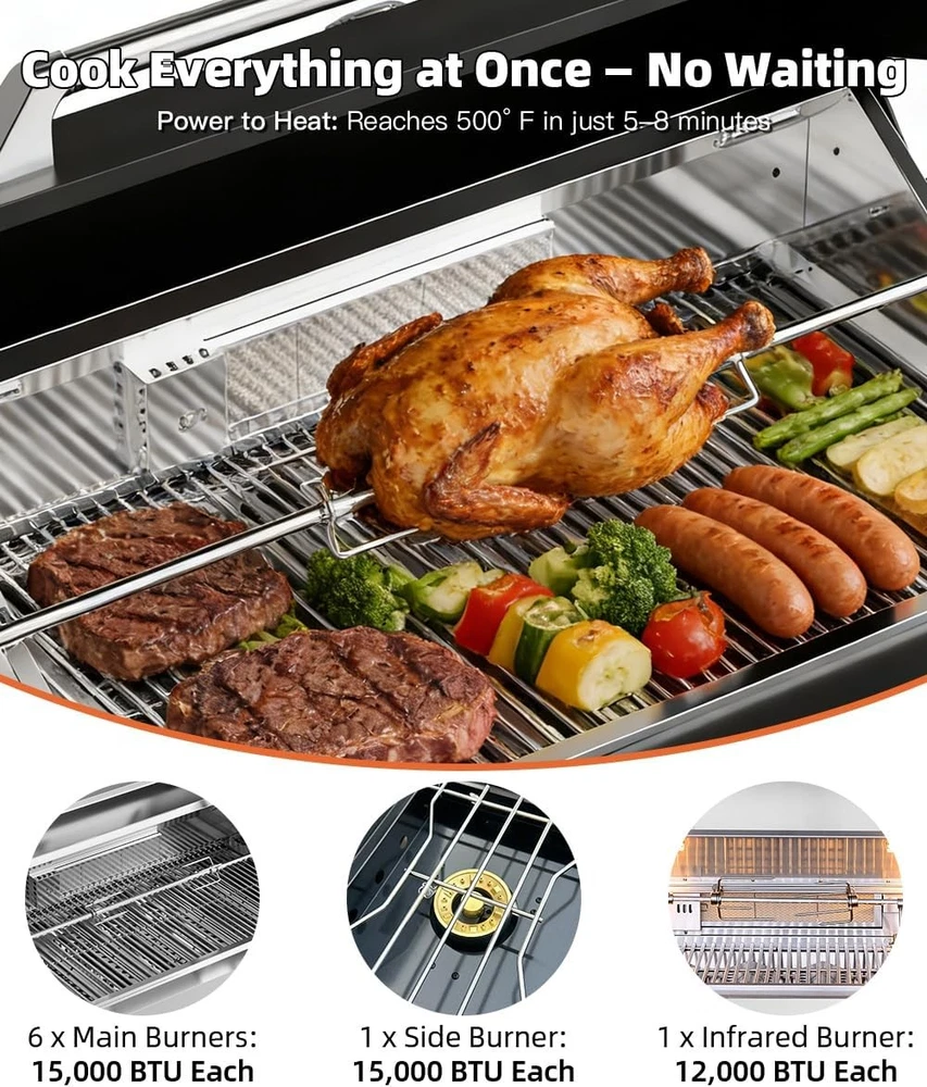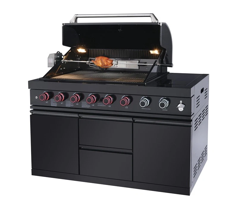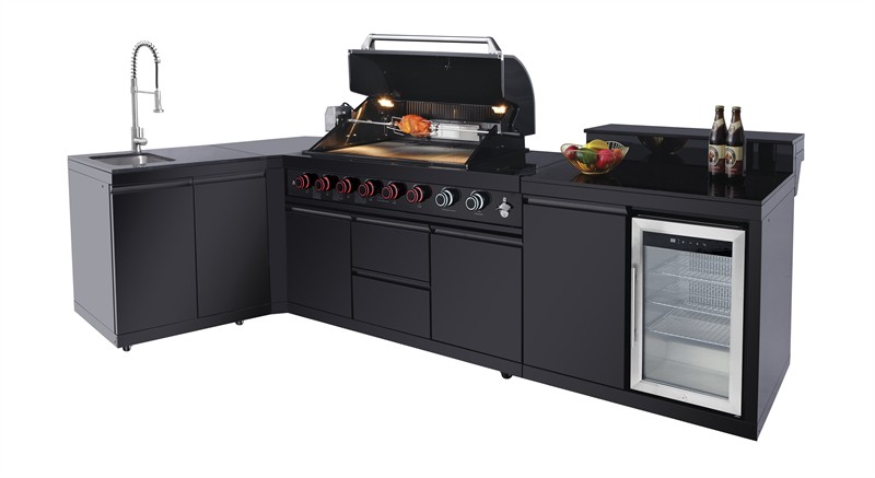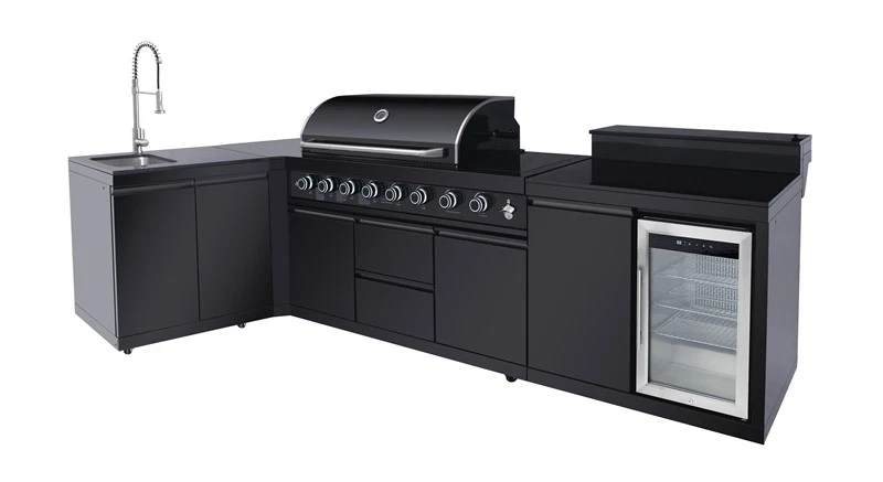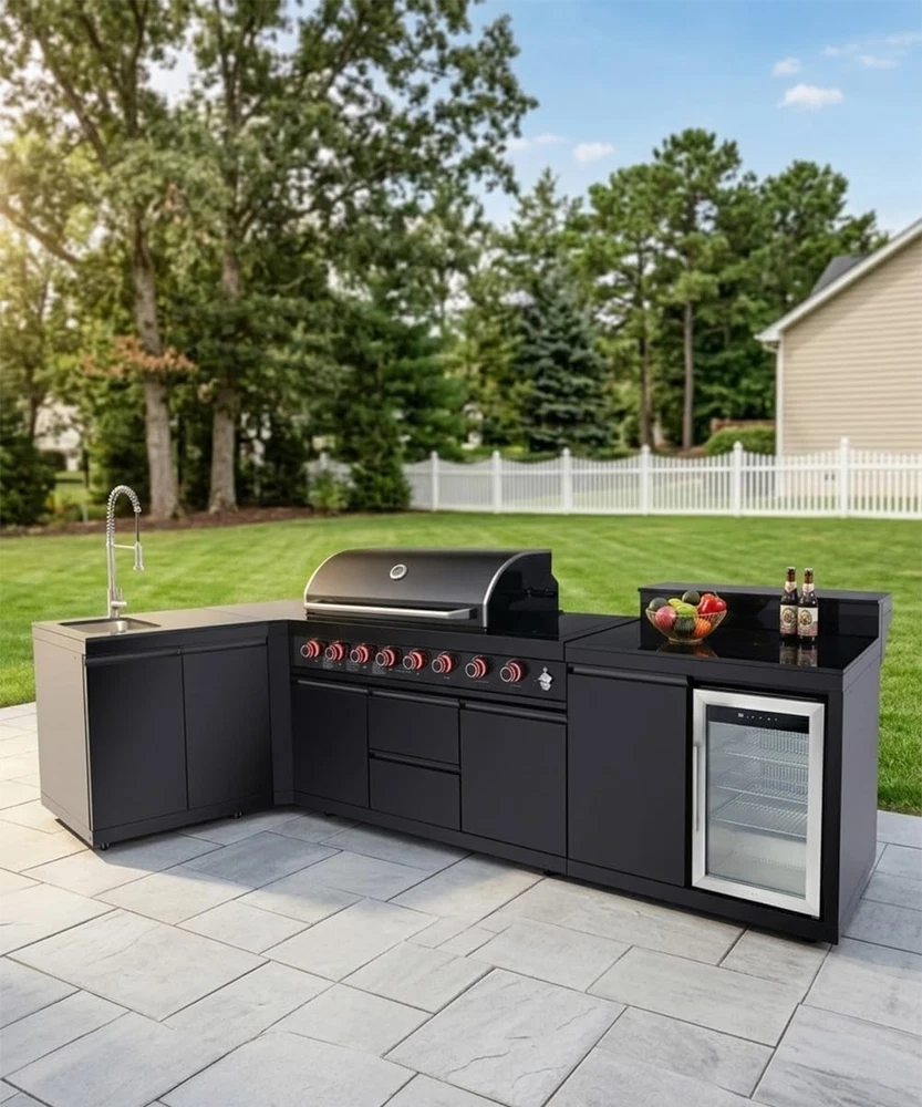 6-Burner 99000 BTU Deluxe Stainless Steel Gas Outdoor Kitchen Bar Barbecue Island Grill + sink with double-door storage cabinet bar counter + Refrigerator + Three-Tier Corner Cabinet Product Features Multifunctional Outdoor Kitchen Island —Combines grilling, refrigeration, dishwashing, and food prep space into a 118-inch-long island countertop. Perfect for backyard barbecues and family gatherings, it delivers a complete outdoor cooking experience. Powerful Heat and Professional Grilling Zone — Equipped with six burners delivering a total heat output of 99,000 BTU and a rotisserie kit, it allows you to quickly sear steaks, roast whole chickens, or cook multiple dishes simultaneously, easily accommodating gatherings of 15 or more people. Premium Materials, Built to Last —Constructed from 304/430 stainless steel with a granite countertop, it offers rust resistance, durability, and easy cleaning while maintaining a stylish, professional appearance in outdoor settings. Versatile Configuration, Conv enient and Practica l —Features an outdoor-grade refrigerator/wine cooler, a stainless steel sink with a faucet, and ample storage cabinets to keep beverages, ingredients, and tools organized and readily accessible. Designed for backyard gatherings —featuring a modular design with casters on the base of each component, allowing for easy movement to the garden or patio. Installation is simple; pre-assembled modules can be connected with just basic tools, saving hours of tedious setup work. Specifications Primary Material: Premium 304 Marine-Grade Stainless Steel Countertop: 5mm Brushed Stainless Steel (Main) & Elegant Granite (Side) Color: Black Stainless Steel Overall Dimensions (Assembled): 118" L x 55" W x 47" H Product Weight: 840 lbs Grate Material: 8mm Stainless Steel Rods Burner Configuration: 4 Main Tubular Stainless Steel Burners + 1 Rear Ceramic Infrared Burner Total Heat Output: 99000 BTU Fuel Type: LPG (To use natural gas, a conversion kit is required. Contact us for details.) Ignition: Electronic Voltage: 120V Included Features: Pull-out propane tank tray, 120V heavy-duty rotisserie (holds 25 lbs), warming rack, hood temperature gauge, halogen cooking lights, control knob indicator lights. Certifications: CSA, ETL, ISO9001, BSCI certified. Packaging: 5 separate wooden crates Product description Previous page The heart of every party—large-scale grilling for the whole family. Next page 1 Family Gathering 2 Essential for Garden 3 Perfect Match Payment 1. We accept paypal and all forms of credit card. 2. Payment is required to be made within 7 days of ordering to avoid a UPI case. Shipping 1. All items are dispatched from our demostic warehouse in CA, GA or NJ, America. 2. Under normal conditions, delivery will take between 3 and 8 working days after dispatch, depending on your location. Remote areas will required longer delivery time. 3. If you're given a tracking number, please use it to track the delivery status of your order. We regret that our warehouse is not accessible to the public. As such, we don't offer a pick-up option. 4. Please note: Some products maybe dispatched in more than one carton, they may arrive at different time. If you only received partial box please don't worry, contact us and we will tell you where are the rest packages. Returns We accept returns, Please contact our customer service team immediately if: 1. You changed your mind and wish to request a return; 2. Your product was damaged during transit; 3. You wish to make a warranty claim for any product you have purchase; 4. You're not satisfied with any product that you have purchased. Please note all returns must be directed to through Customer Service, please do not return or post items before obtaining instructions from us. If you do, there is a risk that your returned item may not be identifiable and accepted. Applicable freight fees will be deducted from your refund incases where you changed your mind and wish to return the product. This also applies to order cancelled while in transit.