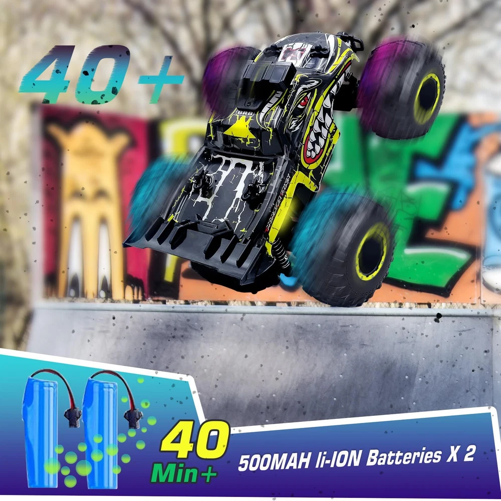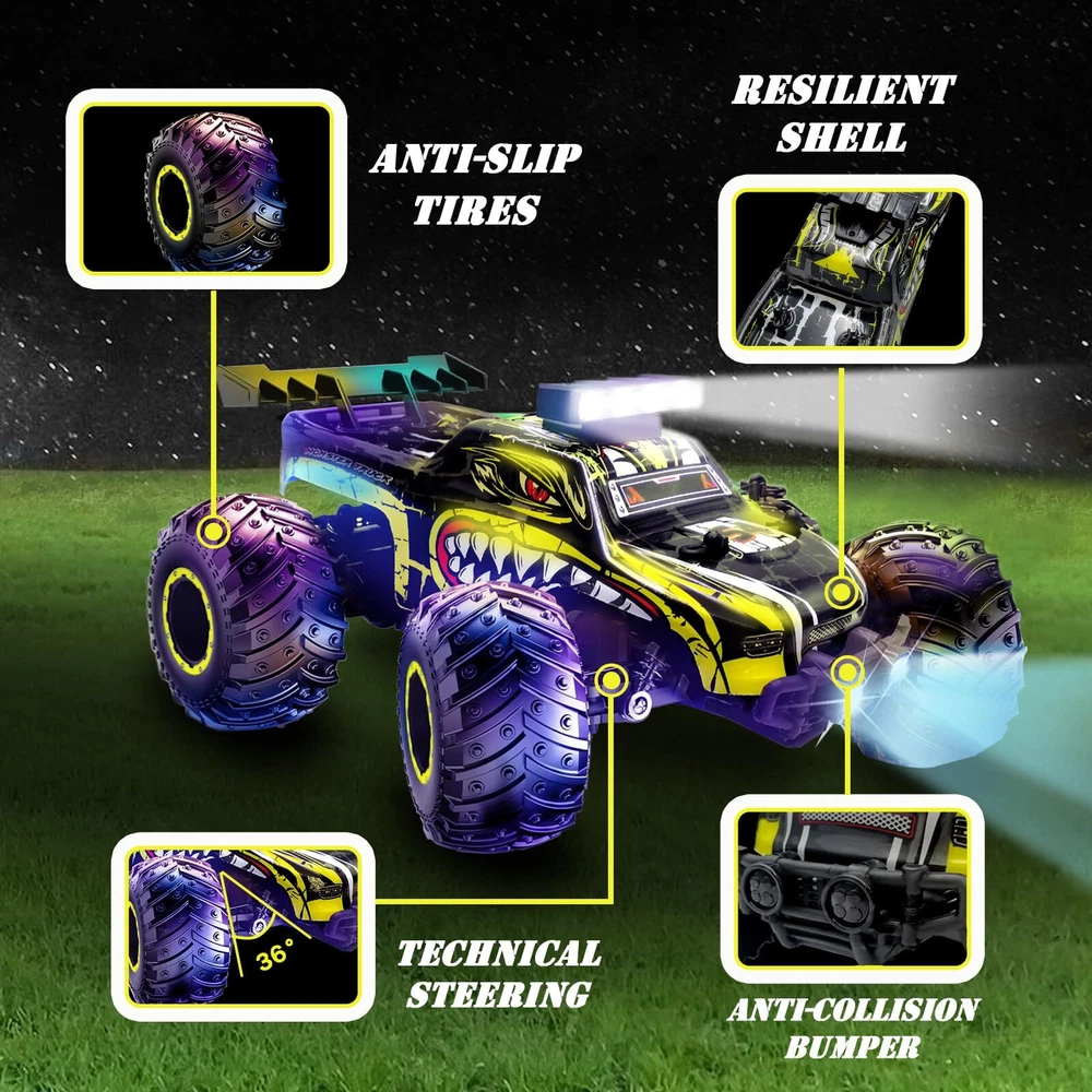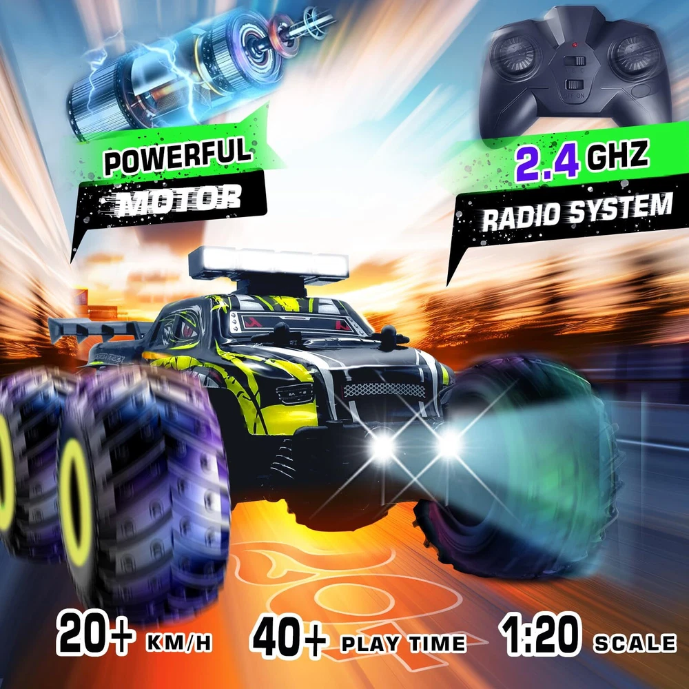1:20 Super RC Car: This remote control car is powered by 260 strong magnetic motors and powerful 3.7 battery with a speed of 20KM/H, making you more competitive in racing. You can easily drive the rc truck on grass, rocks, sand, concrete roads and other terrains, providing a real off-road racing experience for you and your kids. Anti-Vibration Beyond the Wild: This high-speed rc truck is designed with independent suspension front and rear, and all four wheels are equipped with anti-skid tires and metal shock absorbers, which have good grip and good cushioning effect and help the remote control car keep driving at high speed without rolling over. The monster truck is equipped with anti-collision bumpers at the front and rear to effectively protect the body and frame. 2.4GHz Smart Remote Control: The ergonomically designed handheld 2.4GHz radio remote control has good anti-interference performance, supports multi-vehicle Interference-resistant manipulate, and stable signal transmission makes the remote control car ready to run. The operating range is about 164 feet, and it's fun to race with your kids! Superior Features for Quality and Durability: Made of sturdy, lightweight ABS material and eco-friendly paint, this remote control truck is equipped with classic ball bearings, sturdy drive shafts and a ready-to-run, high-quality gear differential. This RC monster truck is equipped with bright LED headlights and to light up the road ahead while playing at night. Cool LED bodylights add to the excitement! High Performance RC Car Toy : Whether you are new to RC cars or an advanced RC car enthusiast, RC cars are perfect for outdoor or indoor RC adventures. If you're looking for an exciting and extra cool Rc car , you'll love our toy-grade remote control car. Recommended for birthdays, parties and holidays (Children's Day, Christmas, Halloween, Thanksgiving and New Year's Day).