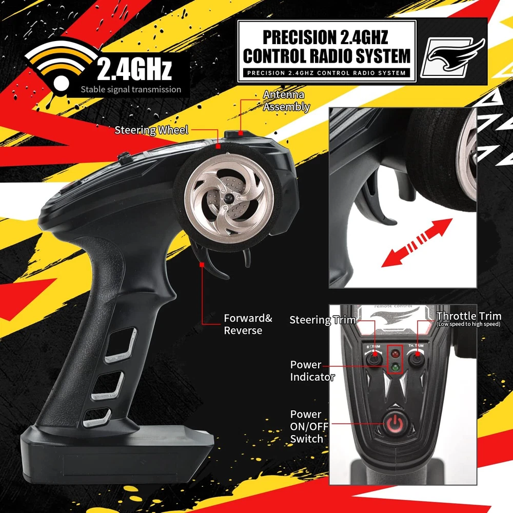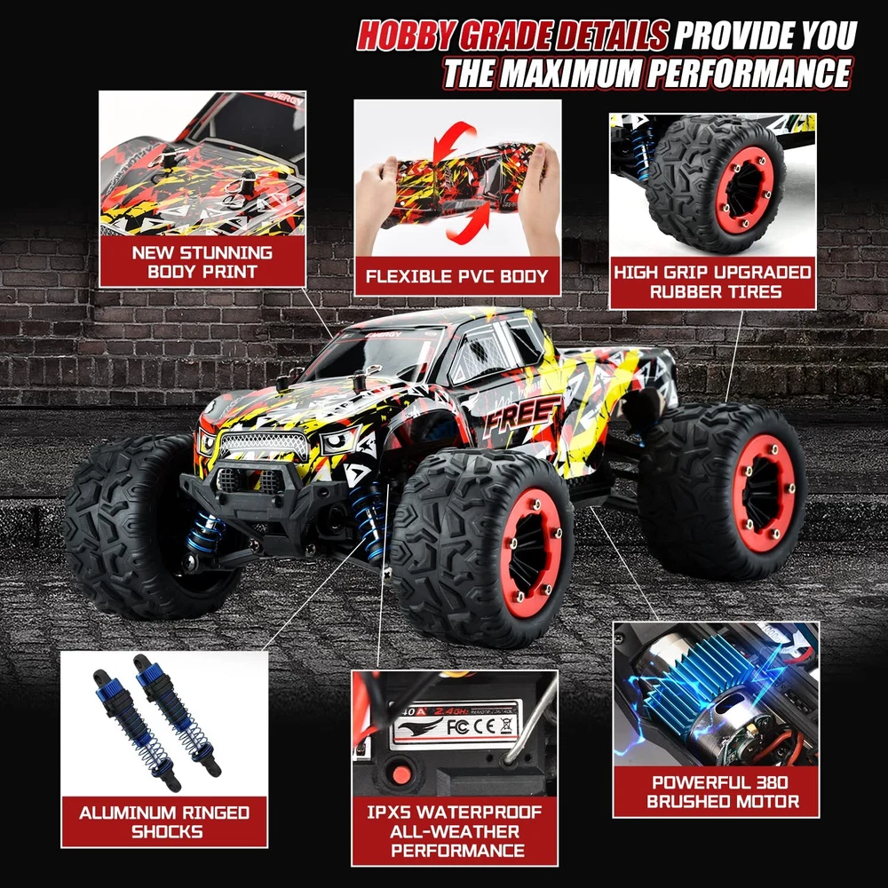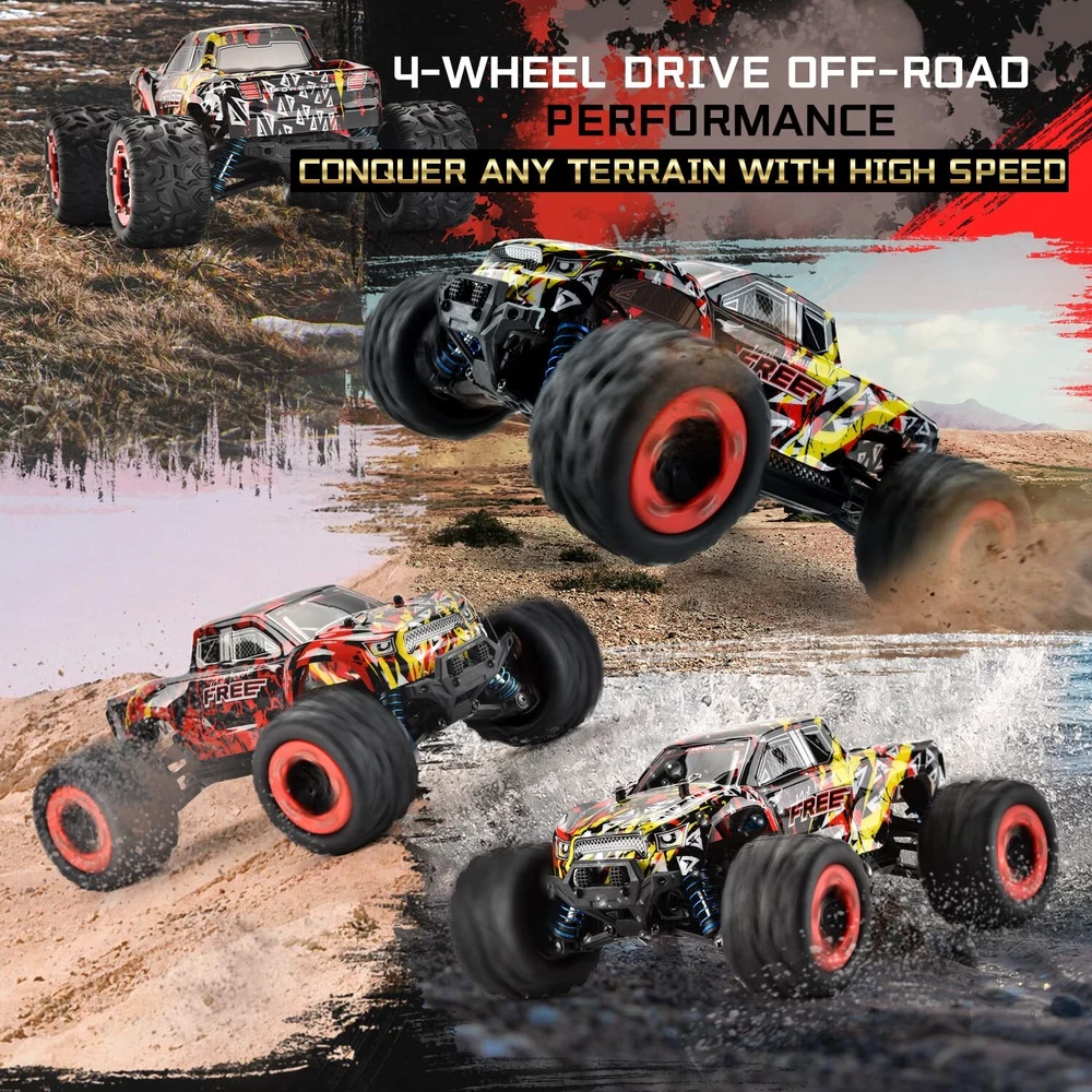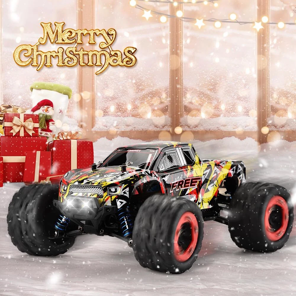 [Improved & Well- Designed RC Car] This 1/18 Scale 4WD remote control car was updated in 2023 and now features independent suspensions, an improved robust modular chassis, a cool LED headlamp, and a well-designed beauty hub metal sheet. Ideal Unique Christmas Gifts for Boys and Girls! [High Speed & 2.4Ghz Radio Control] The off-road RC truck can reach high speeds of 40+ km/h with its superb and quick brushed 380 motor, providing drivers with exhilarating street-bashing delight. The 290-foot steady control range of the 2.4 GHz full function proportional no signal interference radio control system makes it simpler for any level of enthusiast to operate. [Rechargeable Batteries for Extended Fun time] Our monster truck comes in a ready-to-run version that is equipped with classic ball bearings, solid drive shafts, and a high-quality gear differential. It is perfect for RC hobby drivers. The cars are powered by T-plug rechargeable battery packs, extending your racing time to 40 minutes. [Waterproof Electronic Speed Control] This all-terrain remote-control truck features an electronic speed control that is IPX5 splash waterproof and has outstanding off-road performance. The radio-controlled car can be driven on any surface and in any weather over asphalt, smooth dirt, loose gravel, short grass, in the sun or the rain with its 4x4 traction and aluminum-ringed shocks. [High Performance] You may enjoy thrilling drifting, faster cornering, and stunting action because of a powerful drivetrain system, high-quality components, and tires with more grip. This rc car is a great toy for boys and adults alike as it is easy to use, more robust, quick, and funny. [Warm Tips] Be careful not to move the trigger before binding is fulfilled to avoid pairing failure. When the remote control car is not in use, please disconnect the battery from the car in time to reduce battery damage. Any questions, we are always here at your disposal.