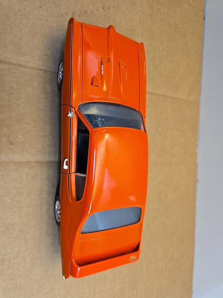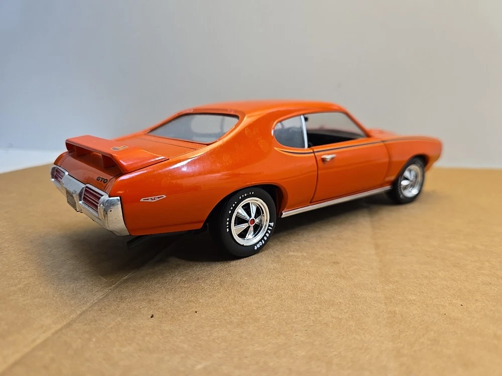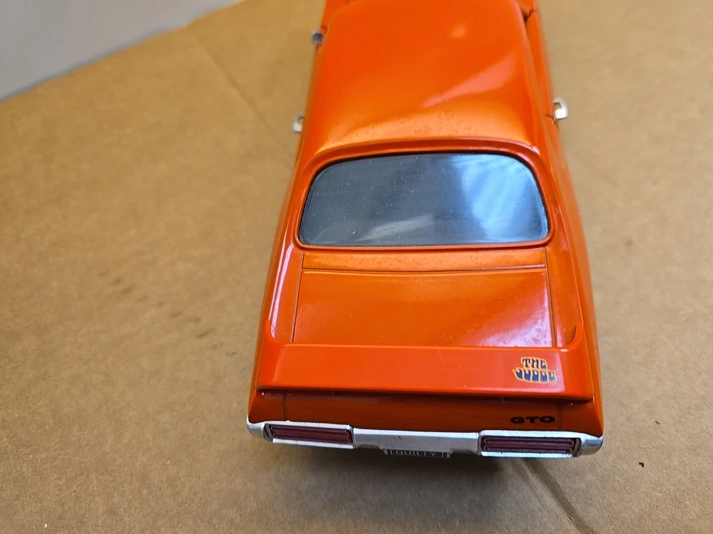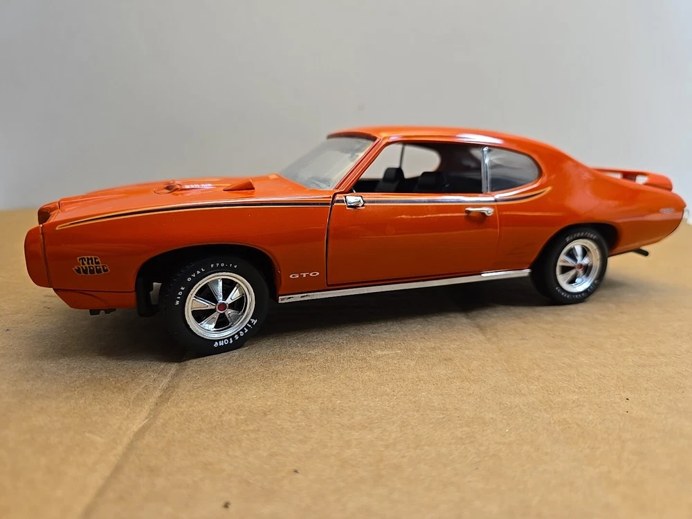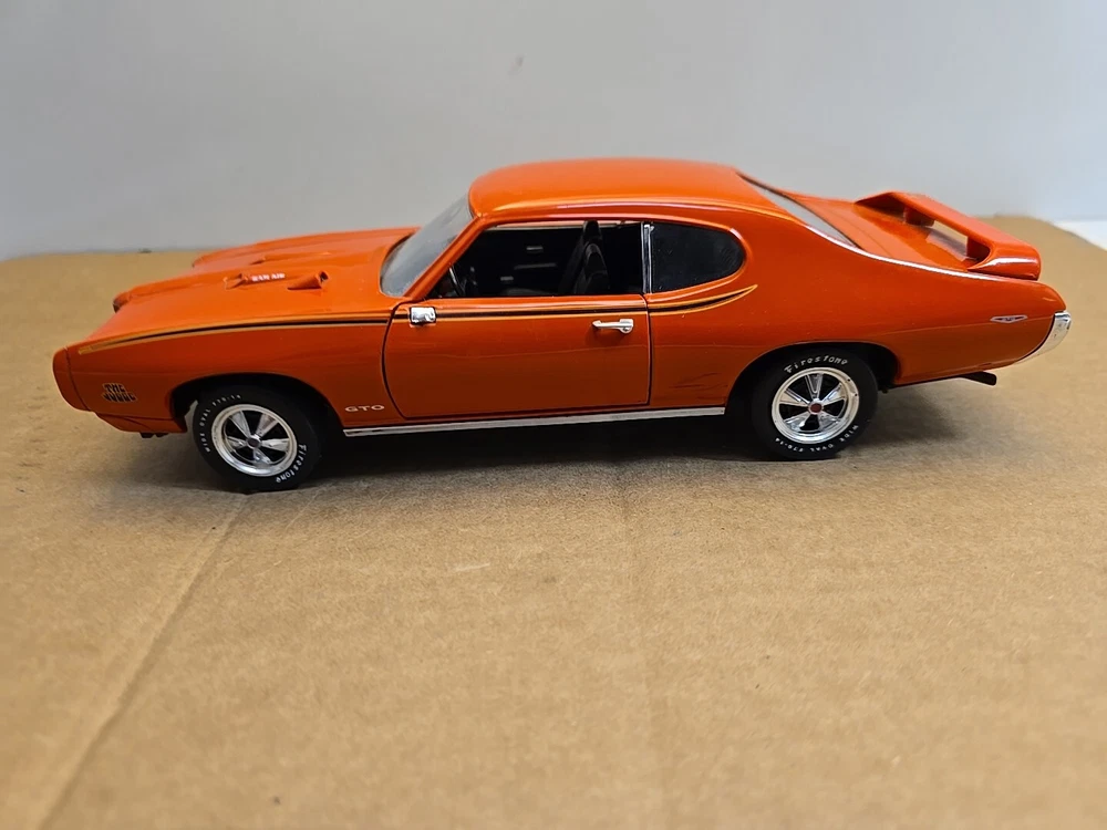 This 1:18 scale diecast model of a 1969 pontiac GTO. It comes with out its original box .No box .this in displayed condition. Littledusty but still very cool in your man cave.driverside door mirroris broken and missing.everthing eles looks ok. So this is being sold as a no box die cast car.comes just as you see it. Please ask any and all questions before purchasing