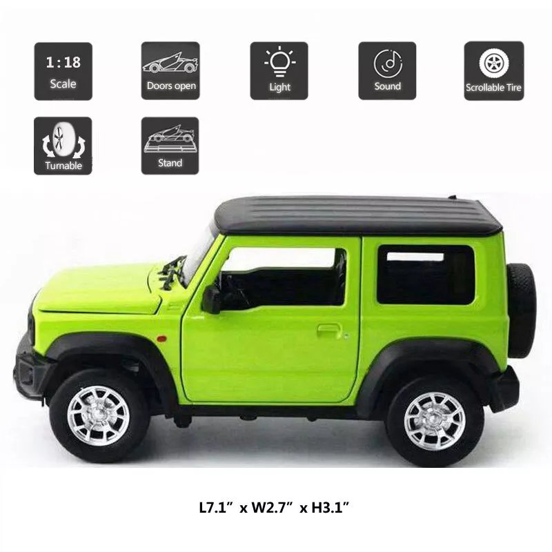 1:18 Scale Suzuki Jimny Model Car Diecast Metal Vehicle Collection for Men Green Item Type Diecast & Toy Vehicles Scale 1:18 Material Diecast and ABS Color Green, as picture shows Dimension About L7.1" x W2.7" x H3.1" (L18.0 x W6.8 x H8.0 cm) Vehicle Type SUV Function *No pull-back function, you need to push forward and backward *Two doors, engine cover and back door can be open *Open the door, it will make sound and light *The front wheels can turn left and right Packing Packed in original color box, in excellent condition Power 3 x AG13/LR44 button cell, power is just for light and sound Tips *Great choice of gift for kids, especially for Birthday, Christmas and New Year Gift *Great item for collector, business gift, home decoration, office decoration, display Warning Don't put in mouth/Keep Away from Fire/Not for Children under 3 Years Notice Due to manual measurement, please allow a little error Package include 1 x 1:18 Scale Suzuki Jimny Model Car (Batteries Not Included) Payment Delivery details Terms of sales Payment We accept paypal only. Delivery details We ship orders within 24 hours upon receipt of payment. Terms of sales We provide great products and service. If you have any problems with the order,please do contact us before leaving negative feedback and opening case on eBay.