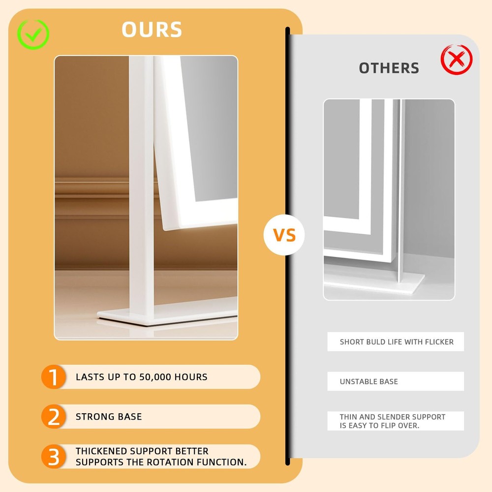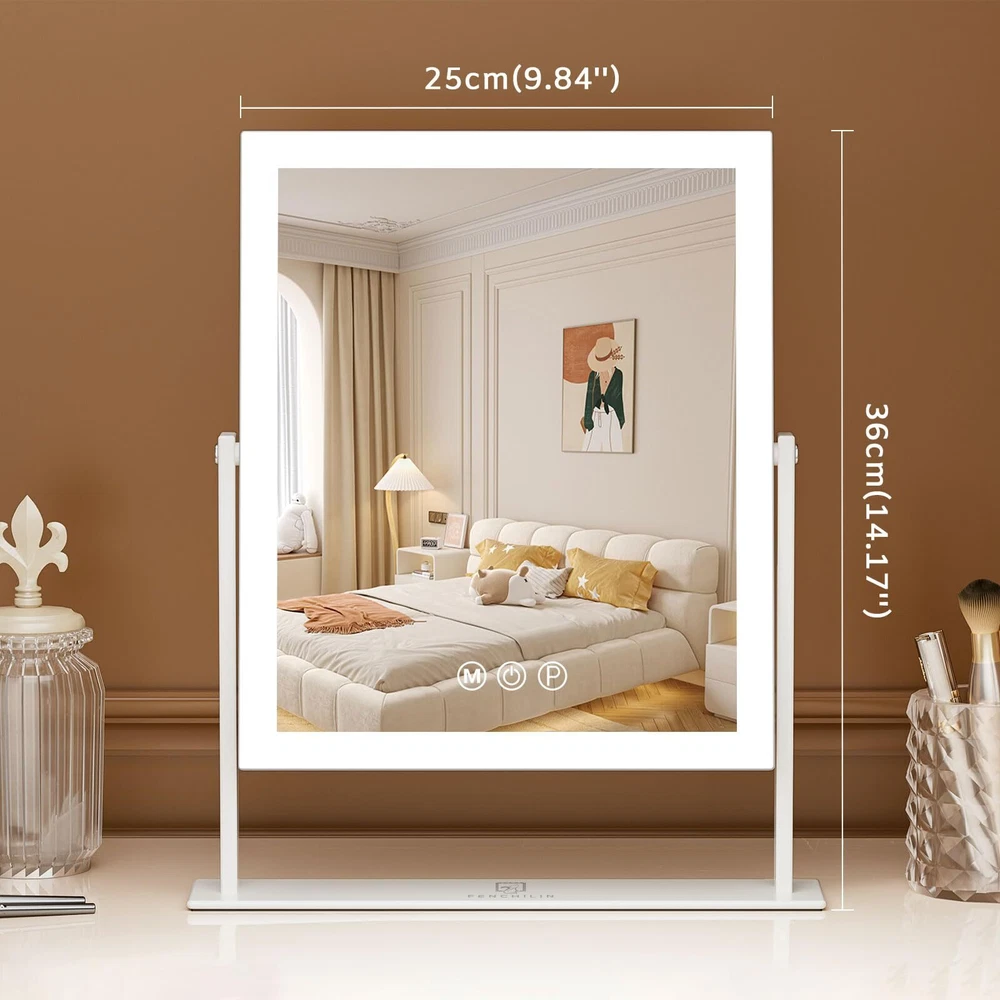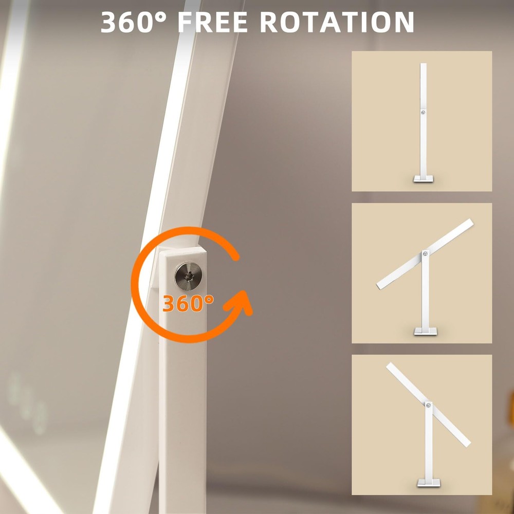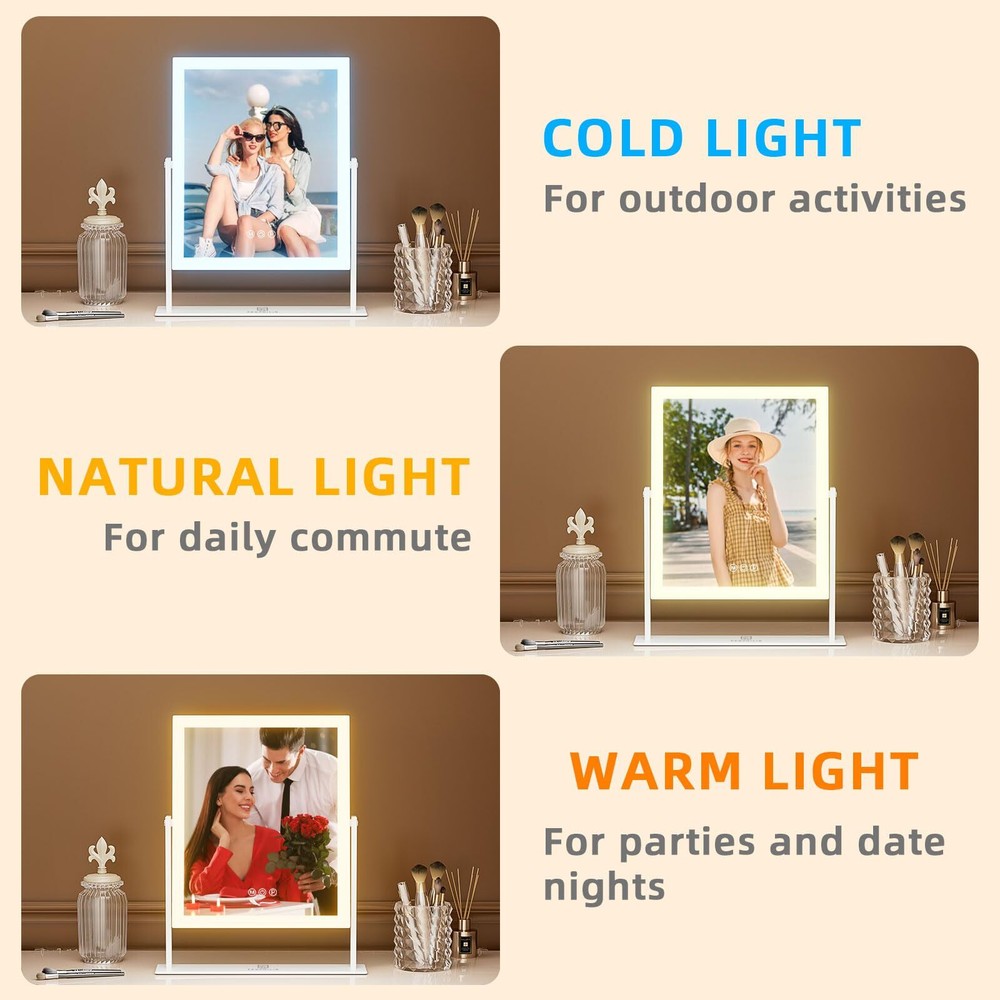 【Smart Vanity Mirror with Light】 Surrounded by 144 LED lights, this makeup mirror offers balanced illumination for all makeup needs. Made with high-quality silvered glass for a crisp reflection, its ABS frame is easy to clean and sturdy, ensuring a lasting, pristine vanity experience. 【Adjustable Brightness & 3 colors Lights】hollywood vanity mirror surrounded by 144pcs LED lights, with warm white(3000k)/natural white(4000k)/cold white(6500K), three-tone settings, adjustable brightness is meet to your personal makeup requirement. 【Perfect Size】This makeup mirror with lights has a popular size of 9.84x11.81 inches, 360° rotation and an HD mirror. The lighted makeup mirrors rotatable stand ensures the perfect viewing angle for easy makeup checks, resulting in consistently charming makeup. 【Smart Touch Control】This light up makeup mirror can simply turn on/off the light and you can adjust the brightness by touching the sensor switch on the mirror screen. The memory function makes the light setting return to the same brightness it was on before being switched off, meeting your usage habits and simplifying use. 【Comes With 10X Magnification Mirror】This vanity mirror comes with an additional compact & detachable 10X magnified mirror, helpful for detailed makeup such as eyeliner, mascara, eyebrows, and contact lenses. It's also a portable travel makeup mirror.