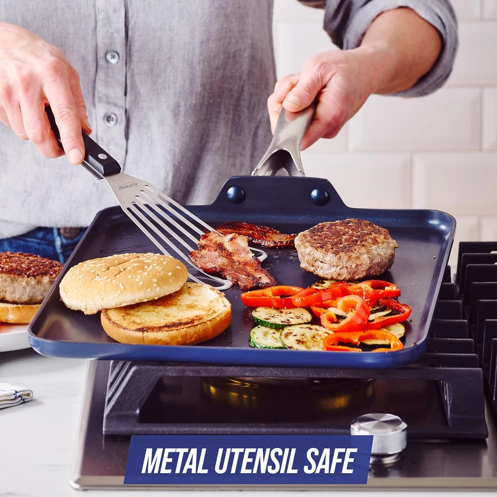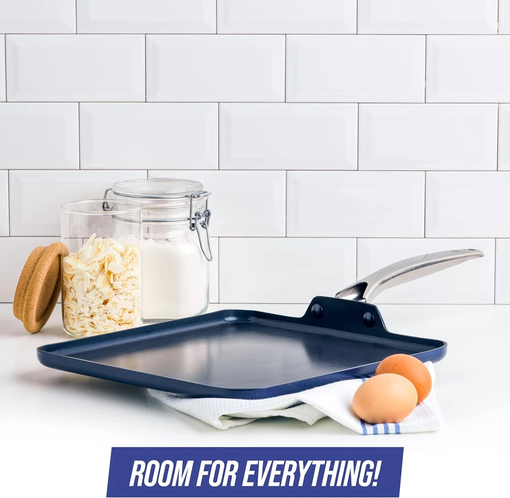 DIAMOND INFUSED CERAMIC NONSTICK: Our signature diamond-infused ceramic nonstick is 5x harder and 10x longer lasting than traditional coatings. LARGE COOKING SURFACE: 11" Griddle Pan provides ample space for cooking. TOXIN-FREE: Free of PFAS, PFOA, lead, and cadmium for healthier cooking. DURABLE CONSTRUCTION: Heavy-duty base prevents warping, wobbling, or degrading over time. VERSATILE USE: Oven and broiler safe up to 600°F for flexible cooking options. EASY CLEANUP: Dishwasher safe for convenient maintenance. COMFORTABLE HANDLING: Riveted stainless steel handle for a secure and comfortable grip. WIDE COMPATIBILITY: Suitable for all stovetops, except induction. METAL UTENSIL SAFE: Durable surface allows use of metal utensils without damage. Give yourself plenty of room for diner fare and everything else with this versatile griddle from Blue Diamond. This pan features Blue Diamond’s signature diamond-infused coating, which is 5x harder and 10x longer lasting than traditional nonstick and metal utensil safe. Diamonds are 4x more heat conductive than copper, so this griddle heats up faster and cleans up easier. The Blue Diamond griddle pan is toxin-free and manufactured without PFAS, PFOA, lead, or cadmium. The riveted stainless steel handle provides a sturdy and secure grip. Dishwasher safe. Oven and broiler safe up to 600°F.