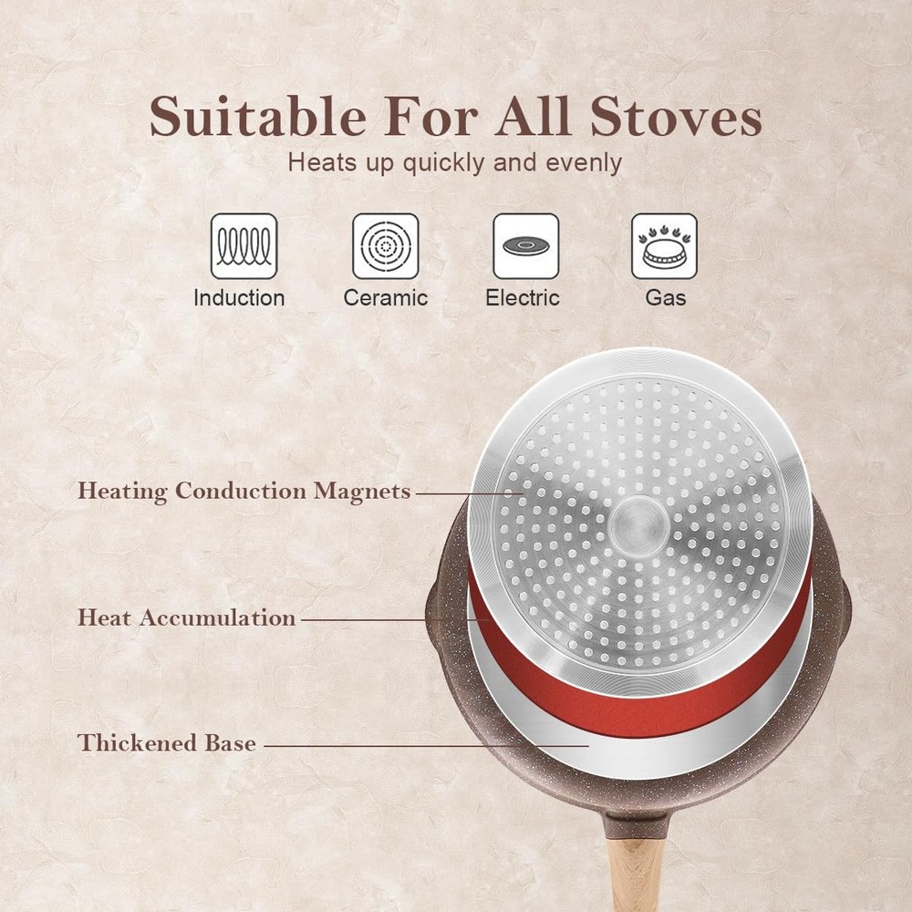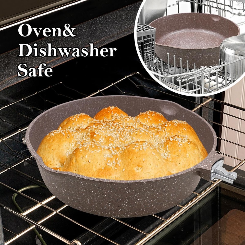 【DURABLE CERAMIC COATING】The 11 inch frying pan is made of natural ceramic coating and free from PFAS, PFOA, lead or cadmium. frying pan glass lid with a silicone seal that can be removed for cleaning. For a healthier and more enjoyable cooking experience at home. 【PREMIUM MATERIAL】The 11 inch nonstick ceramic frying pan with lid is made of high-quality aluminum, which allows better heat storage and distribution than conventional cast iron pans. Suitable for most heating methods. It is recommended to use low or medium heat for cooking. 【11 INCH CERAMIC FRYING PAN WITH REMOVABLE HANDLE】Easily removable by pressing the red button. Removable handle for more stability and no wobbling. Oven & dishwasher safe (without handle). Recommend hand washing to prolong the life of the deep frying pan. 【HEALTHY COOKING】The non-stick ceramic frying pan can be used for a variety of delicious dishes, such as frying vegetables, frying eggs, frying fish or frying steaks! 【NONSTICK CERAMIC FRYING PAN SPECIFICATION】1 *11 inch deep frying pan, 1 *Silicone lid, 1*Silicone Spatula. Non-stick saute pan size: Ø 11 inch, 3.1 inch high, 5 Quart large capacity. The pan with lid is deeper than a conventional frying pan. Please do not hesitate to if you have any questions.