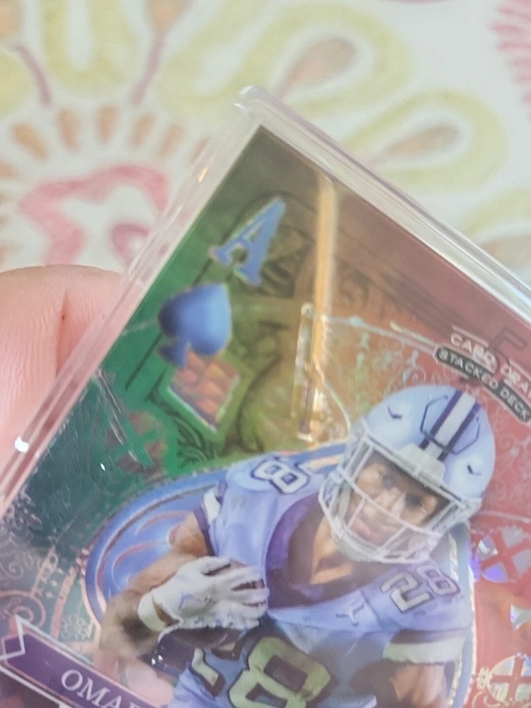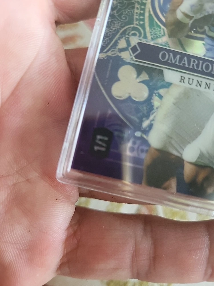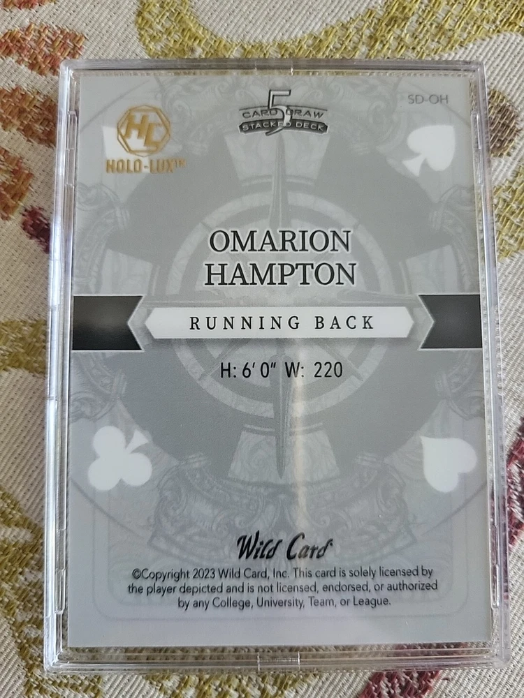 For the avid collector of sports trading cards, here is a rare opportunity to own a one-of-a-kind card featuring Omarion Hampton, a talented player from the North Carolina Tar Heels team. This card is from the 2023 Wild Card set and is a five-card draw stacked deck Ace of Spades, which adds to its uniqueness and value. The card is printed in purple lazer prizm and is serial numbered, making it a valuable addition to any collection. It is a pre-rookie card and features a hologram, making it an even more unique and desirable card. This Wild Card is manufactured by a well-known company and is perfect for fans of the National Collegiate Athletic Association (NCAA) and football in general.