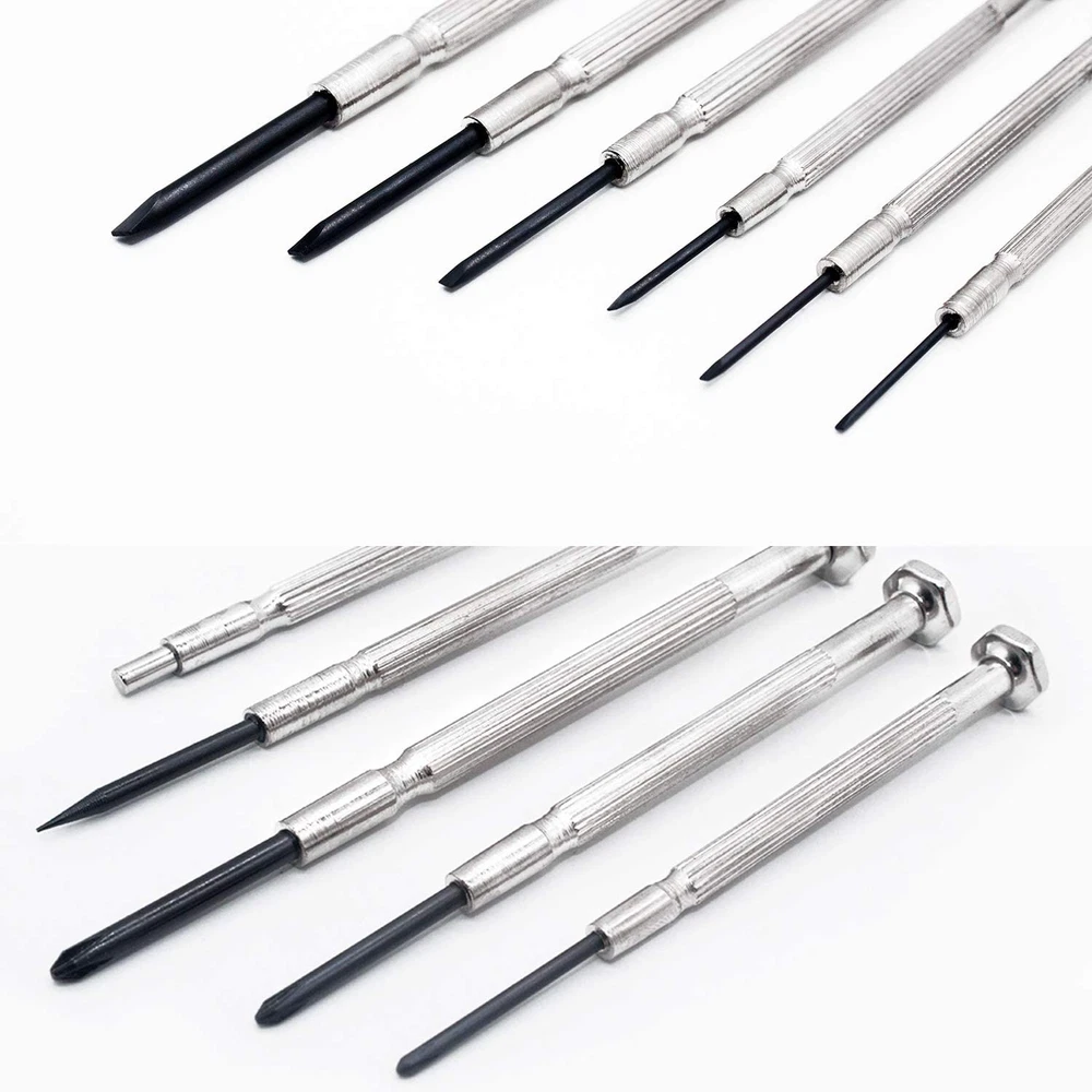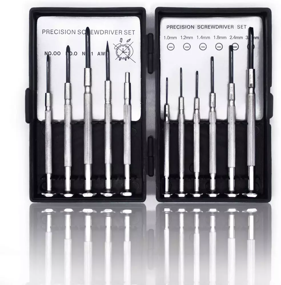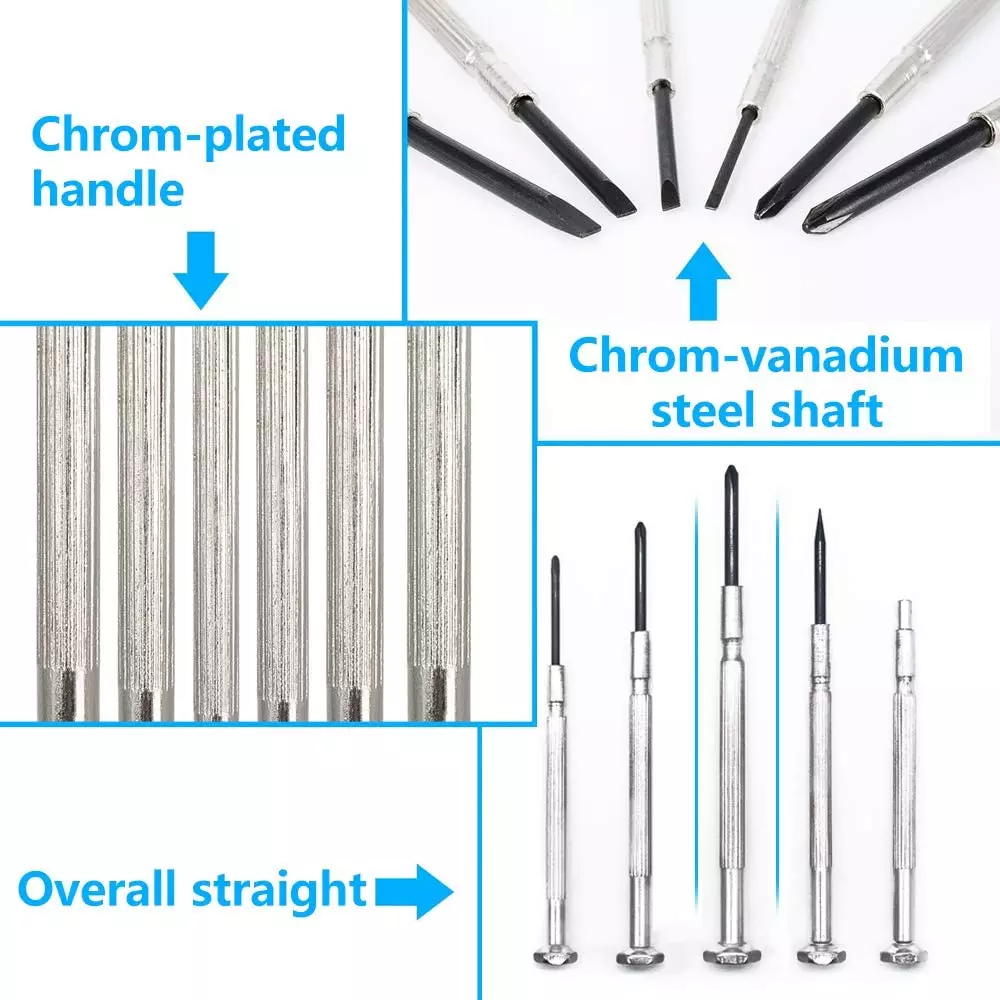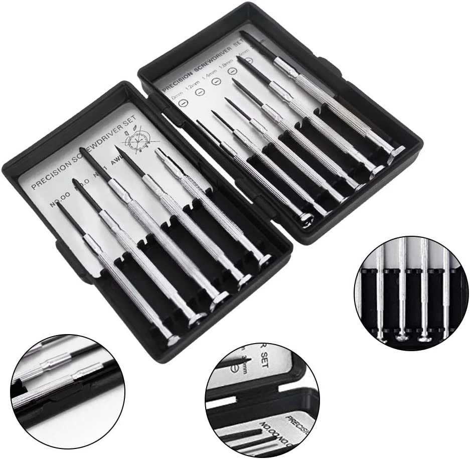 【11 DIFFERENT SIZES / STYLES】 - Includes 00-Point 、0-Point 、 1-Point Phillips and Flat head 1.0mm,1.2mm,1.4mm, 1.8mm, 2.4mm, 3.0mm and 1 Awl、1 Magnetic 【RUST PROOF BLADES】 - Hard Tempered Black Oxide Shafts Designed for Longevity and Durability 【CONVENIENT CARRYING CASE】 - Plastic Storage Case to Keep the Screw Drivers Organized 【ROTARY DESIGN】 - End cap it used rotary design, the rotation is flexible and the gap is closely combined while use, comfortable hand feeling. Spinning end caps increase speed and efficiency, convenient to use 【IDEAL FOR FASTING SMALL SCREWS】 - Perfect for Electronics, Computers, Watch Repair, Jewelry Repair, and Fixing Anything With Micro Screws Product Description Awl Bits : The multifunctional Awl Bit helps you to do some auxiliary work while using the screwdrivers. Magnetic Rod : Only the front end of the rod is magnetic. Screwdriver Head Material: #45 Steel Hardness: HRC40-45 Specifications: Color: Silver Surface Treatment: Blackening Treatment Surface Treatment: Nickel Plating Treatment Package size : 115 * 70 * 25mm / 4.53 *2.75 * 0.98 inch Phillips Bits : PH00 PH0 PH1 Flathead Bits : 1.0 1.2 1.4 1.8 2.4 3.0mm 1x Awl Bits 1x Magnetic Rod