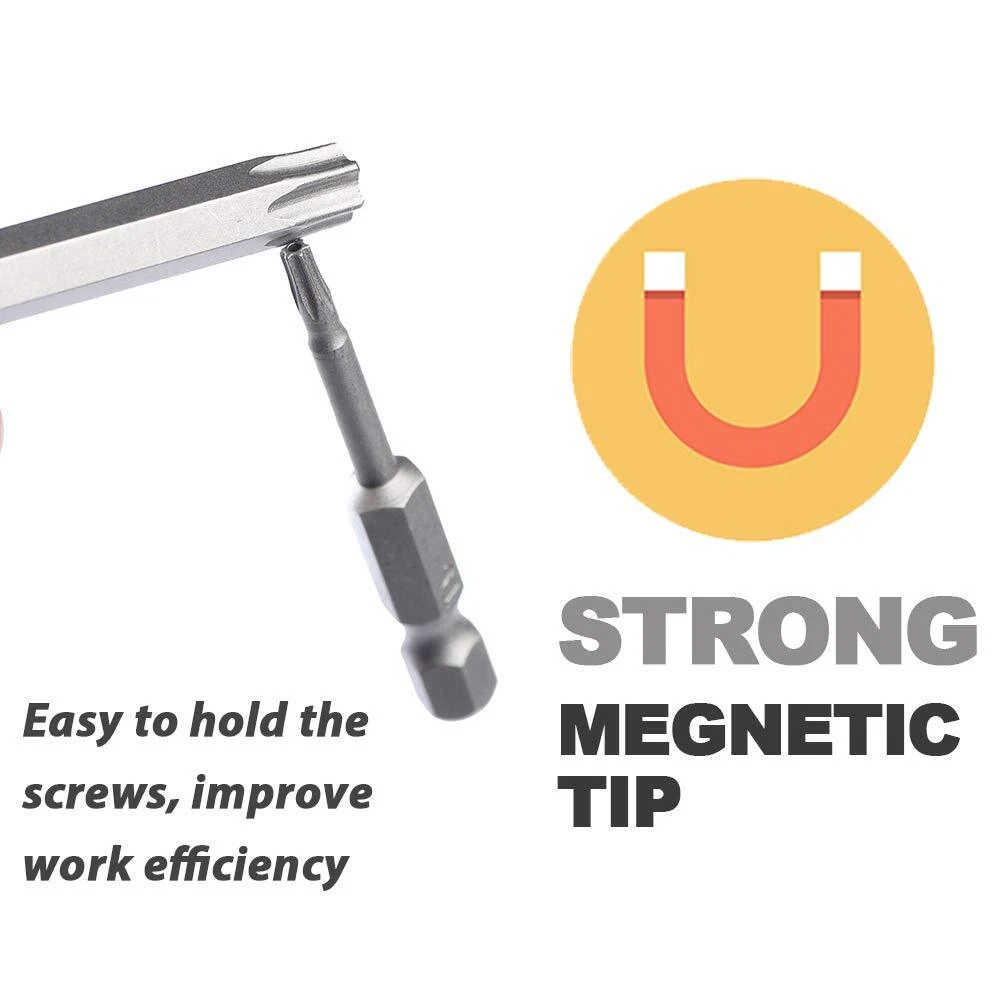 Security Torx Screwdriver Bit Set 11PCS 1/4 Inch Hex Shank 3 Inch/75 mm Length S2 Steel Tamper Proof Star 6 Point with Magnetic for Power Screwdriver Drill Impact Driver EXCELLENT MATERIAL - The screwdriver bits are made from high quality S2 steel, high hardness, wear resistance and impact resistance, the surface adopts sandblasting process, reliable for long time service. VERSATILE BITS - Include 11 Torx Screwdriver Bits, T6, T7, T8, T9, T10, T15, T20, T25, T27, T30, T40, competent for various working conditions. STRONG MEGNETIC - Easy to hold the screws, convenient to use in multiple work scenarios, especially in tight space. HIGH PRECISION - The precision is strictly controlled in production process, perfectly fits the screws, not easy to slip and collapse, the bits are straight and concentric, effectively reducing the bit swinging. WIDE APPLICATION - These bits are compatiable with electric screwdrivers, manual screwdrivers, T-handle 1/4" driver screwdrivers, corded drills, cordless drills, impact drivers and more. Usually used for mechanical equipment, automobiles, motorcycles, bicycles, furniture, toys, electronic equipment, household appliances, etc. Shipping We offer FREE shipping on all orders! We ship within Three business days of payment, usually sooner. We use a selection of shipping services such as UPS, FedEx, USPS etc. We only ship to the lower 48 states, no APO/FPO addresses or PO Boxes allowed. Local pickups and combined shipping options are not provided at this time. Return You can return a product for up to 30 days from the date you purchased it. Any product you return must be in the same condition you received it and in the original packaging. Please keep the receipt. Payment We accept payment by any of the following methods: PayPal Please pay as soon as possible after winning an auction, as that will allow us to post your item to you sooner! Feedback Customer satisfaction is very important to us. If you have any problem with your order, please contact us and we will do our best to make you satisfied. Contact Us If you have any queries, please contact us via ebay. We usually respond within 24 hours on weekdays. Please visit our eBay store to check out other items for sale! Thank you for shopping at our store.