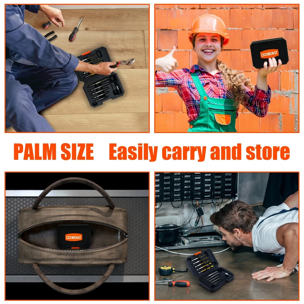 11Pcs Screw Extractor Set, Left Handed Drill Bit and Screw Extractor Kit Easy to Remove Stripped Broken Damaged Screw Bolt and Nut Out, Reverse Drill Bit Extractor Set with Sturdy Case 11PCS SCREW EXTRACTOR SET - Extractor kit includes 5 pcs left-handed drill bits, 5 pcs spiral screw set and a quick adapter. The bottom of the drill bits and the extractors have a unified 1/4 size design can be used more conveniently with an adapter to connect hand tools or electric tools, improving the efficiency of handling most maintenance work. PROVIDE REMOVE SPACE - 135°angle makes bits easier to cut into the workpiece and has less axial resistance providing an effective removal space without damaging other working areas. Left-handed flute design runs the impact wrench in reverse also improves the effect of spinning broken bolts out. Each left-handed drill bit is of high-speed steel material with titanium coating drill bits enhance hardness and wear resistance. EXTRACT BROKEN SCREW - 5 Pc spiral screw extractors with spiral flutes embed themselves to increase grip as resistance increases, easily spin embedded broken bolts and damaged screws out based on drill hole, help out of tough spots. Also providing extra needs can reach deeper places for bolts and screws removed. Each made of premium Chromium-molybdenum steel material is sturdy. EASY TO US - A quick change adapter is added to the kit without worry about disassembling the drill bit and extractor back from hand tools or electrician tools. Each drill bit/extractor and adapter are used in combination through magnetic suction to improve efficiency at work. The palm-sized storage box is easy to carry and increases the number of daily uses. WIDE APPLICATION & RELIABLE - Ingenious drill bit with extractor combination meets most mechanical maintenance, automotive, home decor or craft production repair needs. tools have quality assurance, feel free to contact us if there are any problems with the product. We provide you with service for the first time.