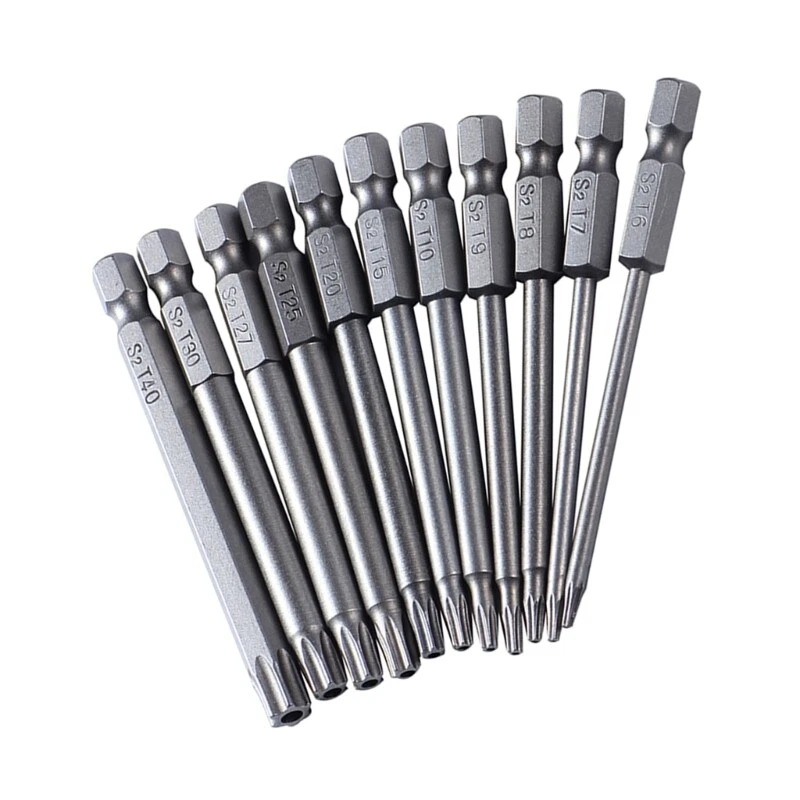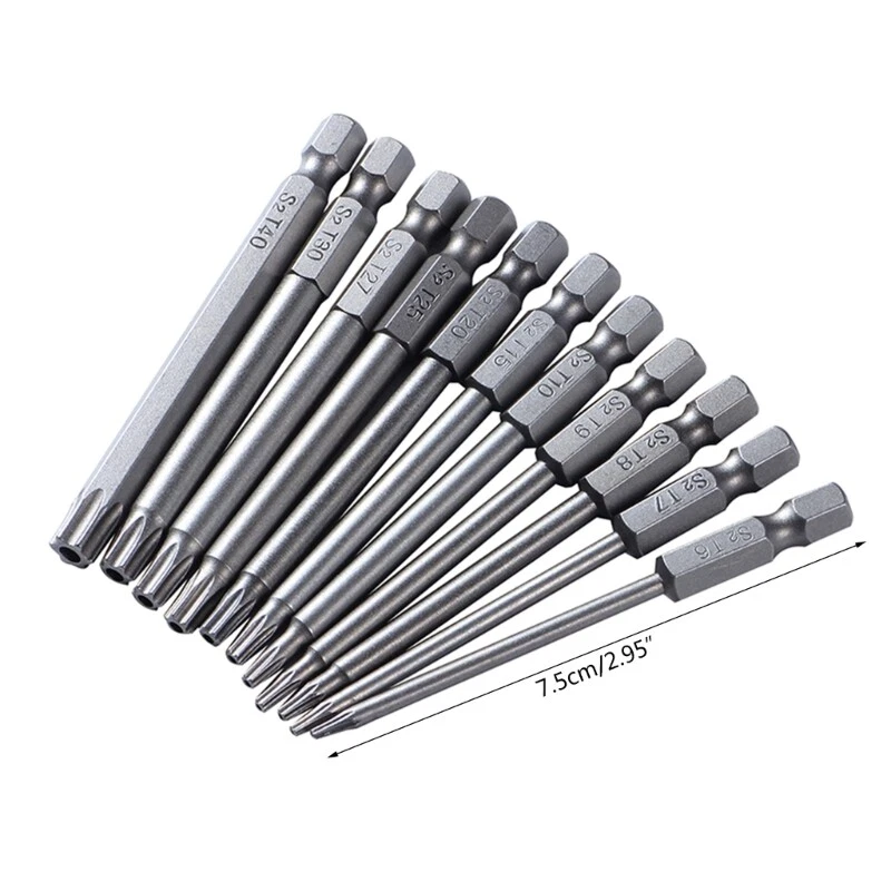 Features: Brand new and high quality 3.52 inch T7, T8,T9, T10, T20, T25, T27, T30, T40 10 in 1 professional size security torx bit set.They feature a standard 1/4" Hexagon bit size which convenient for daily use.Fit all commercially available quick-change chucks and hexagonal tools for screwdrivers and drills.It's better to prepare in advance. Magnetizable security torx screwdriver bit set compare with others impact driver bit set are more to pick up and hold screws easily with no sliipping or stripping. Torx screwdriver set made from high quality shock-resisting tool steel which is a hard and abrasion-resistant alloy metal.Can withstand repeated use 4 Hexagon shank drill screw bit set is not only work with impact driver, but also screwdriver bit set perfect for any regular drill, electric and hand screwdrivers, power drills,corded drills and more,the impact bit set are widely used in electronics repairs, framing installation and so on. This drill bit set can be fun and practical gift for your loved ones. It is a unique and exquisite gift for him on various occasions such as Fathers Day,Christmas , birthdays or anniversaries. Help him get the job done easier and faster. Specifications: Material Steel Length:Approx.7.5cm/2.95inch Package Includes: 11x Screwdriver Bit note: 1.Please allow 1-2cm errors due to manual measurement, make sure that you do not mind before you order. 2.Due to the difference between different monitors, the picture may not reflect the actual color of the item.