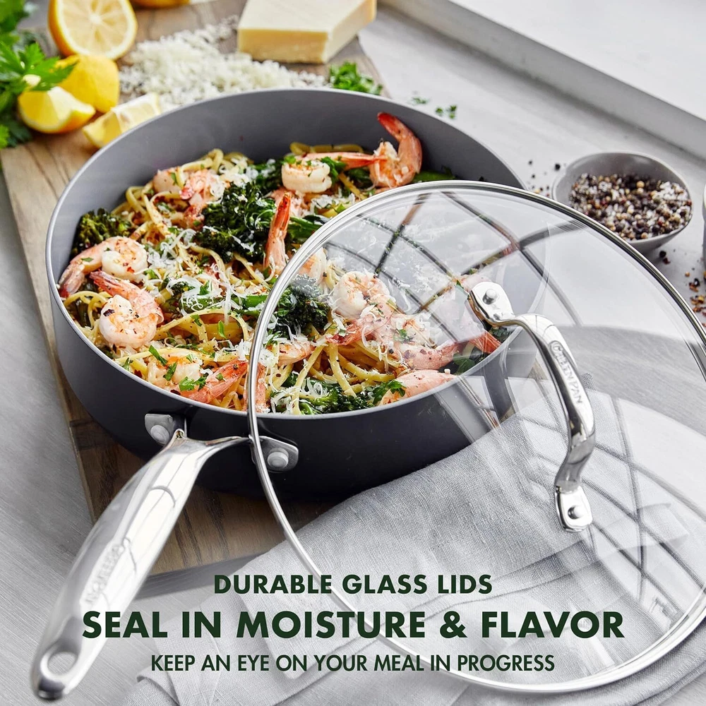 Commercial Electric Meat Slicer Deli Food Slicer w/ Removable 8.5" Blade Cheese 109.42 USD 115.18 USD Free shipping 5% off 3 Tier Folding Bookcase Stackable Solid Wood Sturdy Shelves Storage Espresso US 66.52 USD 70.02 USD Free shipping 5% off Glider Rocking Chair Ottoman Cushion Set Recliner Furniture Baby Nursery Seat US 156.81 USD 165.06 USD Free shipping 5% off 2 Pack Heavy Duty Garage Bucket Dolly Lockable Casters 12 Inch Rolling Trolley 41.91 USD 44.12 USD Free shipping 5% off Rustic Whiskey Barrel Planter UV Resistant Drainage Holes Indoor Outdoor Use New 16.9 USD 17.79 USD Free shipping 5% off Rechargeable Lithium-Ion Battery Powered Pump Zero Technology Sprayer 2-Gallon 100.79 USD 106.09 USD Free shipping 5% off Storage Tool Organizer Utility Box W/ 4 Drawers 19 Compartments Carrying Handle 31.0 USD 32.63 USD Free shipping 5% off 4.4 Cu ft Mini Fridge Cooler Refrigerator Door No Freezer Stainless Steel Look 166.96 USD 175.75 USD Free shipping 5% off 2 Packs 32oz All Natural Sunsweet Prune Juice No Pulp Fiber Potassium Vitamins 27.96 USD 29.43 USD Free shipping 5% off RhinoFLEX 15ft RV Sewer Hose Kit 4-in-1 Adapter Clear Elbow Caps USA Made 45.66 USD 48.06 USD Free shipping 5% off 6 Piece Outdoor Patio Dining Set Table Folding Chairs with Umbrella Garden Red 94.76 USD 99.75 USD Free shipping 5% off 2 Speed 30 Inch High Velocity Drum Fan Tilted Air Circulator Metal Portable New 178.33 USD 187.72 USD Free shipping 5% off About this item SET INCLUDES: 8'', 9.5'', 11'' frypans, 2QT and 3QT saucepans with lids, 3QT sauté pan with lid; 5QT stockpot with lid, and 3 pan protectors. CUTTING-EDGE CERAMIC NONSTICK: Infused with diamonds, GreenPan's metal utensil safe ceramic nonstick offers remarkable durability, balanced heating, and effortless cleanup. TOXIN-FREE: Our signature ceramic nonstick coating is free of PFAS, PFOA, lead or cadmium. AWARD-WINNING PERFORMANCE: Our Valencia Pro has set the standard for ceramic nonstick winner of the best ceramic nonstick 8” and 11” frypans from America’s Test Kitchen and 2023 Good Housekeeping Sustainable Innovation Award. DUOFORGED HARD ANODIZED BODIES: Unbelievably tough and scratch-resistant, these pans are pre-treated before they’re hard anodized for extraordinary durability. MAGNETO INDUCTION BASES: Optimized for performance on all stovetops, including induction. DURABLE GLASS LIDS: Offer an easy way to check on your meal in progress, oven safe up to 425°F EASY TO CLEAN: Most messes wipe clean, plus these pans are dishwasher safe for effortless cleanup. COMFORTABLE STAINLESS STEEL HANDLES: Mirror-polished stainless steel handle stays cool thanks to a V-shaped cutout. PERFORMS WHERE YOU NEED IT: Oven and broiler safe up to 600°F (lids up to 425°F) and suitable for all stovetops, including induction. You may also like Rotator Cuff Pillow W/ Pocket Adjustable Shoulder Support Recovery After Surgery 50.35 USD 53.0 USD Free shipping 5% off Coastal Shell Bath Accessories Sets 4 Pieces Handcrafted Bath Decor Resin Sand 39.88 USD 41.98 USD Free shipping 5% off Nightstand Organizer W/ Fabric Drawers Storage Side Table Bedroom Living Room US 56.8 USD 59.79 USD Free shipping 5% off Electric Coffee Percolator 4 Cup Stainless Steel Keep Warm Function Coffee Maker 59.27 USD 62.39 USD Free shipping 5% off Faux Leather Dining Chair Set of 2 Adjustable Legs Tufted Backrest Indoor Use 113.79 USD 119.78 USD Free shipping 5% off DC Power Supply 0-32V 0-5A Digital Bench Adjustable Laboratory Switching Supply 49.39 USD 51.99 USD Free shipping 5% off 4lb 7in Torpedo Wedge Wood Splitting Tool Forged Steel Durable Firewood Splitter 28.15 USD 29.63 USD Free shipping 5% off Stainless Steel Airpot Hot Water Dispenser Thermos Ideal Coffee Tea Events New 45.74 USD 48.15 USD Free shipping 5% off 5.9 Inch Narrow Console Table W/ Outlet Sofa Table Set of 2 Charging Stations 103.99 USD Free shipping Kids Plush Faux-Fur Saucer Chair Portable Folding Accent Chair Cozy Seating New 29.17 USD 30.7 USD Free shipping 5% off Round Ceramic Planter W/ Drainage Hole Ideal Small Plants Indoor Decor Black New 5.22 USD 5.49 USD Free shipping 5% off Toilet Brush Holder Set Ceramic Cleaning Accessory Bathroom Decor Stylish Design 36.94 USD 38.88 USD Free shipping 5% off