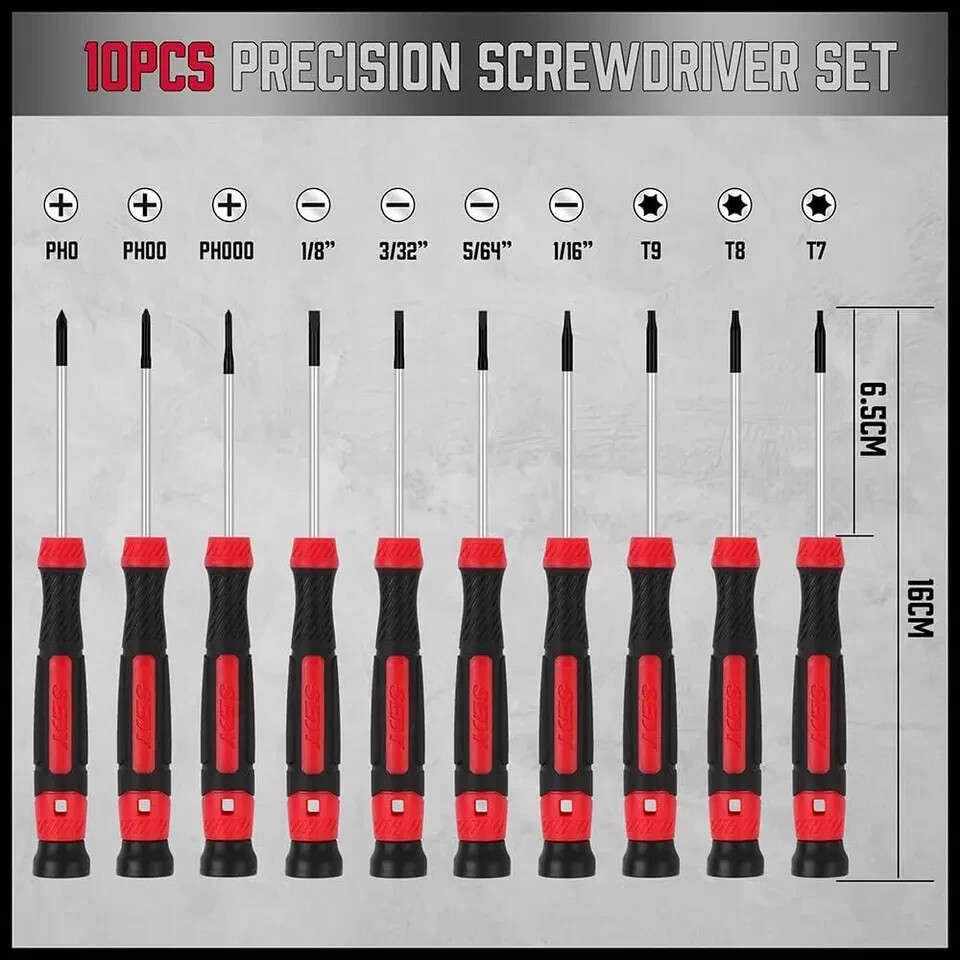VERSATILE KIT - Discover endless utility with our 11-Piece Precision Screwdriver Set, offering a versatile and comprehensive repair solution for various devices. MAGNETIC TIPS - Experience hassle-free repairs; magnetic tips securely hold tiny screws, preventing any frustrating losses or drops during use. MULTIPLE SIZES - Featuring Phillips, slotted, and Torx screwdrivers, plus a demagnetization device, this set caters to a wide spectrum of repair needs NON-SLIP COMFORT - Designed with TPR and PP materials, each screwdriver guarantees a comfortable, non-slip grip for an enhanced repair experience. PORTABLE STORAGE - Organize and mobilize; the included zipper bag ensures each precision tool is neatly stored and ready for action wherever you go.
