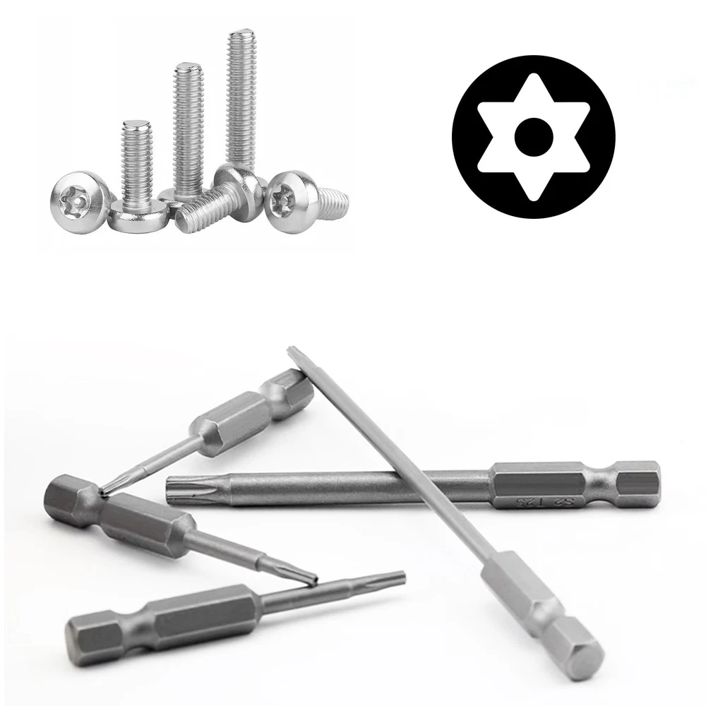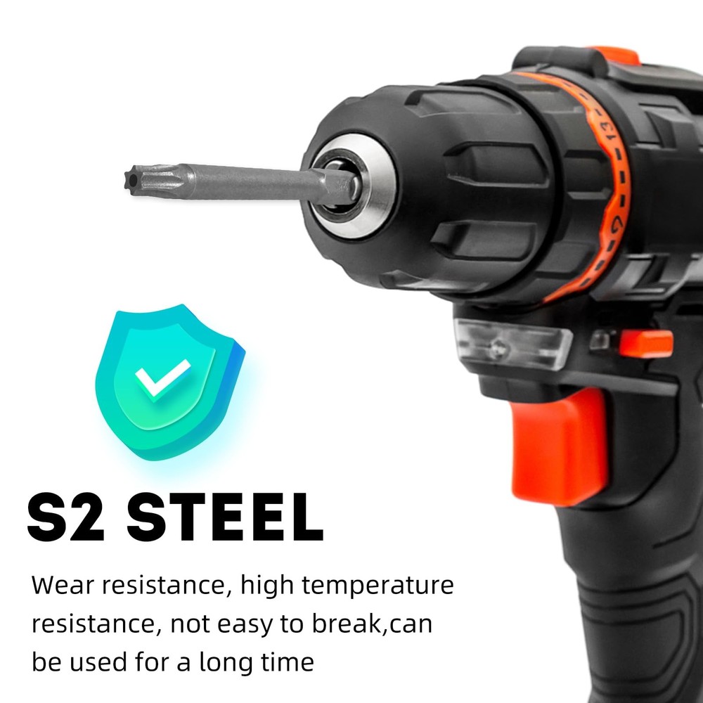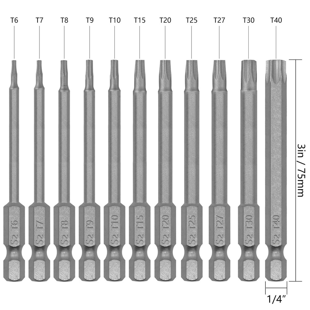 Features Trox Head with magnetism and skid resistance. S2 Steel, high quality with good hardness for you to use. Fit specialty screws found on cell phones, computers/laptops/ TVs, game consoles, toys, heaters, small appliances, ect. Packed in a plastic box, easy and convenient to storage Specification Material: S2 steel Size: Triangle head: T6, T7, T8, T9, T10, T15, T20, T25, T27, T30 and T40 Length: 3inch/75mm Hex Shank:1/4 inch/6.35mm S2 Steel Material: The torx head screwdriver bits are made of S2 alloy steel, hard, durable and anti-rust. The screwdriver bits are polished and have a smooth finish, friendly to use 11 pack Star Screwdriver drill bits: T6, T7, T8, T9, T10, T15, T20, T25, T27, T30, T40, which can meet your various needs Strong Magnetic: The magnetic screw drill tip helps to suck the screw when in use, so it won't damage the screws and the screwdrivers Easy to Use: Directly insert the Torx Head Screwdriver drill bits into your tool, as long as it is inserted, it will not fall off easily. You can easily use them on vehicles, bicycles, furniture, engineering, machinery, home appliance repairs, etc Widely compatible: The Torx Bit Set are suitable for electric screwdrivers, hand screwdrivers, electric drills, air drills and other tools.But please note that it cannot be used for impact drills and electric wrenches