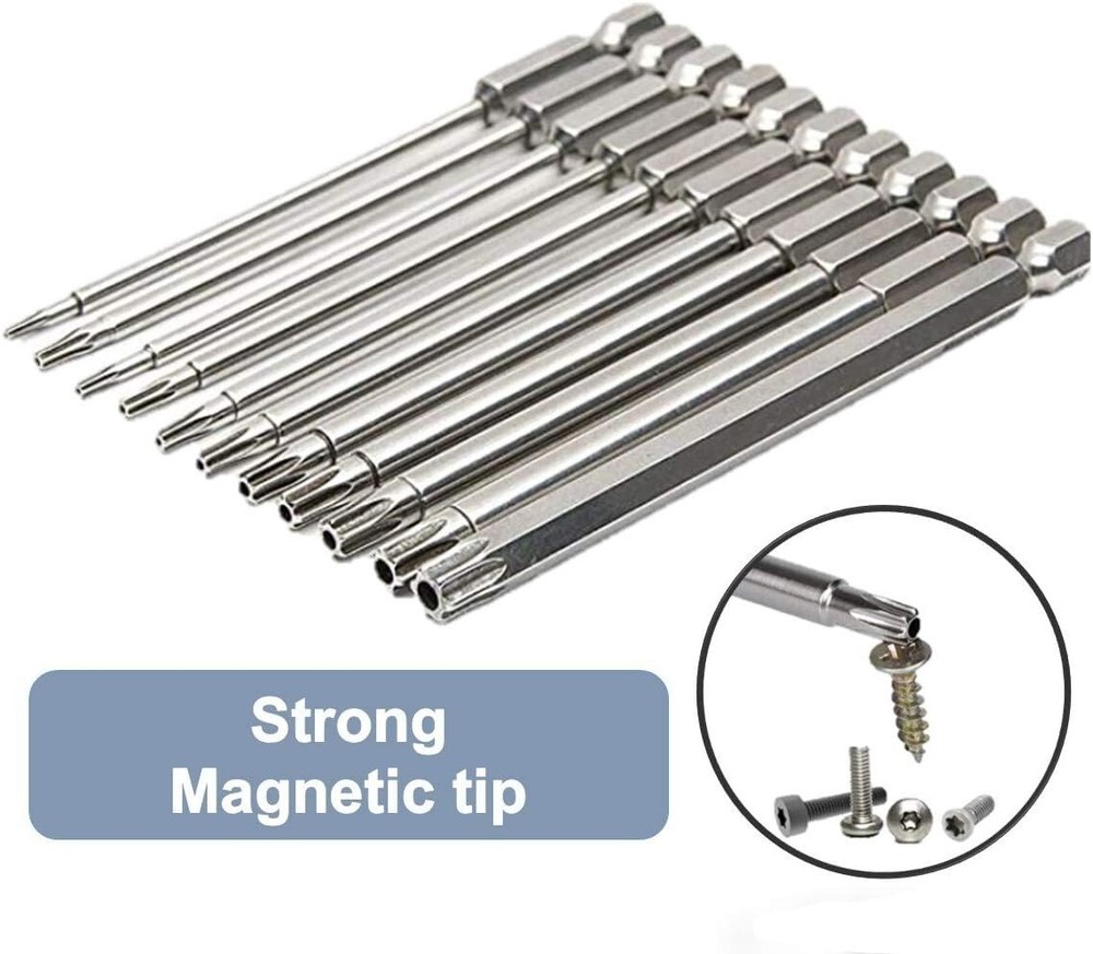 11-Piece Shark Vacuum Screwdriver Security Bit Set, S2 Steel Magnetic Security Screwdriver 4 Inch Star Driver Bit Set for Shark Vacuum T6-T40 (100mm Length) About this item [What You Will Have] 4 inch security bits -11pcs: T6, T7, T8, T9, T10, T15, T20, T25, T27, T30, T40 [Material] S2 alloy steel, material imported from Japan. Surface sandblasting treatment improves the fatigue resistance of the product [Strong Magnetic] Can suck the screws easily when used it [Application] Can be used for manual electric screwdriver, screwdriver, hand screwdrivers, electric drills, air drills and other tools [Quick Change] 1/4 inch hex shank fits into tools more easily and securely Product Description aiyun screwdriver bits aiyun Shark Vacuum Screwdriver Security Bit Set 50mm length size: T5, T6, T7, T8, T9, T10, T15, T20, T25, T27, T30, T40 75mm length size: T6, T7, T8, T9, T10, T15, T20, T25, T30, T35, T40 100mm length size: T6, T7, T8, T9, T10, T15, T20, T25, T30, T35, T40 150mm length size: T8, T10, T15, T20, T25, T27, T30, T40 Shank Dia:1/4 inch Hex Shank(quick change) Material: S2 alloy steel, Surface sandblasting treatment improves the fatigue resistance of the product. Application:Can be used for manual electric screwdriver, screwdriver, drill, air and other tools. aiyun Star Driver Bit Set Quick Change Fits into tools more easily and securely. S2 Alloy Steel Surface sandblasting treatment improves the fatigue resistance of the product. Strong Magnetic tip Can suck the screws easily when used it.