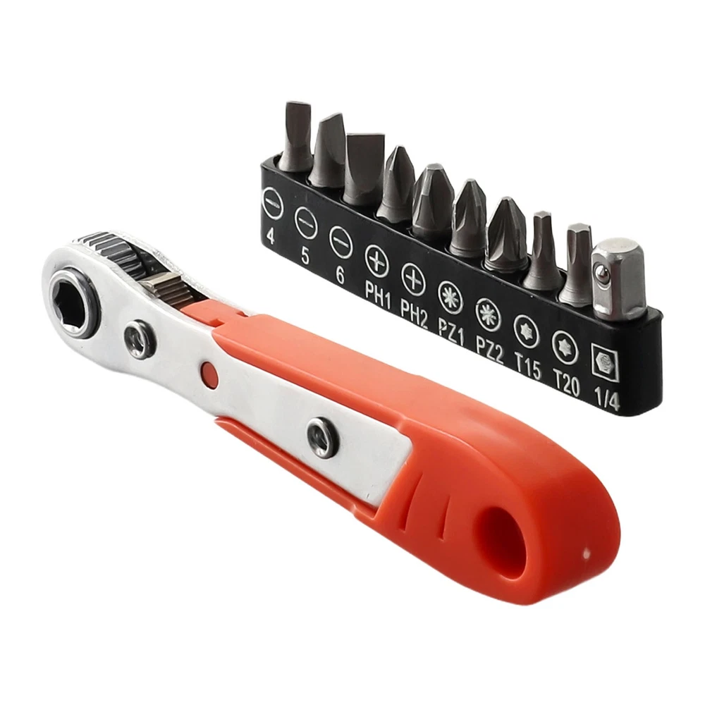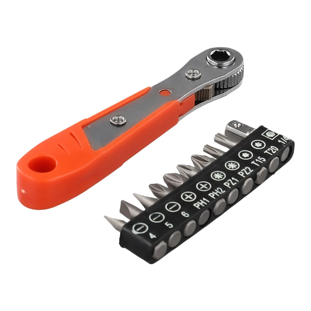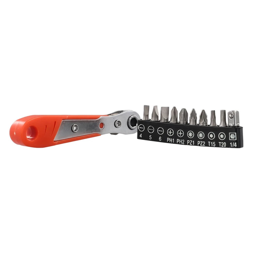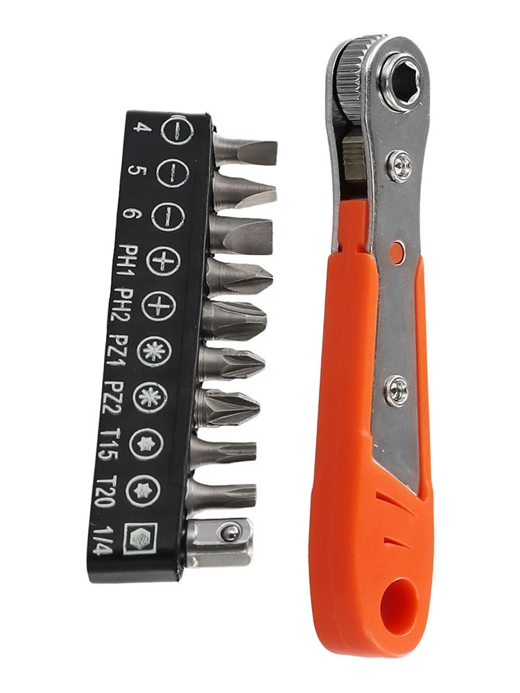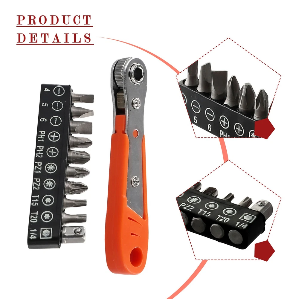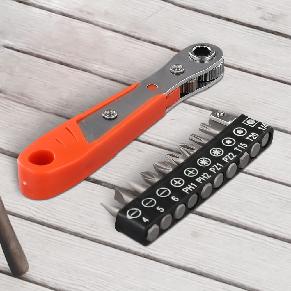 Beschreibung Features: *The Hex Ratchet Easily Fits Into Tight Spaces And Tight Work Areas. *Great For Home Improvement, Automotive Work, Construction, Bike Repair, Deck Screws, And More! *Two-way adjustment design, which can be adjusted in two directions as needed. *High-density ratchet gears for quick rotation to improve. *Screwdriver Bits With magnetic, the parts adopt strong permanent magnet, which can fix the screws firmly. Perfect placement every time. *Standard shank diameter, 6.35mm on the opposite side of the hexagonal shank, 1/4 standard shank diameter, suitable for all kinds of pneumatic screwdrivers, electric screwdrivers, rechargeable screwdrivers, and ratchet wrench. Specifications: Product name: Ratchet Wrench Screwdriver Set Material: ABS+Metal(Wrench), Chromium-vanadium alloy steel(Screwdriver Bit) Color: Orange, Grey, Silver Wrench Length:(Approx.) 110mm Screwdriver Bit Type: for Torx Screwdriver Screwdriver Bit Length: 25mm Screwdriver Bit Size: SL4.0, SL5.0, SL6.0, PH1, PH2, for PZ1, for PZ2, for T15, for T20, 1/4Inch Adapter Suitable for: It can be used for home appliance/ motorcycle/ cabinet/ automobile/ machine tool maintenance, etc. Quantity: 11pcs set Package Included: 1× Ratchet Wrench 9× Screwdriver Bits 1× 1/4Inch Adapter Note: 1. The real color of the item may be slightly different from the pictures shown on website caused by many factors such as brightness of your monitor and light brightness. 2. Please allow slight manual measurement deviation for the data. POLICES Shipping Payment WARRANTY We only ship to confirmed ebay Order addresses. Please comfirm that your Order address is in line with your shipping address. Please kindly note that the c ombined shipping is not provided because the shipping fee is calculated by weight. Also, the each additional item means exactly the the same color and size. It takes about 7 -15 working days to US; about 10-30 working days to other countries. Transit time may be a little delayed because of the bad weather and customs inspection . If you do not receive your item within 30 working days since payment finished, please contact us immediately for further assistance. Payment must be completed within 5 days. If you have any problems about payment, please contact us via ebay message. We strive for 100% customer satisfaction! Positive Feedback is very important to us. If you have any questions, p lease feel free to contact us via "Ask seller a question" . We will reply your email within 24 working hours.