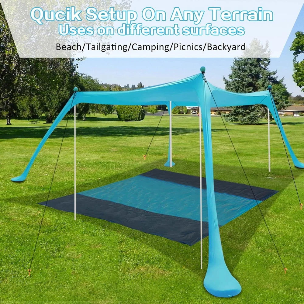 Beach Canopy Tent 11X11 FT Include Blanket Shade Lake blue Product Details Brand: BRONOM Material: Aluminum Color: Lake blue Item Weight: 10 Pounds Recommended Uses For Product: Beach Product Dimensions: 130"L x 130"W x 80"H Ultraviolet Light Protection: True Frame Material: Aluminum Closure Type: Drawstring Water Resistance Level: Water Resistant Pole Material Type: Aluminum Coverage: 11x11 FT or enough for 4-6 people Number of Guylines: 4 Assembly Required: Yes Item Weight: 10 pounds Manufacturer: BRONOM Country of Origin: China Item model number: BC01 Large size and large space- The beach canopy installation size is 11x11 FT, which can provide enough space and shade, can accommodate 4-6 people to enjoy on the beach, outdoor, camping, picnic or use on the grass. Upgrade surprise- In order to meet your needs, we provide a beach blanket as an extra gift. It's very lightweight and cost-effective. Please choose this beach tent pop up shade. UV Protection- This beach shade canopy offering UPF 50+ , which can keep you and your family from the harmful UV rays and reduce sun burn or glare. Portable and lightweight- The beach canopy and beach blanket are packed in a carry bag, weighing 10lbs. You can take this beach sun shade canopy to any where you want to go, also taking it on plane is available. Easy to install- According to the instructions, you can install this beach canopy tent sun shade within 15 minutes and no tools required. In addition, we provide 4 additional windproof ropes to ensure the beach shelter will not be blown down by the sea wind, which is the care you can't enjoy in other brands. How to Install? 1.Lay beach tent fabric flat. 2.Use the sand shovel to fill all of the sandbags. 3.Pull beach canopy fabric apart as far as possible to make large “X” . 4.Put the end of the support rod with the black sponge ball into the fabric seam. 5.Hold up the support poles and insert the other end into the sand. 6.Tie the black sponge ball with a elastic cord. 7.Place the guyline on the black sponge ball, tie the other end on the ground peg and pull it tight, then insert the ground peg into the sand.