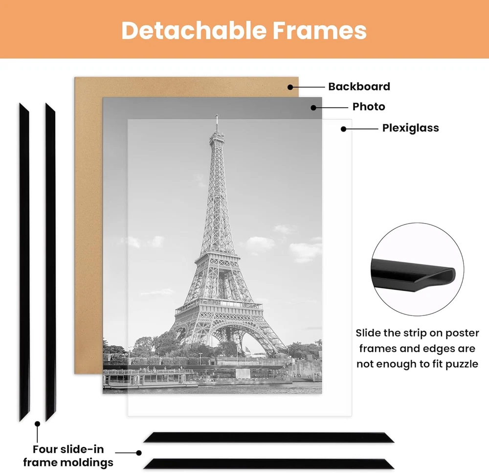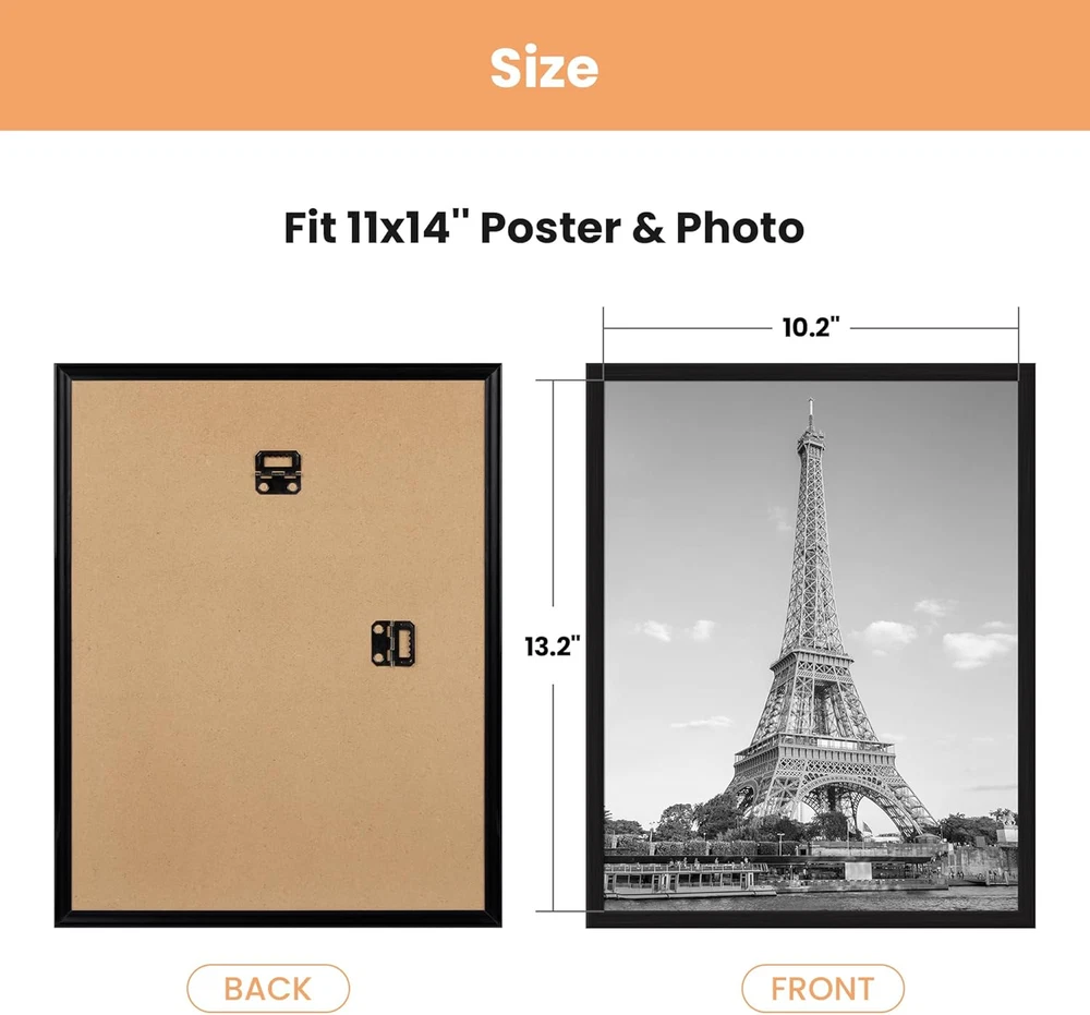 SIZE: 11x14 picture frame is designed in a modern style and is suitable for hanging on any wall in home, office, photo studio, art gallery, school exhibition hall. You can use them for Video Game, Movie posters to redecorate anywhere. Upgraded Material: These light-weight picture frames use upgraded plastic material, Scratch-proof and durable. And a thicker plastic cover with a protective film (prevent scratches) keeps posters better preserved. Before use, please tear off the bothside film. EASY to INSTALL: The frame strips can be easily assembled by sliding together, which is especially for large size poster frames to achieve the lightness. The frame back comes with 2 pcs sturdy hangers that can be hung vertically or horizontally from the wall. PRECIOUS GIFT: The frame is suitable for any style of photo, such as art prints, children's artwork, Video Game, Movie posters. It is the perfect gift for your family or friends on anniversaries, weddings, birthdays, Mother's Day, Father's Day, Thanksgiving, Christmas. SECURE PACKAGE: Each frame is individually plastic sealed with corner guard and finally overall sealed to ensure safe shipping and avoid damaged. Strong collisions may cause the frame corners to separate, just simply slide the strips to get a intact poster frame again. Product Description The video showcases the product in use. The video guides you through product setup. The video compares multiple products. The video shows the product being unpacked. 1 Art Gallery 2 Bedroom 3 Restaurant 4 Living Room What is the material of this poster frame? Both the frame strips and covers are made of plastic, which ensures that even large-sized poster frames can be easily hung without worrying about falling or hitting kids or pets. Is it easy to install? Yes, you can easily complete the installation and replacement of photos by simply sliding the frame strips across the cover and backboard, which is especially designed for large-sized picture frames to achieve the lightness. More Photo Frames for You Add to Cart Add to Cart Add to Cart Add to Cart Add to Cart Add to Cart Add to Cart Customer Reviews 4.5 out of 5 stars 20,462 4.5 out of 5 stars 65,039 4.6 out of 5 stars 1,507 4.7 out of 5 stars 991 4.7 out of 5 stars 6,141 — 4.4 out of 5 stars 1,637 Price $5.99 $ 5 . 99 $17.99 $ 17 . 99 $9.99 $ 9 . 99 $24.99 $ 24 . 99 $16.99 $ 16 . 99 $12.99 $ 12 . 99 $18.99 $ 18 . 99 Frame Material Plastic Plastic Plastic Wood Acrylic Metal Stainless Steel Cover Material Plastic Plastic Glass Plastic Acrylic Metal Stainless Steel Color Black Black Black Black Clear Black Black Size 8x10 in 11x14 in 5x7 in 8x10, 5x7, 4x6 in 15x4x2 in 27-52 in 33-72 in Item Package Quantity 1 Pack 5 Pack 3 Pack 10 Pack 4 Pack 1 Pack 1 Pack