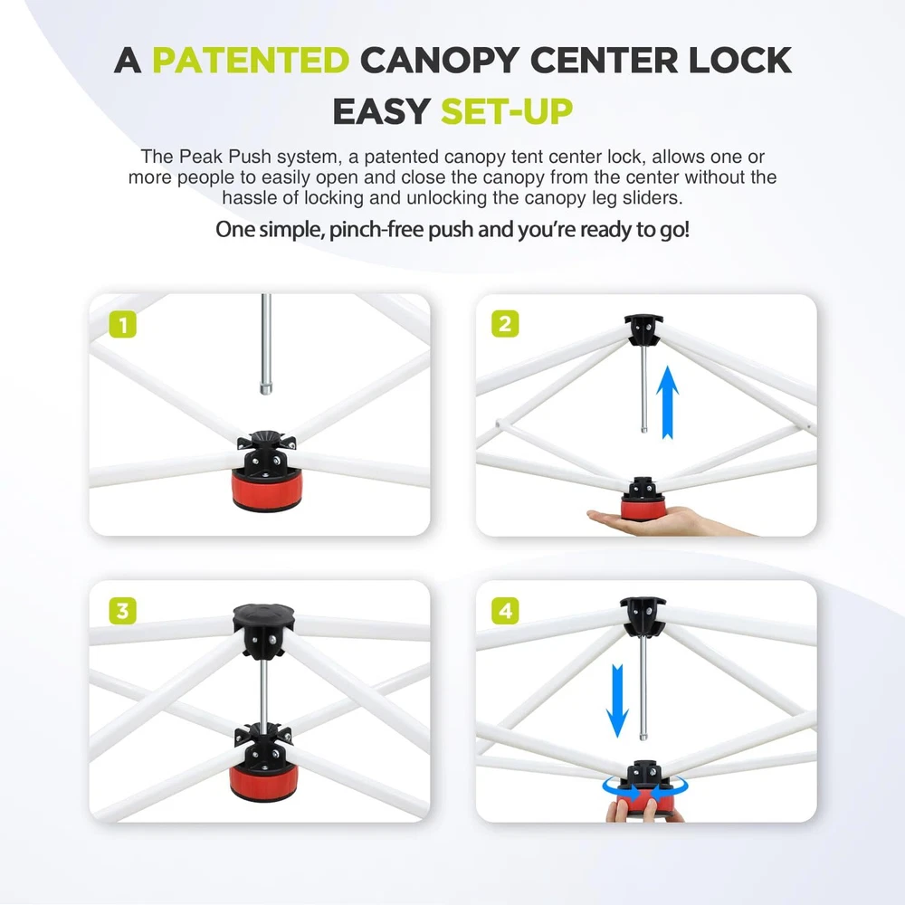 EASY SETUP: Say goodbye to complicated setups; this easy setup pop up canopy tent features the Peak Push system, a patented canopy center lock. This portable canopy requires no tools and easily opens and closes from the center in seconds. Its unique canopy tent center lock enables a seamless, one person setup, letting you maximize outdoor time with minimal effort EASILY ADJUSTABLE: The leg height has three settings to quickly adjust the canopy height and angle to maximize shade throughout the day. 64 square feet of shade, large enough for 5 people. (Slant leg design is 11'x11' at base and 9'x9' at the top) SUPERIOR QUALITY: UPF 50+ UV protection, water resistance, CPAI-84 flame resistance, 150D oxford fabric canopy top. Frame is powder-coated, rust-resistant, high-grade engineered steel, with hardened M5 bolts and nylon connection hardware for maximum durability COMPACT AND PORTABLE: Take this lightweight canopy anywhere with the 600x300D wheeled carrying bag; fits into most car trunks. Perfect for tailgates, the beach, the park or wherever your fun begins PROMISE: offers a 1-year limited after sale protection from the original date of purchase. Unlike many other canopy manufacturers, offers this for our frames, canopies and bags! If you have any other questions, please contact our professional service team