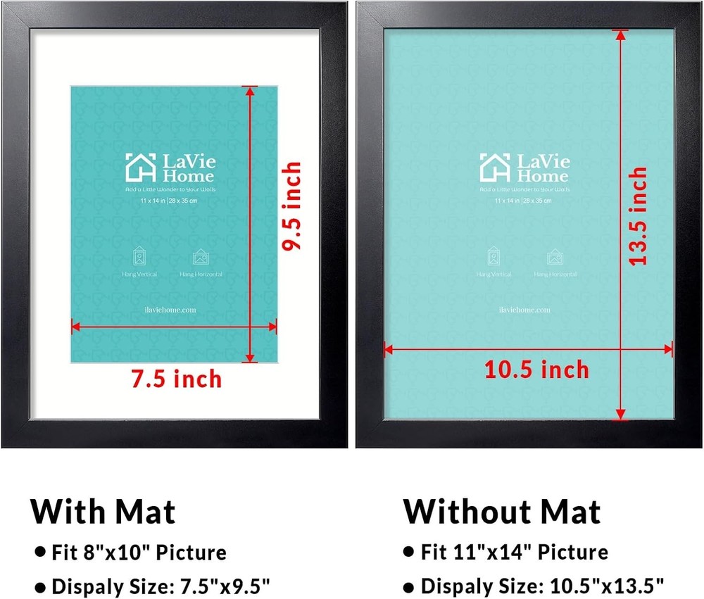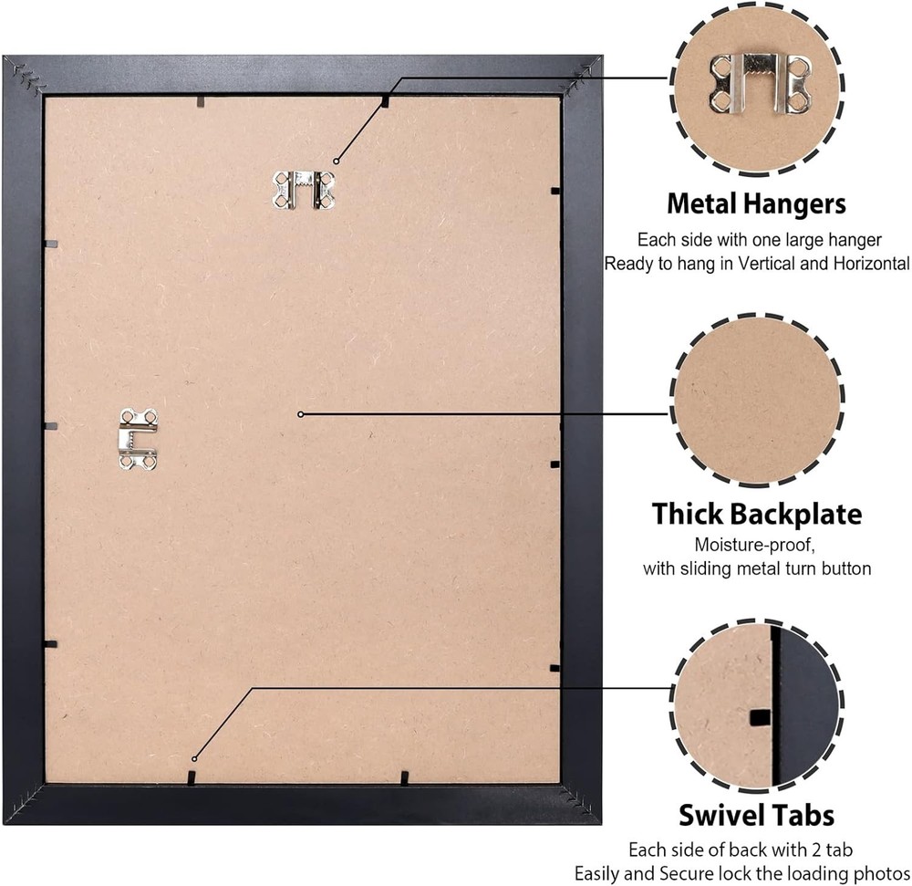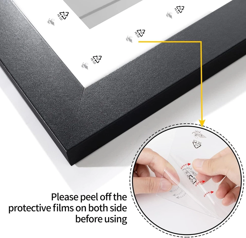 BRAND NEW GALLERY-STYLE SQUARE FRAME: Black 11x14 poster frame with thick moldings, perfect for your cherished memories and favorite posters. These black frames can be perfectly blended in any decorative style space. PREMIUM QUALITY - Crafted by Durable MDF molding construction, the frame's front has clear plexiglass and a sturdy backboard to keep the poster in place; load your posters, photos and memories easily, quickly, and securely. This gallery-style frame is very much focused on the point of stability. EASY TO INSTALL - This frame design with Small parts is easy to remove from the backing, comes with hooks, and is ready to hang artwork or photographs in either portrait or landscape orientation.To make it easier to remove the films on both sides of the plexiglass, it is suggested to lay it flat and then tear it open. PACKAGE INCLUDES - 1 pack 11x14 frame in a black finish, fits 11x14 picture without mat, 8x10 picture with mat, with plexiglass cover instead of glass, bring safe and higher definition. This plexiglass panel is covered with protective film on both sides, after removing it both sides will be very clear. Remember to tear them off. PROTECTIVE PACKAGING - Proprietary packaging helps ensure the safe delivery of fragile items. In case you are not satisfied with your frame, you are covered under our after-sales program and can contact us for prompt service.We are committed to providing you with perfect service. Thank You