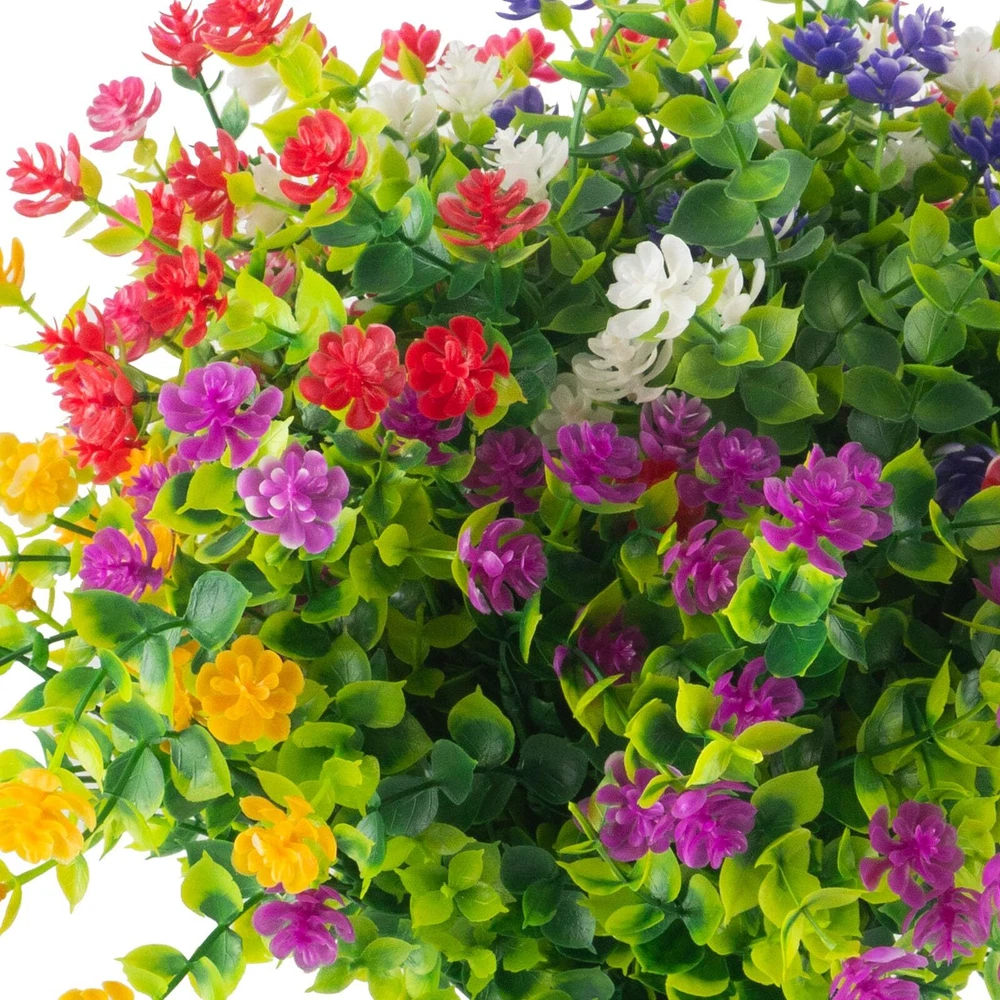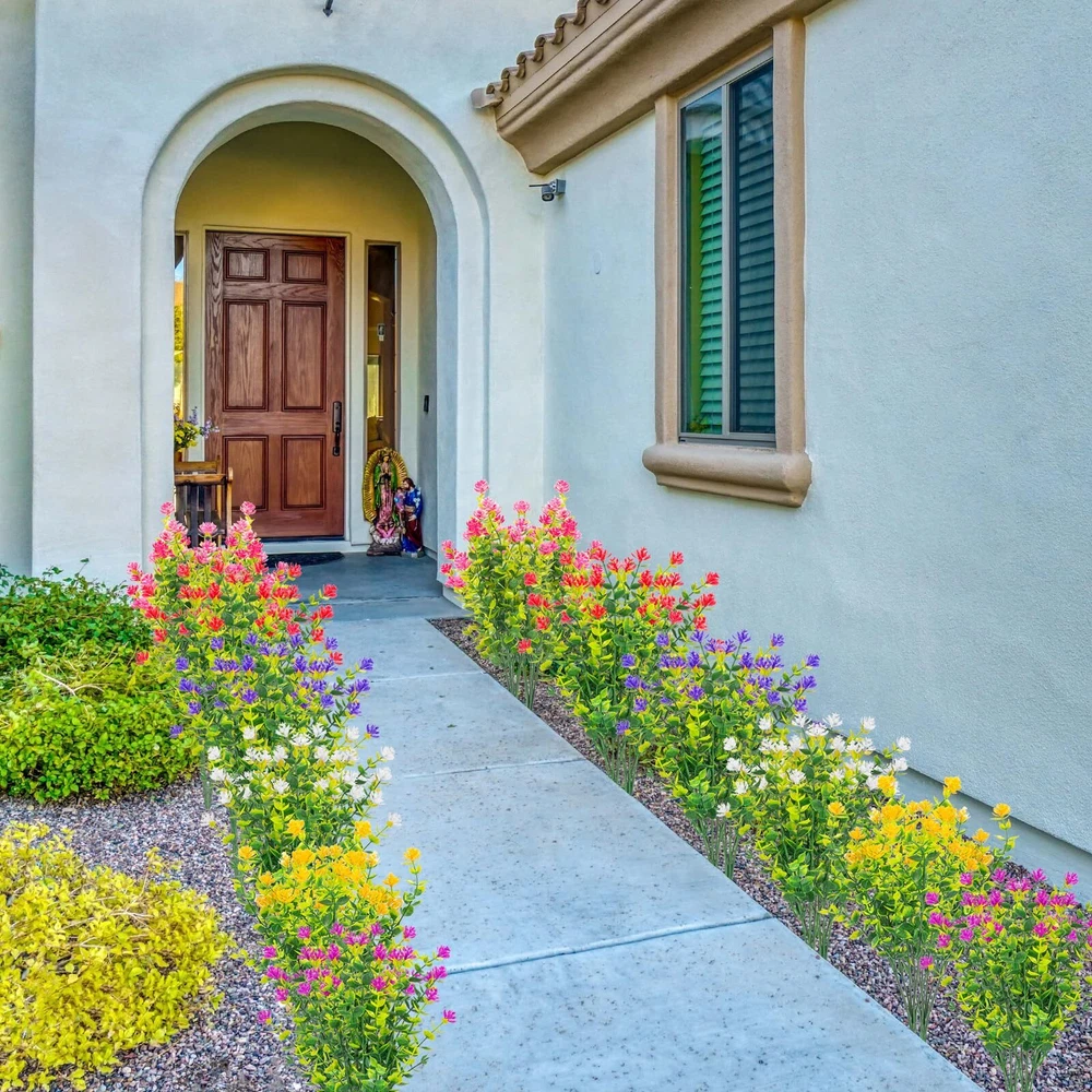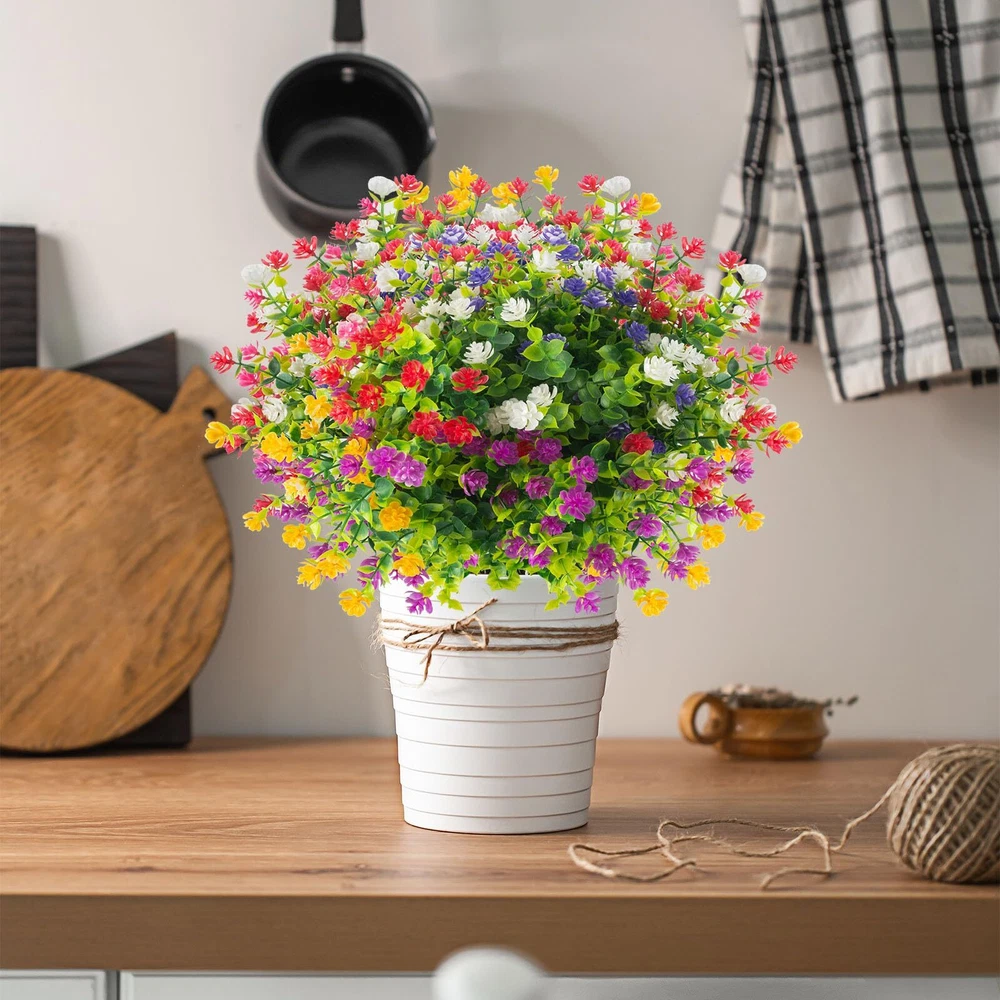 【Colorful with 6 colors】-You only need to make a one-time purchase, and there will be enough color mixing effects to surprise you!Each flower come as close to real as can be, offer true-to-life petal and foliage textures, especially under the ultraviolet rays of the sun, more durable and realistic, and the color is more vivid and atmospheric. 【UV RESISTANT AND SUITABLE】- The artificial eucalyptus flowers are truly UV resistant and never fade, adding a charming charm to your front porch, windowsill, garden, walkway, kitchen, living room, bedroom, patio and garden fence. Artificial plants are also great for everyday home garden decor, weddings, birthdays, holidays, shops, table centerpieces, wedding arrangements, bridal bouquets, bridal showers, baby showers, garlands and more. 【Fuller Size】 A pack of 12 artificial flowers(The most perfect blend of colors: bright red * 2, fuchsia * 2, purple * 2, yellow * 2, white * 2, pink * 2), each bunch is about 14 inches high x 9 inches wide, with 7 flexible stems, we add more bushy leaves to each bunch of eucalyptus flowers at the time of production, make the decorative effect more layered and the scene more vivid. 【Brand Promise】We carefully mix and match colors to enhance the decorative effect;The lush artificial shrub plants provide you with sunshine in spring at any time, light up the enthusiasm of summer, share the harvest of autumn, and bring greenery in winter; never fall, never wither. 100% satisfaction guarantee. 【Safety Materials】Natural and fresh color, non-toxic and harmless, 100% safe, environmentally friendly, generous and elegant, the new product is colorful and looks more real compared to the eucalyptus on the market.