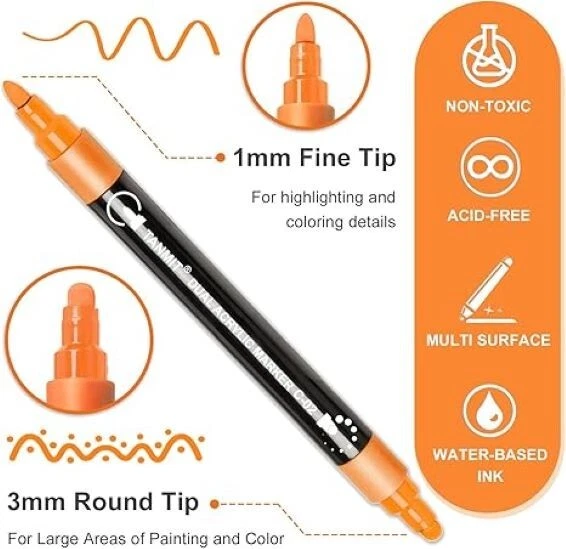 New Acrylic Markers: The upgraded Acrylic Paint Marker Pens does not need to shake the pen and press the pen head to release ink, but can be used to paint directly after getting the Acrylic Marker Pen; Acrylic markers are made with water-based ink, which allows for smooth and continuous painting, allowing for easy creation. The resulting images are brightly colored, resistant to fading, waterproof, and sun resistant, making them suitable for long-term preservation. High Quality Dual-tip: Each Acrylic Paint Marker Pens contains two types of wear-resistant fiber nibs, ensuring even ink output and more convenient painting; One side has a 3MM round tip, suitable for large-scale painting and coloring, while the other side has a 1MM fine tip, suitable for outlining, fine line work, saving the trouble of changing nibs, and bringing more convenience to your creation. When painting, using multiple colors layered on top of each other will not result in smudging or paper penetration. Standard Bright Color: Great Painting Pen Set contains 12 kinds of bright international standard colors, the colour is bright, strong and vivid, good opacity, just repeat few times to get stronger coverage. Each pen has a corresponding color number, you can more convenient to find the color you want, so that painting increases the possibility of more colors. Both beginners and professionals can better release your creativity! Widely Used Painting Graffiti Pen: Our 12-color acrylic dual tip markers works on almost all surfaces, you are no longer limited to paper but can work on rock painting, mugs, canvas, fabric, ceramic, tiles, glass, wood, leather, resin, tires, blackboard, Christmas ornament, jars labels, add decoration to graffiti markers, card making, pumpkin kits, easter eggs, and much more for both smooth and porous surfaces.The wide use brings more convenience to your art design. Perfect Gift Ideal: The use of simple methods, suitable for newcomers to play creative,Acrylic paint pens art supplies will be a personalized gift for your loved ones and painting rock lovers and create amazing art gifts for birthdays, Easter, Halloween, Christmas, Valentine's Day, Thanksgiving, New Year or special holiday gifts. DIY unique gifts to bring color to your life and create decorations