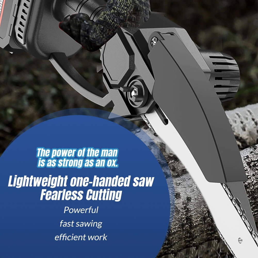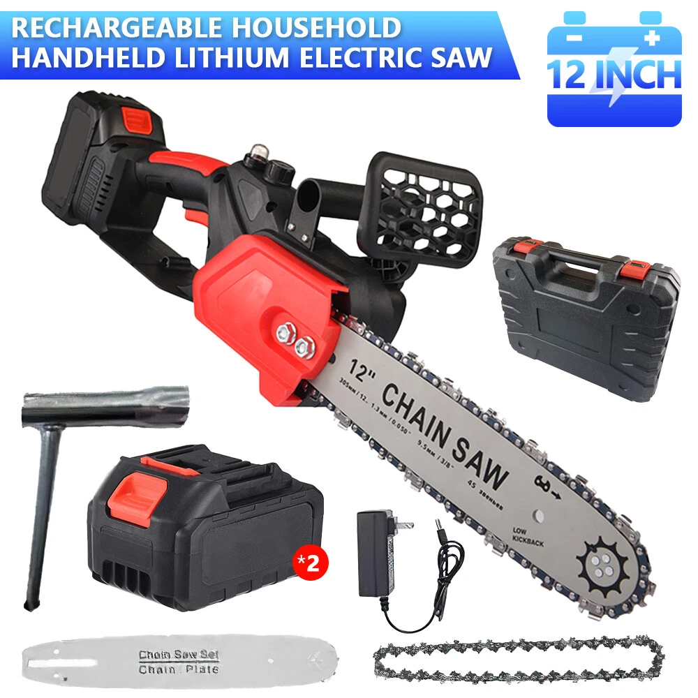 Red - 12" Chainsaw Features: Our 12-inch electric chain saw has an upgraded high-efficiency brushless motor with reliable and efficient performance. The motor also reduces noise, making it an ideal tool for quiet and smooth cutting. Powerful brushless motor, large capacity and high working efficiency. Dust-proof cooling net can prevent foreign objects from entering the motor, which can effectively dissipate heat and will not burn the machine. Our hand-held cordless chainsaw weighs only 4.85 pounds, which is compact, convenient and easy to carry around. It can be used with one hand, and it is not easy to get tired after long-term use. Even the elderly and women can easily control it. Our cordless chainsaws are widely used in gardens, farms, parks, forests, pastures, orchards and indoors to meet all your cutting needs. If you go camping, you can also take this cordless chainsaw with you. Our mini super saw is also a perfect gift for dad, friends and husband. In this mini chainsaw kit, you will get everything you need. Specifications: Voltage: 21V Power: 1100W Idle Speed: 0-3500r/min (Sprocket Speed) Chain Speed: 8.0m/s Chain Specification: 3/8 Guide Plate Size: 12 inches Maximum Cutting Diameter: 285mm Scope of Application: Pruning, Chopping Wood and Logging. Package Contains: 1 x Chainsaw 2 x Battery 1 x Charger 1 x Guide Plate 1 x Socket Wrench 1 x Chain 1 x Storage Box 1 x English Instruction Manual Black - 8" & 6" Chainsaw LARGE-CAPACITY BATTERY: Rechargeable lithium battery chainsaw, powerful lithium battery, wireless binding, free cutting, 6000mAh lithium battery life is greatly improved. HIGH-QUALITY CHAIN: After deep quenching treatment to ensure smooth cutting, the wooden tooth design can make the chain saw stuck in the branch, more effective and faster cutting. The tungsten steel ball material does not need to be lubricated, which reduces the resistance of the machine during use, reduces the wear of the machine, and increases the service life BUY ONE EQUALS TWO: Upgraded 8/6 Inch chain switch design, allows you to switch 2 length of chains easy and quickly for multi-purpose use when cutting/trimming different size of trees/branches as you like. 8 inch chain for larger thicker wood cutting (6-10inch diameter); 6inch chain for regular size wood cutting(0-6inch diameter). SAFETY CHAINSAW: This small chainsaw has a safety switch, you need to hold down the safety lock and trigger at the same time to start the saw to prevent accidental; Anti-splash baffle prevents wood chips from splashing during work. PERFECT GIFT : Mini chain saw is an excellent alternative for all kinds of the household, garden, yard, or farm projects. It is suitable for wood cutting, tree limbs chopping, branch pruning, gardening and more. Perfect Gift for Dad, Friends, husband. COMPLELETLY ACCESSORIES : , 1 x Electric Chainsaw, 2 x battery, 1 x 8-inch saw blade, 1 x 6-inch saw blade, 2 x 8" chain, 2 X 6" chain, 1 x Charger, 1 x Screwdriver,1 x Suitcase.