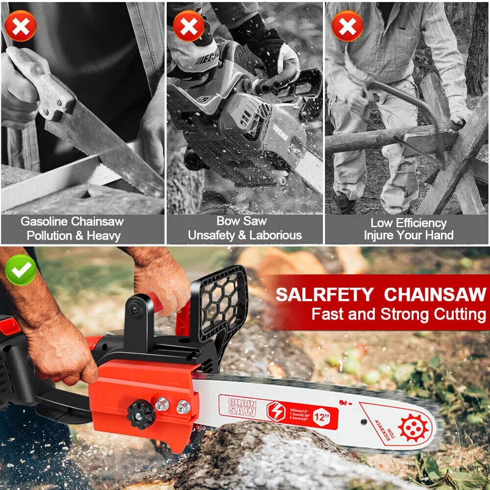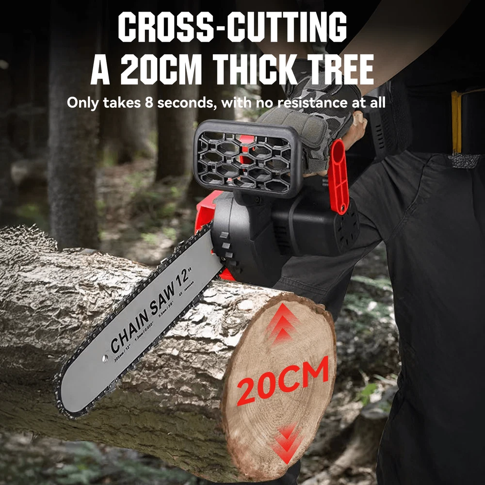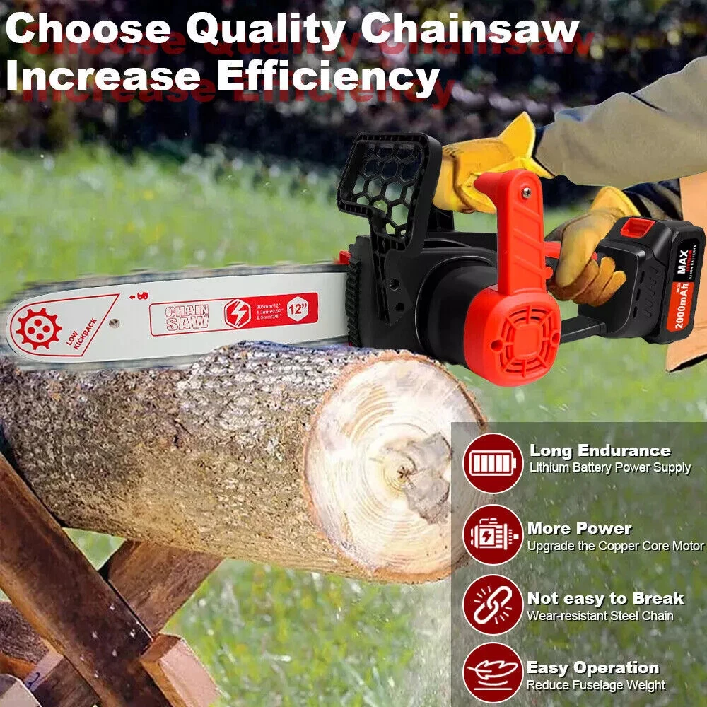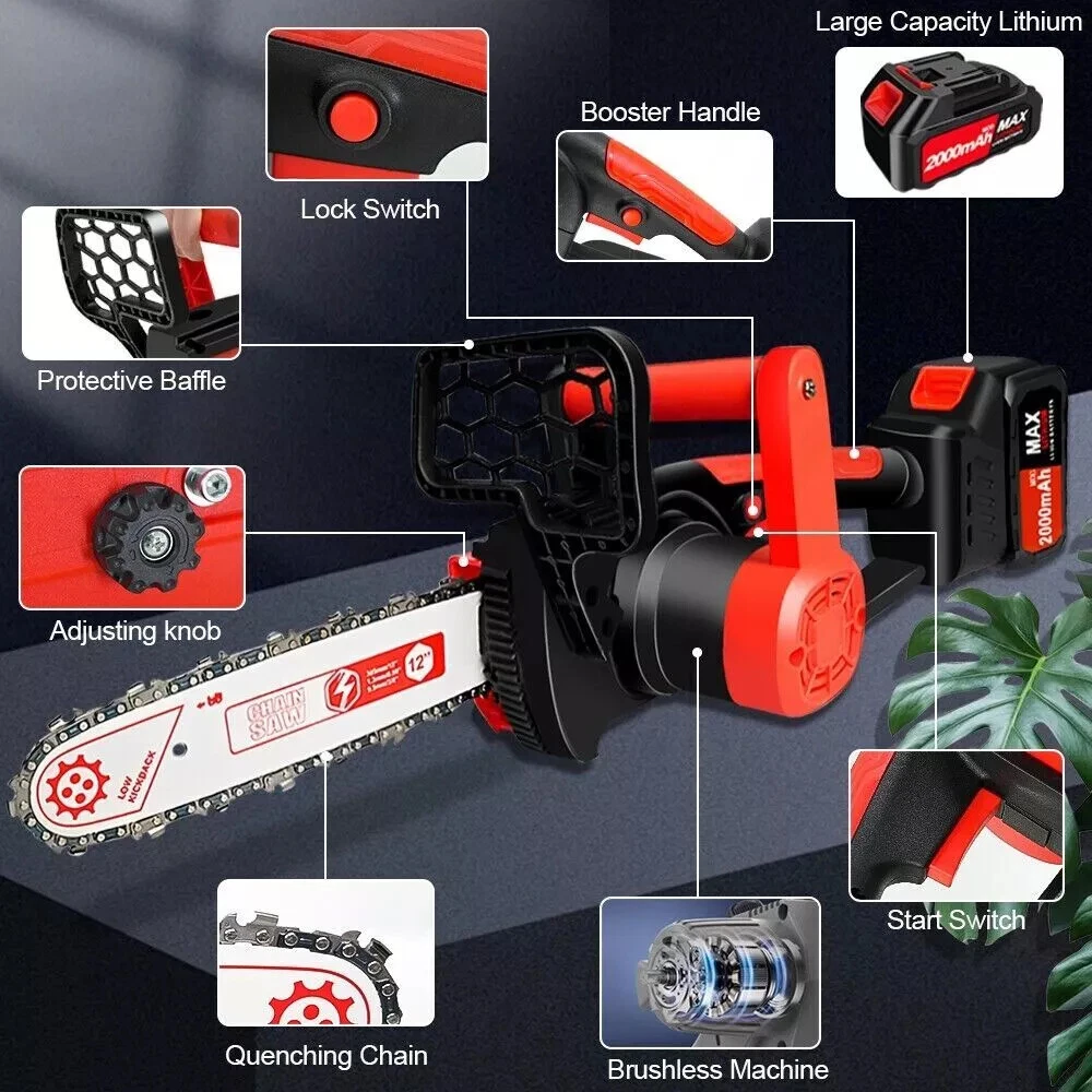 Product Description: Why Choose Our Chainsaw? --Upgrade the powerful copper motor, strong power, load capacity, and cutting efficiency is higher. Getting rid of the clunkiness and ineffectiveness of traditional tools makes your job easier and saves you a lot of money. Width Usage --Whether you're gardening, ranching, camping, or home DIY , this Mini Chainsaw has you covered. Must-Have Investment -- Easy to Use & Save Time Hand Tool Featu res: 【Upgraded High-Power Pure Copper Motor】 This chainsaw is equipped with an upgraded high-power pure copper motor, providing an unprecedented cutting experience. It ensures continuous efficient operation and can easily handle various cutting tasks, from small branches to thick trunks. 【High-Capacity Battery, Long-Lasting】 Equipped with two 1.5Ah high-capacity batteries, this chainsaw offers impressive battery life. The batteries can be recharged over 3000 times, meeting your long-term cutting needs. Additionally, the batteries feature overload and temperature protection, ensuring stable performance and longer life. 【 Compact and Portable, Easy to Use 】 The compact suitcase design is practical, acco mmodating all components perfectly and making it easy to carry. The chainsaw is 99% assembled and ready to use in just one second by inserting the battery, allowing you to start cutting immediately. 【Automatic Oiling System, Extended Lifespan】 This chainsaw features an automatic oiling system that provides the chain with the right amount of lubrication during operation. This reduces the hassle of manual lubrication, minimizes wear on the chain, and extends the chainsaw’s lifespan. 【Safe and Reliable, Triple Protection】 This chainsaw adopts the strictest triple safety measures. First, the safety lock ensures the chainsaw can only be activated by pressing two different buttons simultaneously, preventing accidental activation. Second, the blade guard activates when pressing with the other hand, preventing injuries. Lastly, the handle guard keeps your hand completely separated from the chain, ensuring your safety during operation. 【Wide Usage, Versatile】 This handheld chainsaw is suitable for wood cutting, tree pruning, and various gardening tasks. It is an excellent helper for farms, gardens, and home DIY projects. Whether felling wood, pruning branches, or performing other cutting tasks, it can handle them with ease, making your work more efficient and convenient. Specifications: Type: Chainsaw Color: Red Number of Batteries: 2 Battery Voltage: 21V Charging Time: 1-2 Hours Output Power: 1800W Charging Method: DC Cutting Diameter: Approx. 30 cm Carton Dimensions: 35.5×20.5×15.5 cm / 14×8×6.1 in Plastic Case Dimensions: 38.5×27×16 cm / 15.2×10.6×6.3 in Weight: Approx. 2.5 kg without battery Product Dimensions: Body Length 69 cm, Guide Bar Length 30.3 cm, Main Body Length 40 cm, Handle Length 12 cm Item Incl uded: 1× 12-Inch Chainsaw 2× 1.5Ah Batteries 3× Chains 2× Guide Bars 1× Guard Plate 1× US Standard Charger 1× Box This chainsaw is equipped with an upgraded high-power pure copper motor, providing an unprecedented cutting experience. It ensures continuous efficient operation and can easily handle various cutting tasks, from small branches to thick trunks. Equipped with two 1.5Ah high-capacity batteries, this chainsaw offers impressive battery life. The batteries can be recharged over 3000 times, meeting your long-term cutting needs. Additionally, the batteries feature overload and temperature p rotection, ensuring stable performance and longer life . The compact suitcase design is practical, accommodating all components perfectly and making it easy to carry. The chainsaw is 99% assembled and ready to use in just one second by inserting the battery, allowing you to start cutting immediately . This chainsaw adopts the strictest triple safety measures. First, the safety lock ensures the chainsaw can only be activated by pressing two different buttons simultaneously, preventing accidental activation. Second, the blade guard activates when pressing with the other hand, preventing injuries. Lastly, the handle guard keeps your hand completely separated from the chain, ensuring your safety during operation. This chainsaw features an automatic oiling system that provides the chain with the right amount of lubrication during operation. This reduces the hassle of manual lubrication, minimizes wear on the chain, and extends the chainsaw’s lifespan. This handheld chainsaw is suitable for wood cutting, tree pruning, and various gardening tasks. It is an excellent helper for farms, gardens, and home DIY projects. Whether felling wood, pruning branches, or performing other cutting tasks, it can handle them with ease, making your work more efficient and convenient .