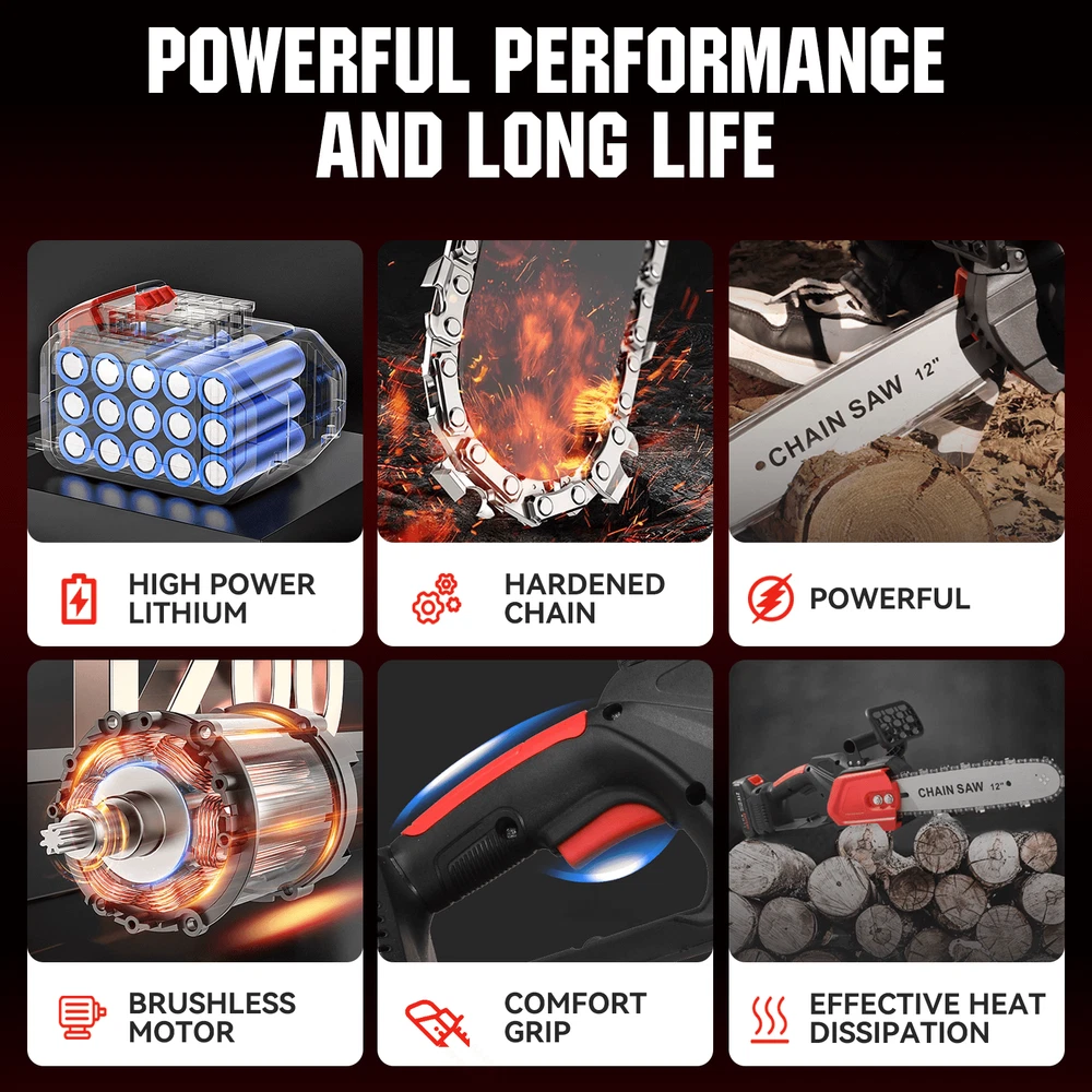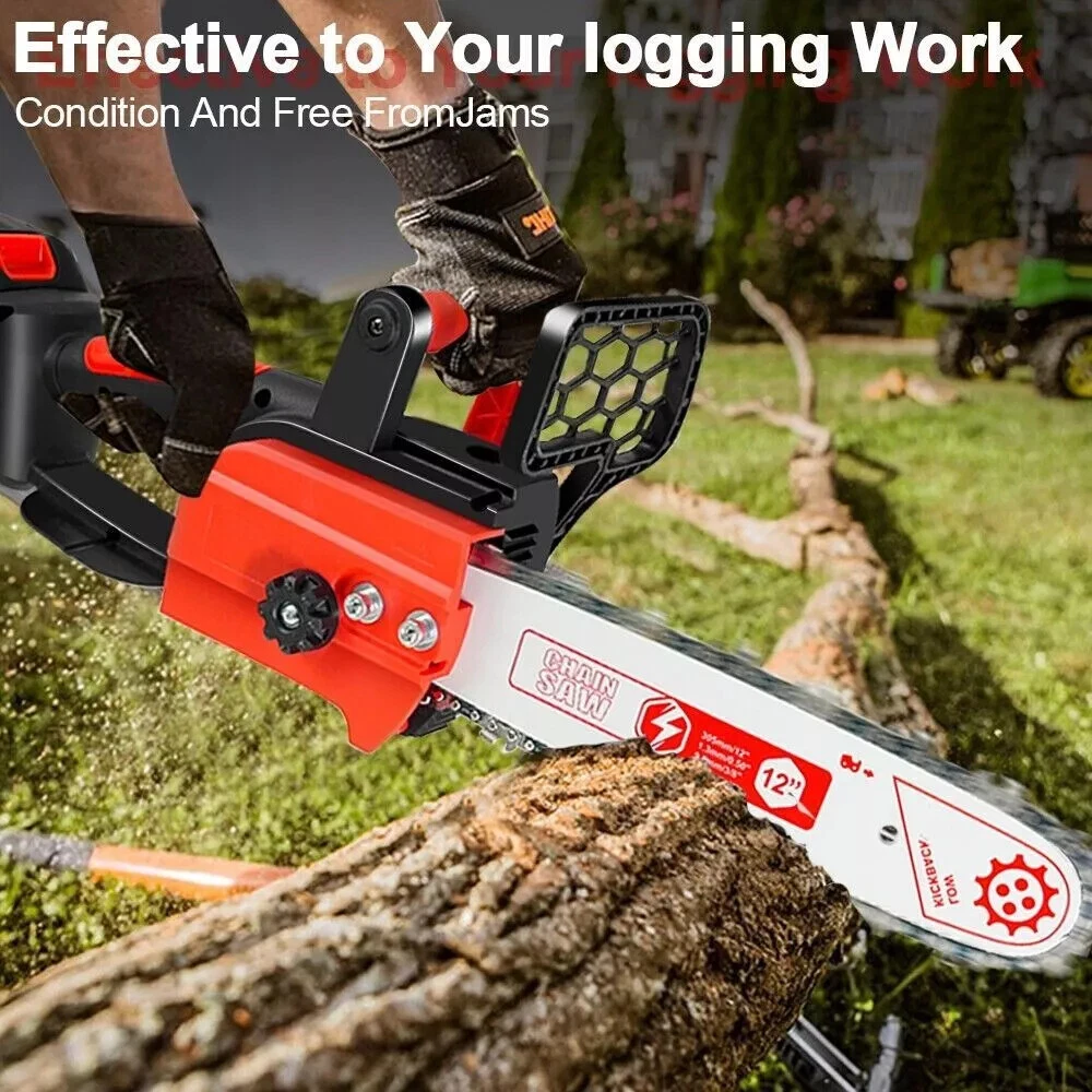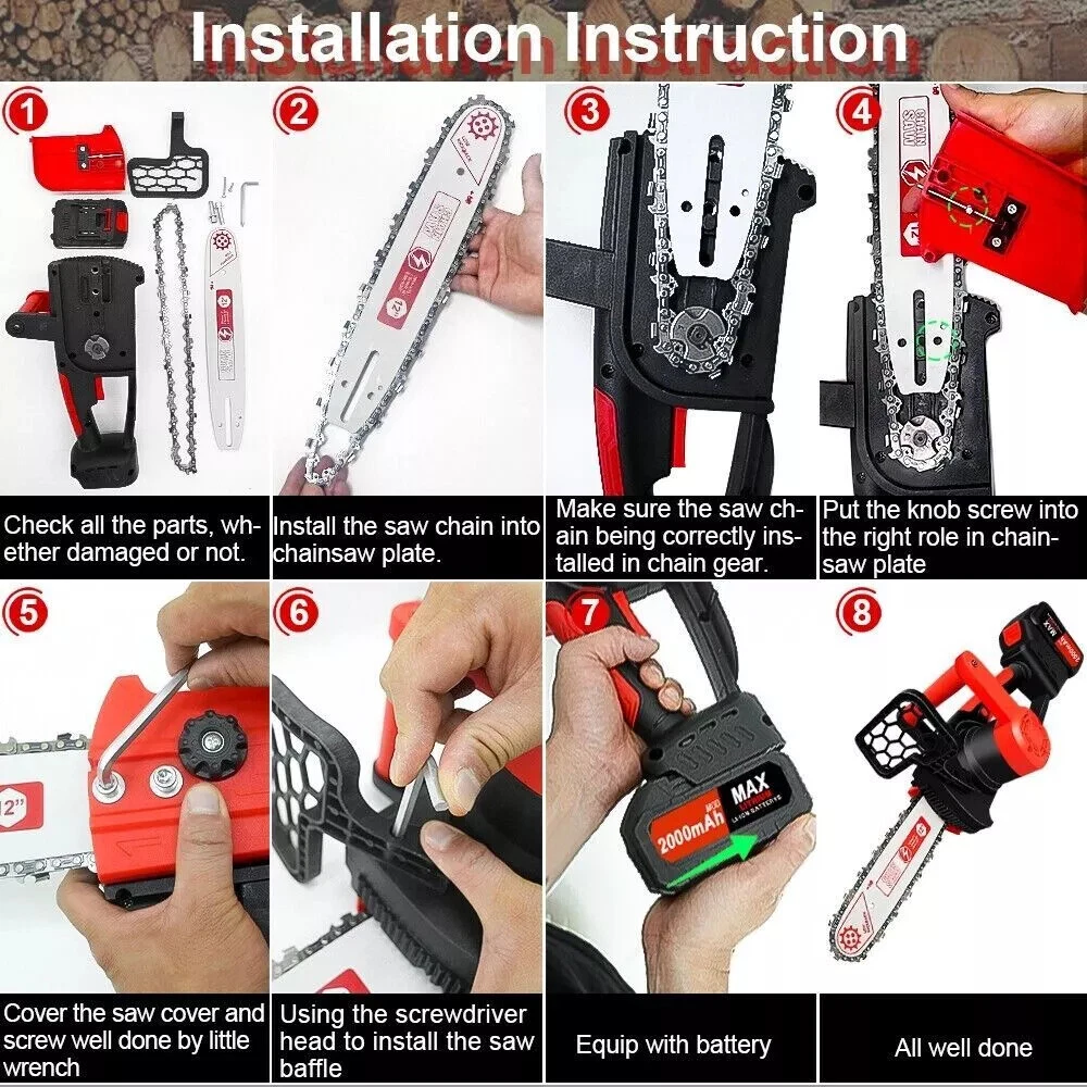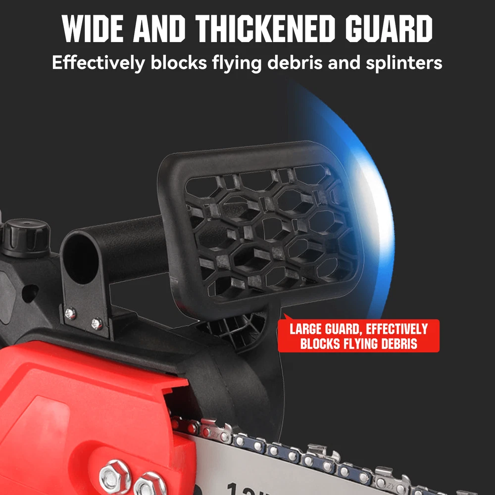 Product Description: Why Choose Our Chainsaw? --Upgrade the powerful copper motor, strong power, load capacity, and cutting efficiency is higher. Getting rid of the clunkiness and ineffectiveness of traditional tools makes your job easier and saves you a lot of money. Width Usage --Whether you're gardening, ranching, camping, or home DIY , this Mini Chainsaw has you covered. Must-Have Investment -- Easy to Use & Save Time Hand Tool Featu res: 【Upgraded High-Power Pure Copper Motor】 This chainsaw is equipped with an upgraded high-power pure copper motor, providing an unprecedented cutting experience. It ensures continuous efficient operation and can easily handle various cutting tasks, from small branches to thick trunks. 【High-Capacity Battery, Long-Lasting】 Equipped with two 1.5Ah high-capacity batteries, this chainsaw offers impressive battery life. The batteries can be recharged over 3000 times, meeting your long-term cutting needs. Additionally, the batteries feature overload and temperature protection, ensuring stable performance and longer life. 【 Compact and Portable, Easy to Use 】 The compact suitcase design is practical, acco mmodating all components perfectly and making it easy to carry. The chainsaw is 99% assembled and ready to use in just one second by inserting the battery, allowing you to start cutting immediately. 【Automatic Oiling System, Extended Lifespan】 This chainsaw features an automatic oiling system that provides the chain with the right amount of lubrication during operation. This reduces the hassle of manual lubrication, minimizes wear on the chain, and extends the chainsaw’s lifespan. 【Safe and Reliable, Triple Protection】 This chainsaw adopts the strictest triple safety measures. First, the safety lock ensures the chainsaw can only be activated by pressing two different buttons simultaneously, preventing accidental activation. Second, the blade guard activates when pressing with the other hand, preventing injuries. Lastly, the handle guard keeps your hand completely separated from the chain, ensuring your safety during operation. 【Wide Usage, Versatile】 This handheld chainsaw is suitable for wood cutting, tree pruning, and various gardening tasks. It is an excellent helper for farms, gardens, and home DIY projects. Whether felling wood, pruning branches, or performing other cutting tasks, it can handle them with ease, making your work more efficient and convenient. Specifications: Type: Chainsaw Color: Red Number of Batteries: 2 Battery Voltage: 21V Charging Time: 1-2 Hours Output Power: 1800W Charging Method: DC Cutting Diameter: Approx. 30 cm Carton Dimensions: 35.5×20.5×15.5 cm / 14×8×6.1 in Plastic Case Dimensions: 38.5×27×16 cm / 15.2×10.6×6.3 in Weight: Approx. 2.5 kg without battery Product Dimensions: Body Length 69 cm, Guide Bar Length 30.3 cm, Main Body Length 40 cm, Handle Length 12 cm Item Incl uded: 1× 12-Inch Chainsaw 2× 1.5Ah Batteries 3× Chains 2× Guide Bars 1× Guard Plate 1× US Standard Charger 1× Box This chainsaw is equipped with an upgraded high-power pure copper motor, providing an unprecedented cutting experience. It ensures continuous efficient operation and can easily handle various cutting tasks, from small branches to thick trunks. Equipped with two 1.5Ah high-capacity batteries, this chainsaw offers impressive battery life. The batteries can be recharged over 3000 times, meeting your long-term cutting needs. Additionally, the batteries feature overload and temperature p rotection, ensuring stable performance and longer life . The compact suitcase design is practical, accommodating all components perfectly and making it easy to carry. The chainsaw is 99% assembled and ready to use in just one second by inserting the battery, allowing you to start cutting immediately . This chainsaw adopts the strictest triple safety measures. First, the safety lock ensures the chainsaw can only be activated by pressing two different buttons simultaneously, preventing accidental activation. Second, the blade guard activates when pressing with the other hand, preventing injuries. Lastly, the handle guard keeps your hand completely separated from the chain, ensuring your safety during operation. This chainsaw features an automatic oiling system that provides the chain with the right amount of lubrication during operation. This reduces the hassle of manual lubrication, minimizes wear on the chain, and extends the chainsaw’s lifespan. This handheld chainsaw is suitable for wood cutting, tree pruning, and various gardening tasks. It is an excellent helper for farms, gardens, and home DIY projects. Whether felling wood, pruning branches, or performing other cutting tasks, it can handle them with ease, making your work more efficient and convenient .