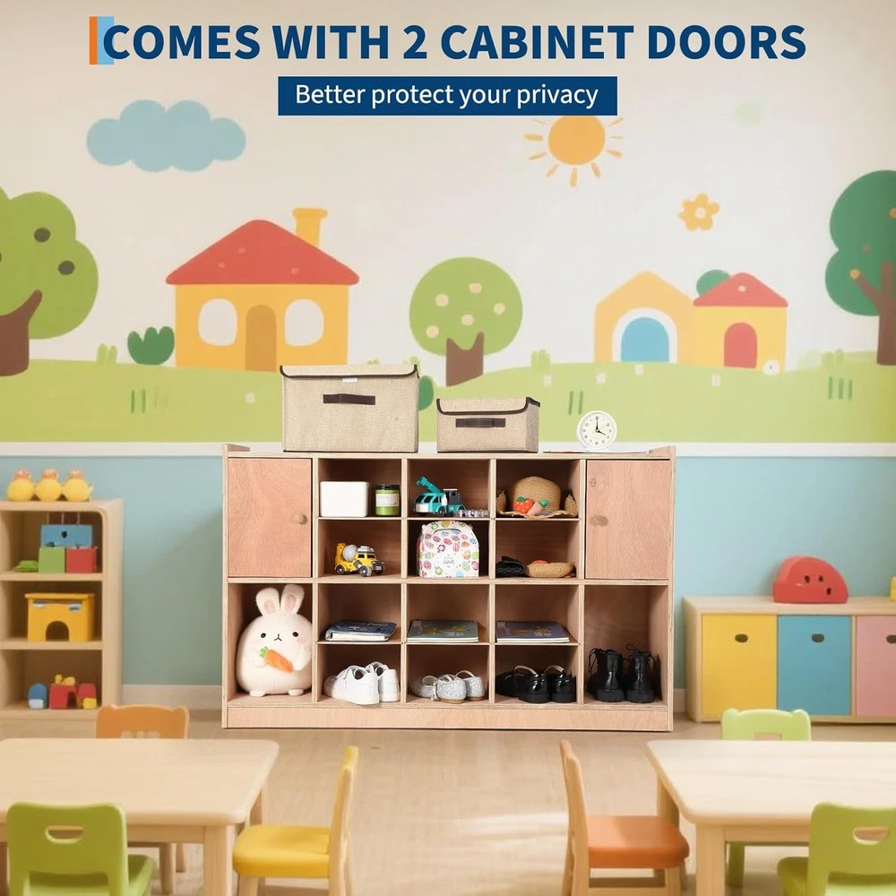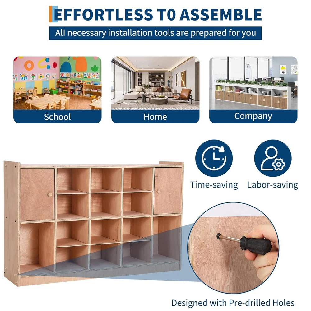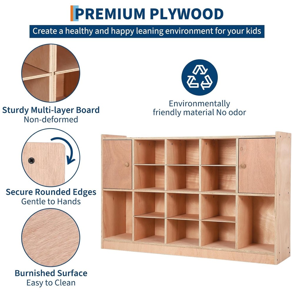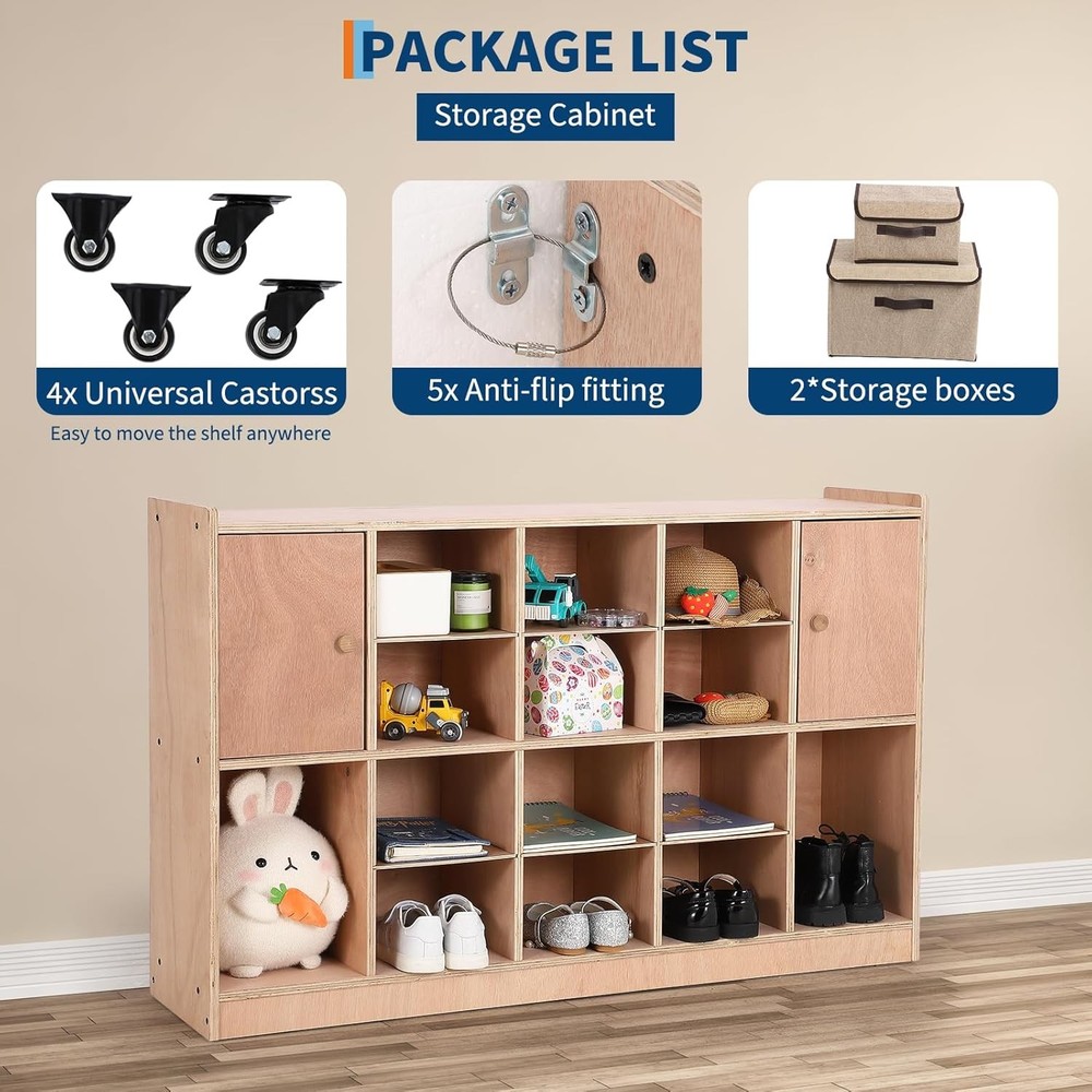 Product description Child-Safe & Anti-Tip Design: Equipped with 5 anti-flip fittings and wall-anchoring system to prevent climbing accidents, ensuring stability and safety in homes, schools, or daycare centers. Rounded edges protect kids from injuries. Eco-Friendly & Durable Construction: Made with premium multi-layer plywood-non-toxic, odor-free, and warp-resistant. Ideal for eco-conscious families prioritizing health and longevity. Effortless Assembly & Mobility: Pre-drilled holes and included tools make setup quick and hassle-free. 4 universal castors allow easy movement, while the kids-friendly height (47.6"H) ensures accessibility for little ones. Versatile Storage with Privacy: Features 2 cabinet doors to safeguard belongings and 2 storage boxes for organization. Perfect for toys, books, or classroom supplies. Complete Package for Immediate Use: Includes everything needed: cabinet, castors, anti-tip fittings, boxes, and tools. Save time and effort-ready for home, school, or office use right out of the box! Sturdy Multi-layer Board Meet storage needs for clothes, backpacks, school supplies, and personal items. With ample storage space and a flexible layout Durable Playwood Material We choose thick, multi-ply wood panels to make it more stable for longer use. Secure Rounded Edges Gentle to Hands. Prevent children from bumping into the corners Pre-drilled Holes Time- and Labor-saving. Easy to install