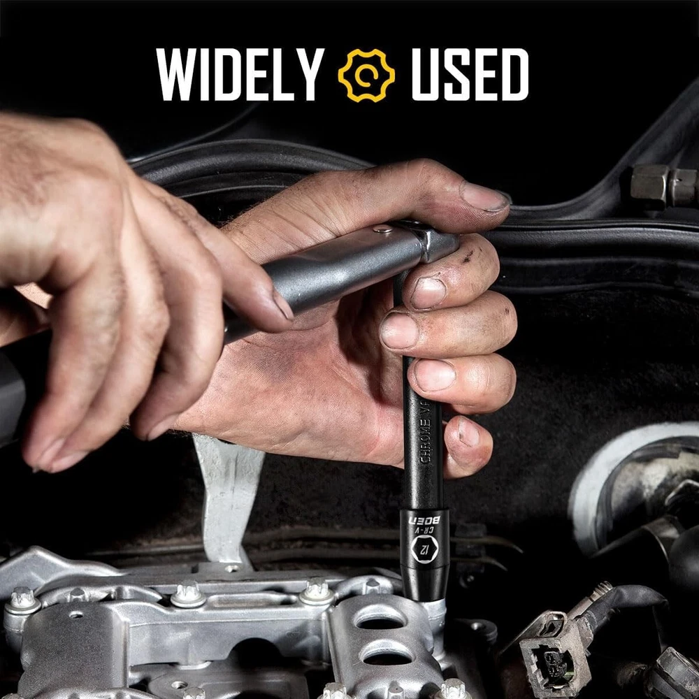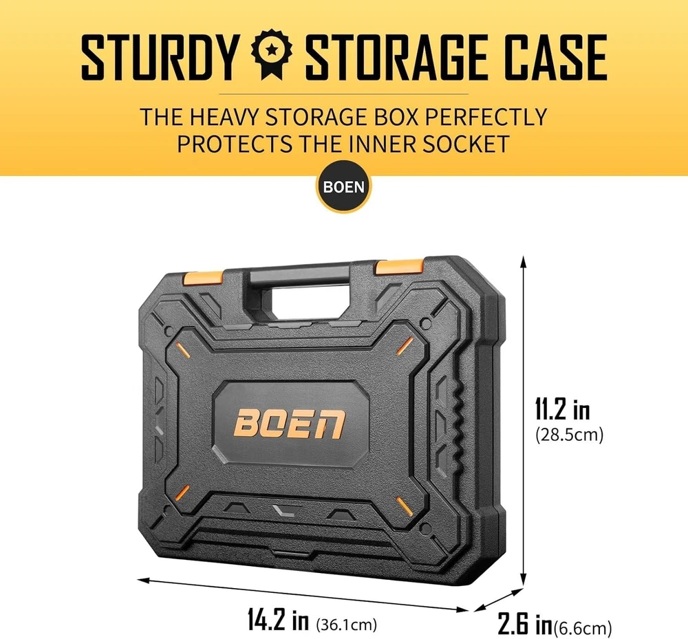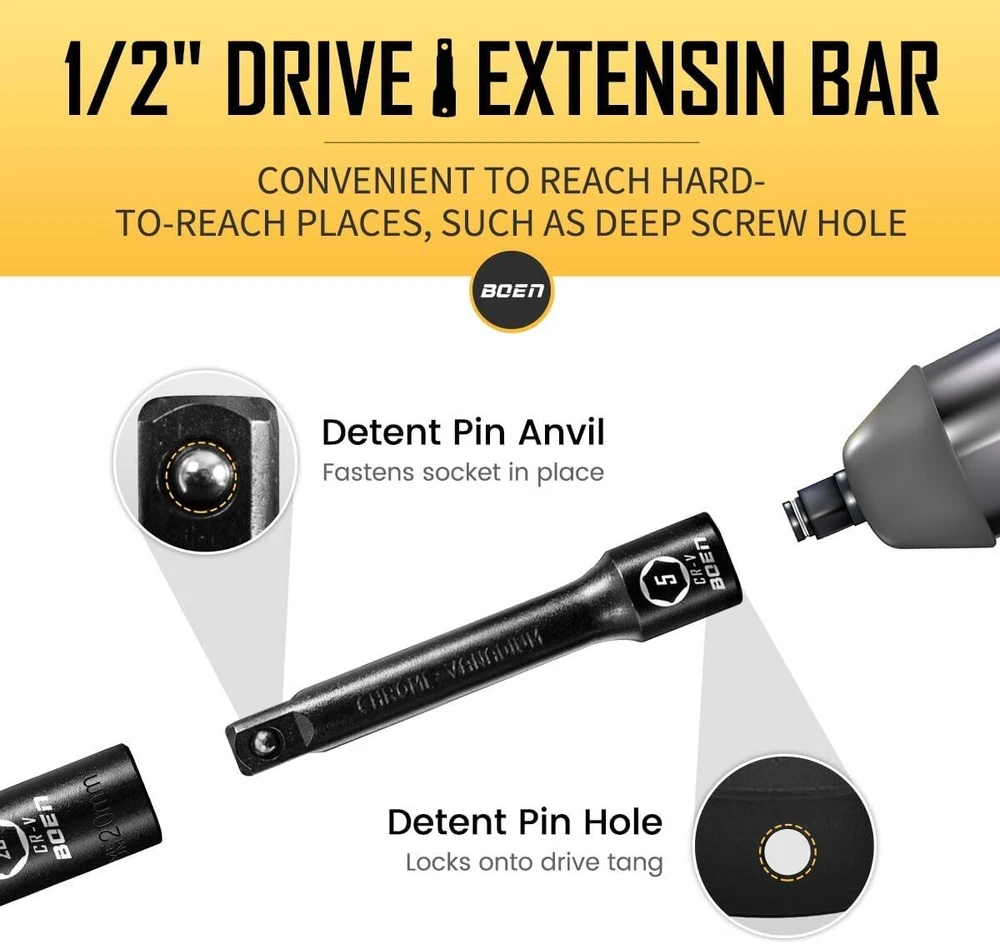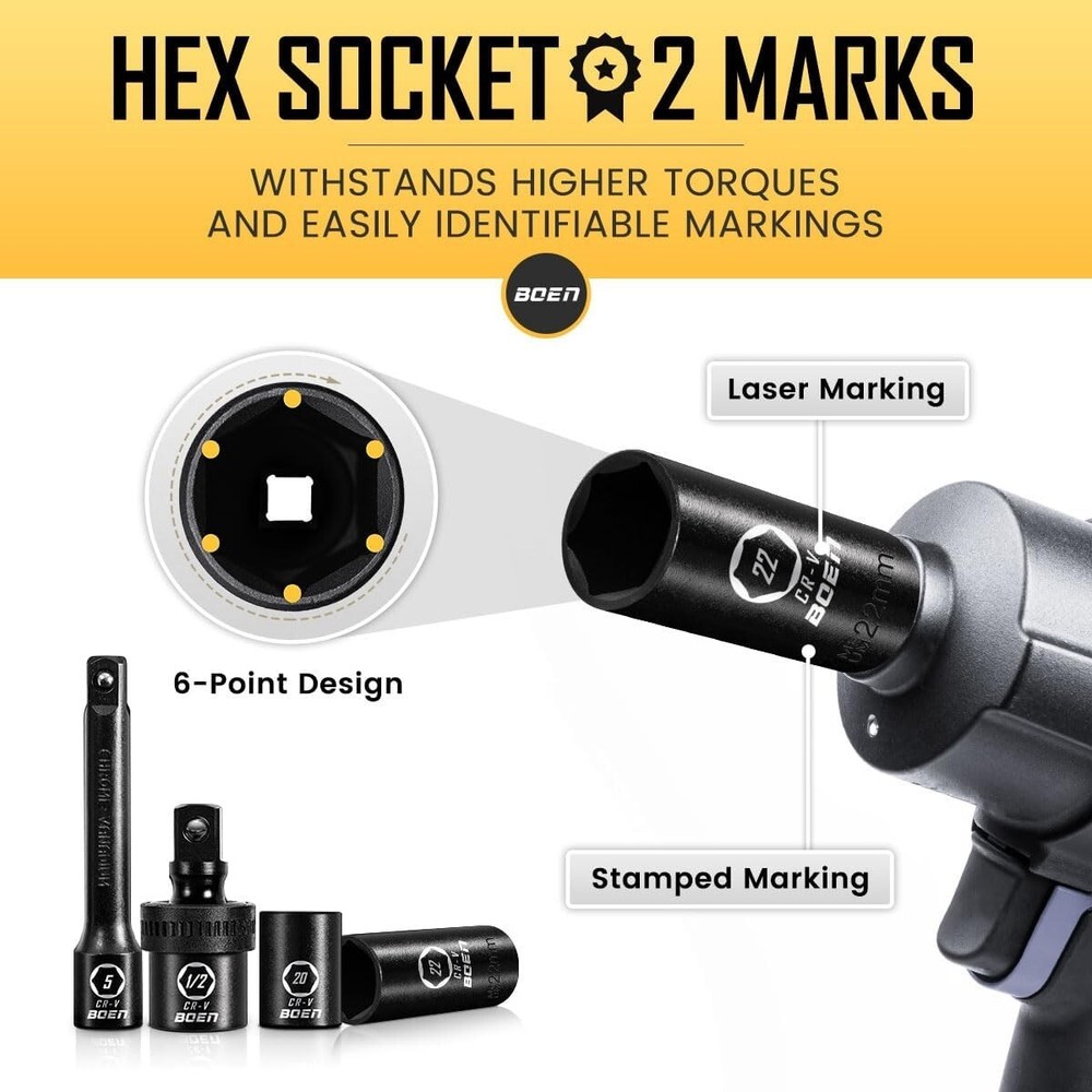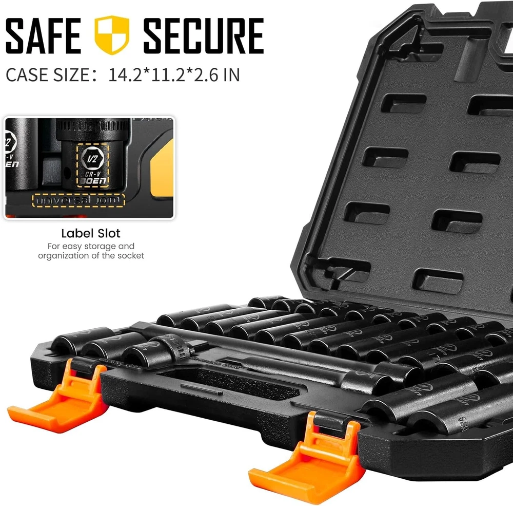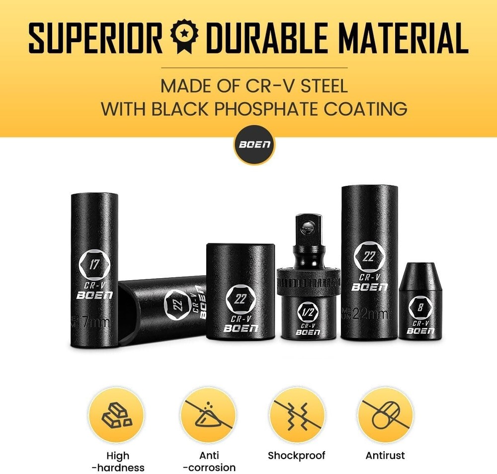 1/2" Drive Impact Socket Set, 33 Piece Deep & Shallow Metric Socket Set 8mm to 22mm, Includes 5", 10" Extension Bars, Universal Joint, 6 Point Design, Cr-V Steel, Meets ANSI Standards ✅【1/2" SOCKET SET】 Set included: 8、9、10、11、12、13、14、15、16、17、18、19、20、21、22mm deep & shallow sockets ; 5", 10"extension bar; 1/2" universal joint. The extension bar can help you turn the bolts and nuts located in the deep recessed part. Suitable for the maintenance of various types of fasteners on the vehicle. ✅【SUPERIOR CR-V STEEL】 Constructed with heat-treated forged chrome vanadium steel, our 1/2" impact socket set has high hardness and durability, and can withstand greater torque from impact tools. The sturdy and professional chrome vanadium alloy structure allows you to undertake different projects. ✅【FASTENED 6-POINT DESIGN】 The recessed hexagonal nut is easier to embed, which can grasp the stubborn fasteners without falling off. The 6-point lateral drive design prevents the sockets from rounding under the high torque output, making them maintain integrity without deformation. ✅【DURABLE & LASER MARKING】 Different from the traditional black oxide coating, impact socket set 1/2 dirve adopts black manganese phosphate coating to provide excellent corrosion resistance and rust resistance for long-term use. Laser markings make all model numbers easy to keep, read and quick identification. ✅【STAY ORGANIZED & PORTABLE】 The heavy-duty blow-molded shell tightly wraps all the parts to avoid damage. Blow-molded enclosure with label slot for easy storage and organization of the socket. You can easily take it to the garage or outdoors to fix your car tires and other problems. ✅【QUALITY & SERVICE SATISFACTION GUARANTEE】 The impact socket set meets ANSI standards. We provide satisfaction. All 1/2" drive socket set have been rigorously tested to ensure the best performance and durability. If you have any questions, please feel free to contact me. ✅ 【NOTE】Please rest assured that this is a normal new set, if there is a layer of oil on the socket of the set you received. It's a specially painted anti-rust oil to protect the product. Please be careful when using it.