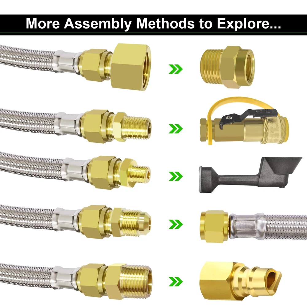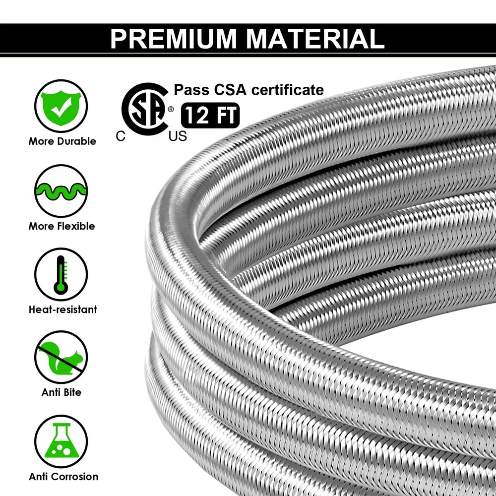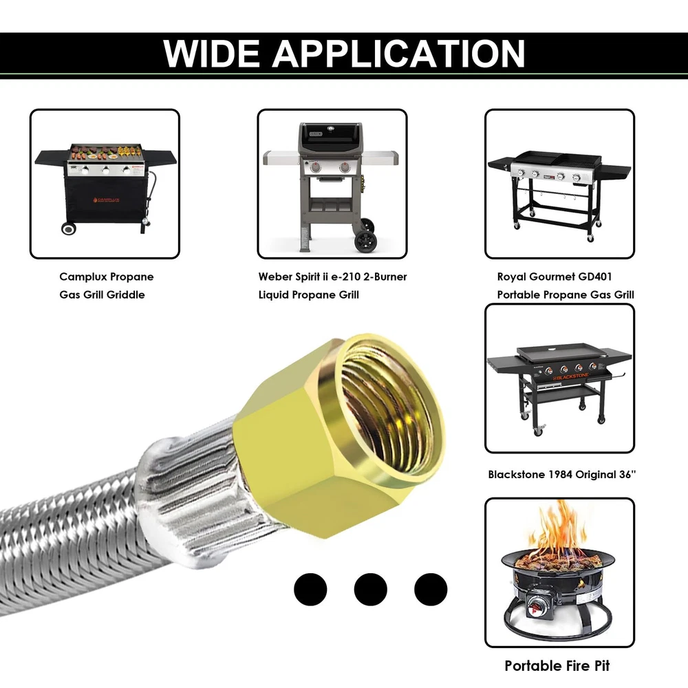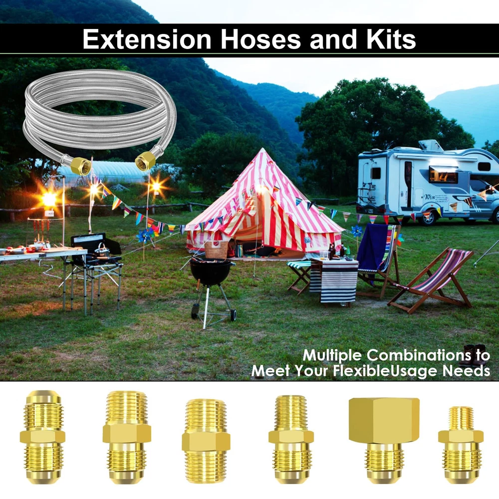 12 FT High Pressure Braided Propane Hose Extension with Conversion Coupling 3/8" Flare to 1/2" Female NPT, 1/4" Male NPT, 1/8" NPT Male,3/8" Male NPT, 3/8" Male Flare for BBQ Grill, Fire Pit, Heater 【MEFUN Upgraded 12 FT 350 PSI high-pressure Propane extension Hose】12ft stainless steel propane high pressure extension hose upgrade to come with powerful 6 different couplings adapter fitting: 3/8" NPT Male x 3/8" NPT Male, 1/2" Female NPT x 3/8" Flare Male, 3/8" NPT Male x 3/8" Flare Male, 3/8" Flare Male x 3/8" Flare Male, 1/4" NPT Male x 3/8" Flare Male, 1/8" NPT Male x 3/8" Flare Male, 【Premium Material】12ft 3/8" female flare fittings on both ends and 6 different types of adapters fittings kit of this 3/8" propane hose are made of 100% Solid Brass to ensure secure and durable for long-lasting to use. The 12ft 3/8” Female Flare propane hose is made of durable stainless steel braided with anti corrosion, anti-aging, air tightness, heat-resistance, flexibility features. This propane extension hose with CSA Certification, ensures air tightness and stability. 【Wide Compatibility】This 12FT 350 PSI high pressure propane extension hose has female 3/8" ends on both sides, connect an appliance equipped with a 3/8" male flare fitting. For extending the propane tank line on your LP appliance and fire pit table. Compatible with RV, gas grill, stove, propane heater, portable fire pit,griddle, propane generator, portable generator, propane smoker, burner and more. 【Standard Fittings】This 12FT 350 PSI high pressure propane extension hose with 6 different types of adapter adapters. Excellent 3/8" Propane Hose Conversion Adapter Kit for easy storage and portability, flexible use and space saving. This 12ft Braided Stainless Steel High Pressure Propane Extension Hose comes with a standard connector kit to take all your worries away. For RVs Best choice, travel trailer. 【Packaging】The kit includes: 1* 24FT 350 PSI High Pressure Propane extension Hose + 6* Brass Adapters+1* Wrench +1* Roll Sealing Tape + 1* Buckle Velcro. If you are not satisfied with the product after purchase, please contact us and we will provide a refund or replacement. Our Customer Service will solve your problems within 24 Hours.