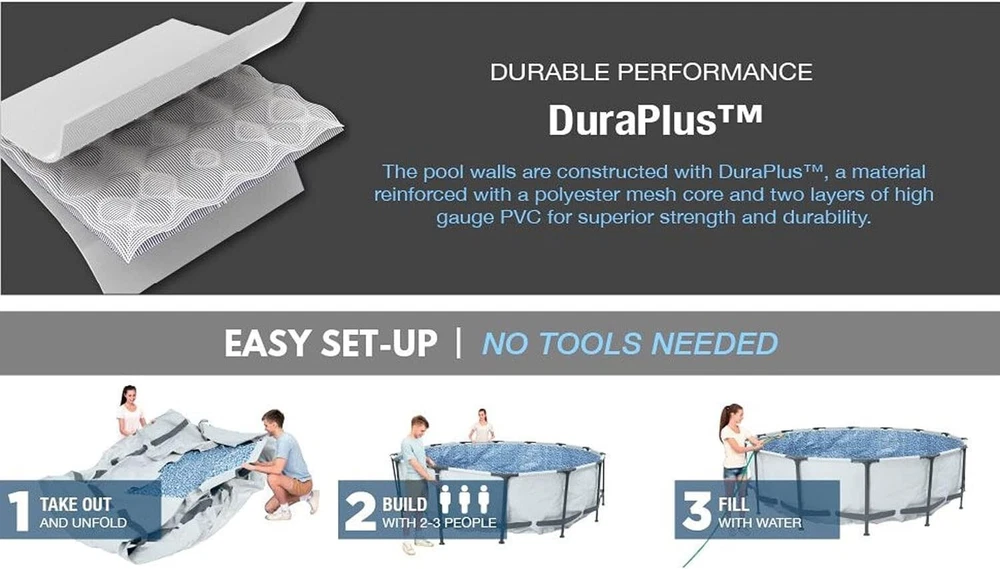 12 Foot x 30 Inch Round Metal Frame Above Ground Outdoor Backyard Swimming Pool Set with 330 GPH Filter Pump ENDLESS SUMMER FUN: Kids and adults of all ages can enjoy swimming and splashing in 's Above Ground Pool (12' x 30"), an above ground pool designed with extremely rigid, round-shaped frame for increased strength and durability. SUPERIOR FRAME DESIGN: The pool frames are applied with a rust and corrosion-resistant coating to protect the pool from UV and abrasion damage. A 3-ply PVC support band surrounds the pool for additional stability to the pool wall. MADE TO LAST: A durable, yet lightweight DuraPlus enhanced 3-ply liner provides structural integrity to your pool. It's puncture-resistant and won't fade overtime to sun exposure. UNMATCHED DESIGN: A corrosion-resistant steel frame is held together with our Frame System to provide remarkable strength and connection. EASY TO ASSEMBLE: No tools are required to install this above ground pool in your backyard. A flow-controlled drain valve provides a simple solution for emptying the excess water. Get ready to have hot summer fun in minutes! CONTENTS: 1 pool, 1 filter pump (compatible with Type I cartridge). Water capacity (90%): 1,710gal. Measures 12 feet in diameter x 30 inches high Includes 330 Gallon Filter Pump and Filter Cartridge so pool can be used after set up Heavy Duty PVC Repair Patch Kit included Includes DVD detailing pool set up and maintenance Flow Control Drain Valve for easy draining 12ft Steel Pro Frame Pool Set is a fantastic family swimming pool because it isn't too deep and has been built to last season after season. It's a great way to practice swimming, entertain guests or cool down in the sweltering sunshine. Rust-resistant, steel frames are used to construct the 12ft pool and are fitted together using simple 'T' connectors and 'C' clips. All the fittings have been specially designed to lock together with ease. The frames hold the heavy-duty, PVC and polyester 3-ply wall in place, whilst PVC flaps hide the 'T' connectors and 'C' clips to protect from rust and injury. The only tool needed is a screwdriver to fit the included 330gal filter pump to your pool. Setting up the metal frame pool takes no time at all with the included instructional DVD. From the Manufacturer gives you the most cost effective way to bring a durable long lasting swimming pool to your backyard. The 12'x32" Steel Pro Frame Above Ground Swimming Pool sets up in 60 minutes or less and includes everything you need to begin your swimming fun. With proper maintenance and care your 12'x32" Steel Pro Frame Above Ground Pool will give you s of enjoyment. The strong and rust resistant metal frame pools are wrapped with heavy duty PVC and polyester 3-Ply walls. At the end of the season draining your pool is made easy with the attached Flow Control Drain Valve. The valve can attach to your garden hose so water can be drained away from your home. Your pool comes with a 330 Gallon Filter Pump and Filter Cartridge, Heavy Duty Repair Patch and free DVD detailing pool set up and maintenance. Order today!