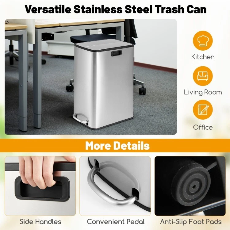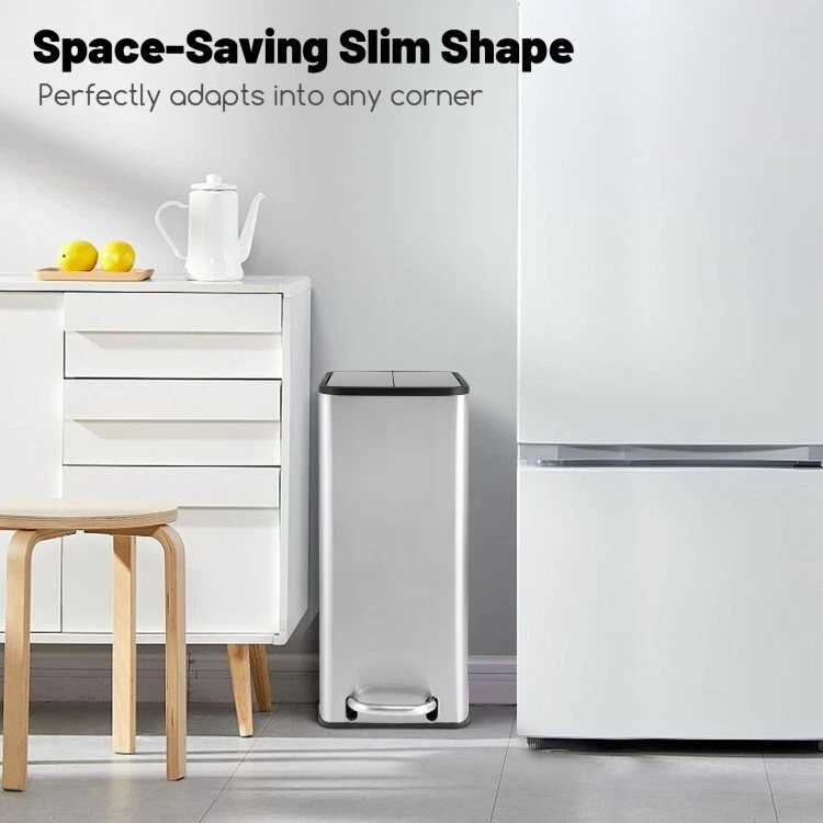 12 Gal Kitchen Stainless Steel Trash Can Basket Detachable Bucket With Wing Lids ● Detachable Inner Bucket: Simplify your waste disposal routine with the 12 gal trash can's easily removable inner bucket. This clever feature allows for quick and clean trash bag changes while also protecting the outer shell from spills and stains. ● Stainless Steel Structure: The kitchen waste bin boasts a 3-layered frame, composed of a stainless steel layer, a drawing wire layer, and an anti-fingerprint layer. Besides, it is robust and rustproof for long-term use, while being stain-proof for easy cleanup. ● Soft-Closing Mechanism: To improve the using experience, the hand-free garbage can allows for pedal control and has a soft-closing system that makes the wing lids descend gracefully, eliminating disruptive noise and avoiding pinch accidents. ● Full-Open Wing Lids: The waste bin's unique wing lid design makes it an ideal fit for low-clearance areas, allowing you to tuck it away neatly under counters or desks. The flaps open effortlessly from the center, offering a wide opening for discarding waste. ● Slim Shape and Wide Use: Designed to be space-saving, the step trash can properly fits into any corner space. In addition, it comes with side handles, enabling you to move it to your kitchen, bathroom, living room, office, and more. Color: Silver Material: Stainless Steel, PP Size of Closed Status: 20.5" x 10.5" x 27" (L x W x H) Height of Open Status31.5" Size of Inner Bucket: 16" x 9" x 24" (L x W x H) Max Capacity: 12 Gal Net Weight: 16 lbs