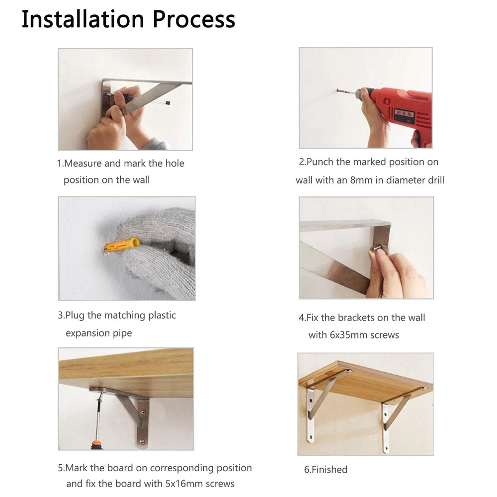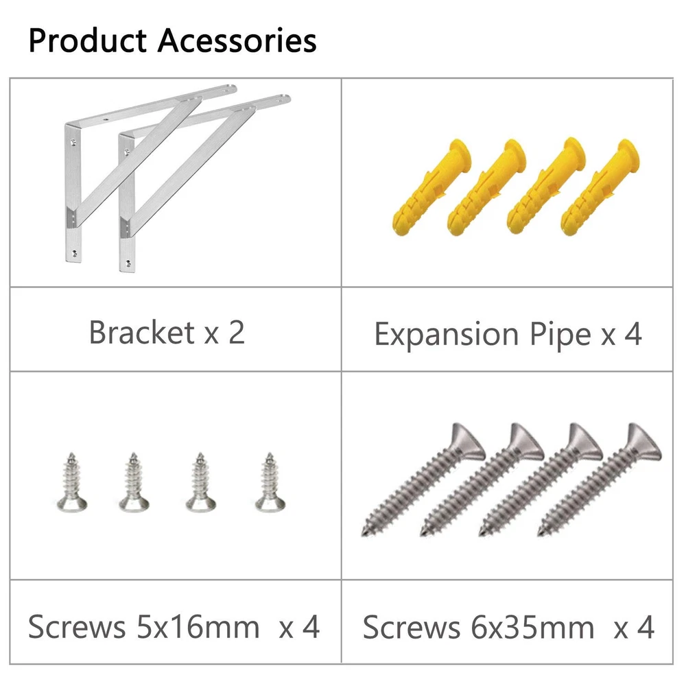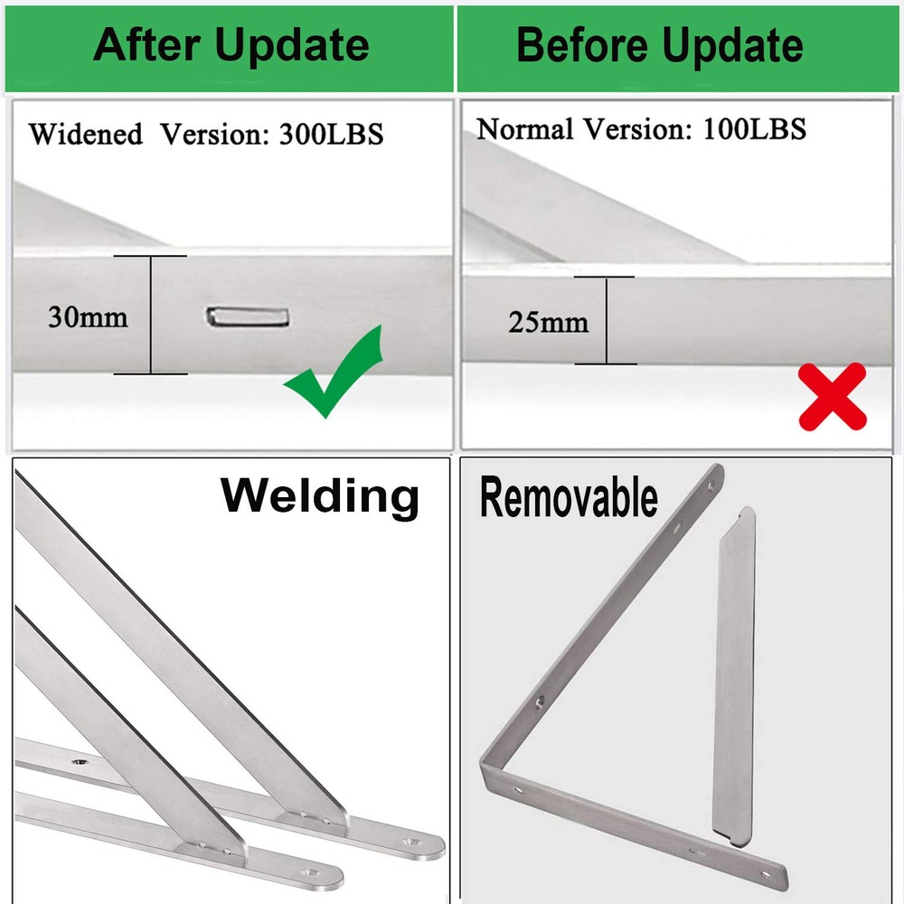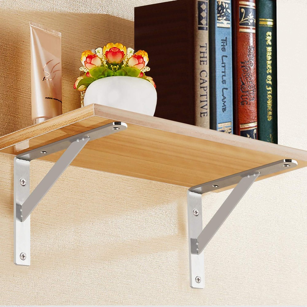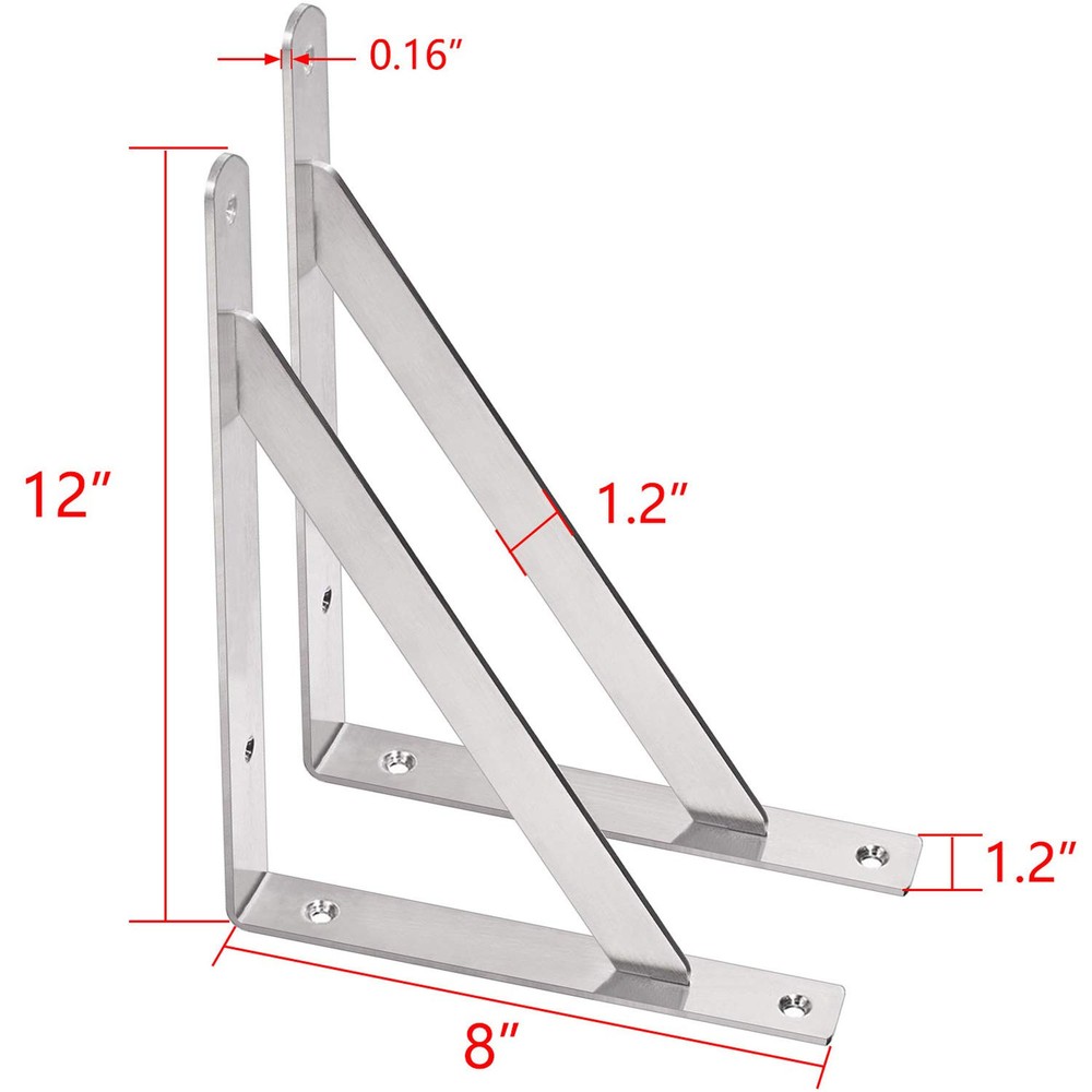 ✔STURDY &STRONG - The heavy duty shelf brackets that made of premium stainless steel will remian its good look for a long period. NO BEND, NO RUST, NO TARNISH OR CORROSION with brushed nickel finished! It makes the bracket good quality with high hardness, sturdy and strong bearing force, strong capacity could hold up to 400LBS. ✔SPACE SAVING - The folding shelf bracket hinges lock at 90 degrees.Great to use for decoration and space saving.Just open it for work and folded if down for space saving. Ideal for making a workstation in your garage, a folding study table for your , bench in your backyard, clothes table in laundry room, bookshelf, kitchen shelf, exhibition stand, etc. ✔EASY INSTALLATION & USE -The shelf brackets are suitable for DIY jobs, each package will contain premium quality anchors, screws and installation manual.This shelf bracket is designed to fit nominal size. Shelf bracket: 12 x 8 inch, which is suitable for installing 14”wide lumber board sold by Homedepot.(Wood plank is Not included). ✔TRIANGULAR DESIGN - Wall shelf brackets are designed by triangular structure, provide good stability.90 degrees close to the wall, stable without shaking and tilt.Maximum load is 450lbs per pair.Just install with a wooden plank and use the shelves to display photos, keepsakes, plants, other decoration pieces or use as a workbench. Hang wall mounted shelves in your bedroom closet,family room, or dining room. ✔MONEY BACK AFTER SALE SERVICE - 90 days return and money back if you don't like it. free .Any issues of the product, please us! DOKU provides any in future use. Just feel free to us once you have any problem. Backed by DOKU’s Limited .