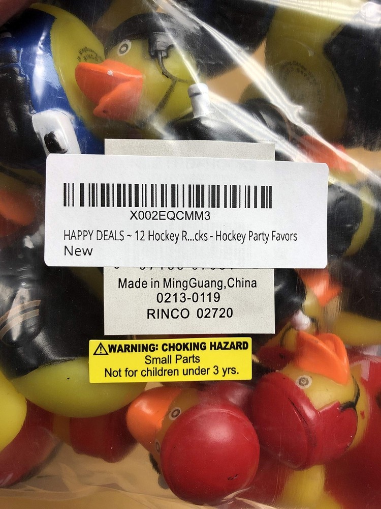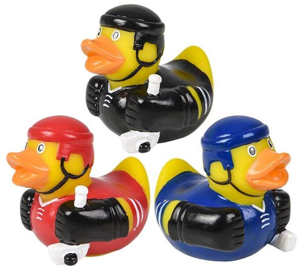 12 Hockey Rubber Ducks - Hockey Party Favors Product Details Product Dimensions: 2 x 2 x 2 inches Item Weight: 8.1 ounces Manufacturer recommended age: 4 years and up Is Discontinued By Manufacturer: No Department: unisex-child Manufacturer: toyco 12 Hockey Duckies 2 inch size Ducks are 2 inch and come 12 per bag, Duckies do not float upright. these make great Stocking Stuffers or favors!