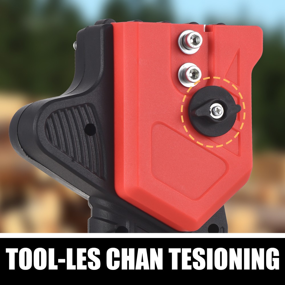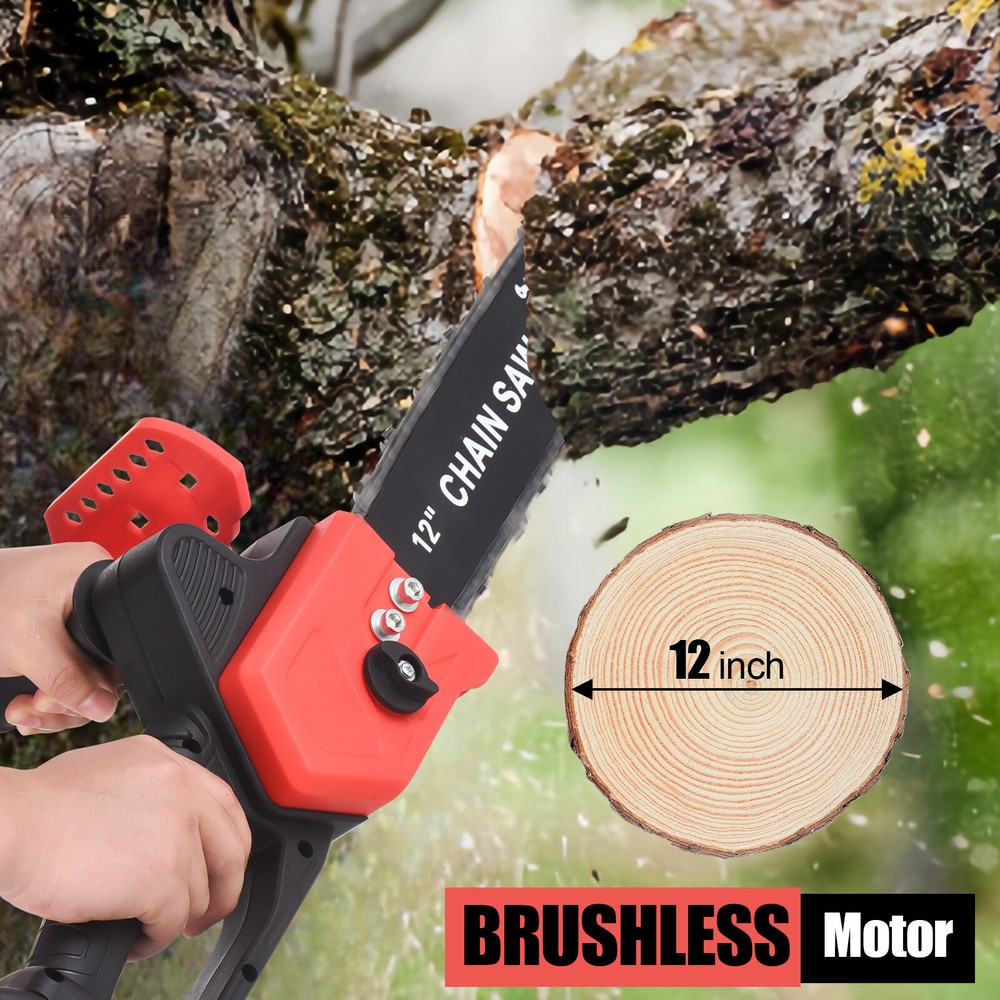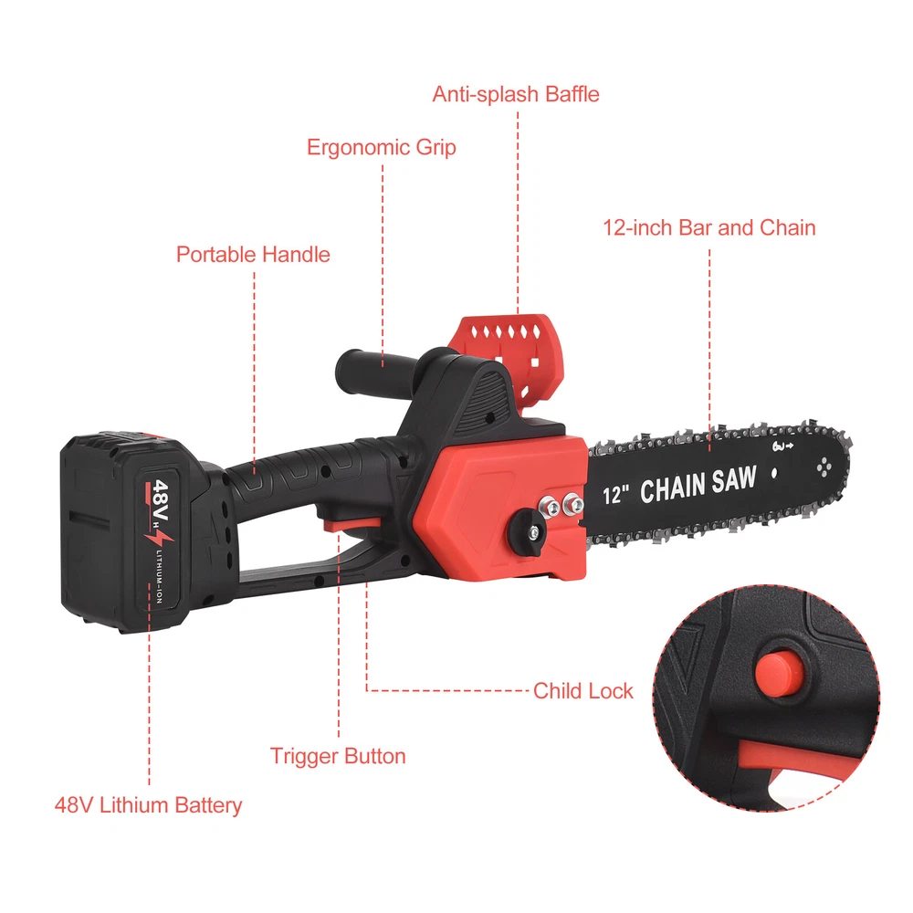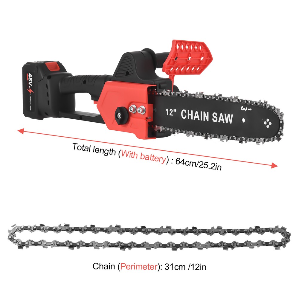 Features: 【Powerful and Efficient】: Equipped with a 1000W brushless motor, the 12-inch high-speed wireless lithium battery chainsaw delivers powerful performance for faster cutting. With a speed of 4500rpm, it effortlessly tackles various woodworking tasks, making it an excellent choice for professionals and DIY enthusiasts alike. 【Cordless Design with Long Battery Life】: Say goodbye to tangled cords and limited mobility. This battery powered chainsaw offers cordless convenience, allowing you to move freely and easily navigate around your work area. The included battery and charger provide long-lasting power, ensuring uninterrupted operation during your projects. 【Versatile and Lightweight】: Whether you're pruning branches or felling small trees, this cordless chainsaw is up for the task. Its lightweight design makes it easy to maneuver and reduces fatigue, allowing you to work comfortably for extended periods. It's perfect for both professional use in the woodworking industry and for regular home maintenance. 【Safe and User-Friendly】: Designed with user safety in mind, this electric chainsaw features multiple safety features, including a safety switch. The ergonomic handle provides a comfortable grip and reduces vibrations, minimizing the risk of accidents and ensuring a smooth cutting experience. 【Quiet Operation and Easy Maintenance】: Compared to traditional gas-powered chainsaws, this electric chainsaw cordless operates quietly, creating a peaceful working environment and reducing noise pollution. Additionally, its low-maintenance design saves you time and effort, allowing you to focus more on your projects and less on maintenance tasks. Specification: Product material: ABS + stainless steel Product size: 64 x 18 x 15cm / 25.2 x 7.09 x 5.91in Chain size: 12" Product color: Black Red Battery: 1*48V 4000mAh battery Power: 1000W Speed: 4500rpm Charging time: about 3h Usage time: about 30min Plug type: 110V US plug Packing List: 1 x Electric Chainsaw 1 x Wrench 1 x Charger 1 x Battery 1 x Manual