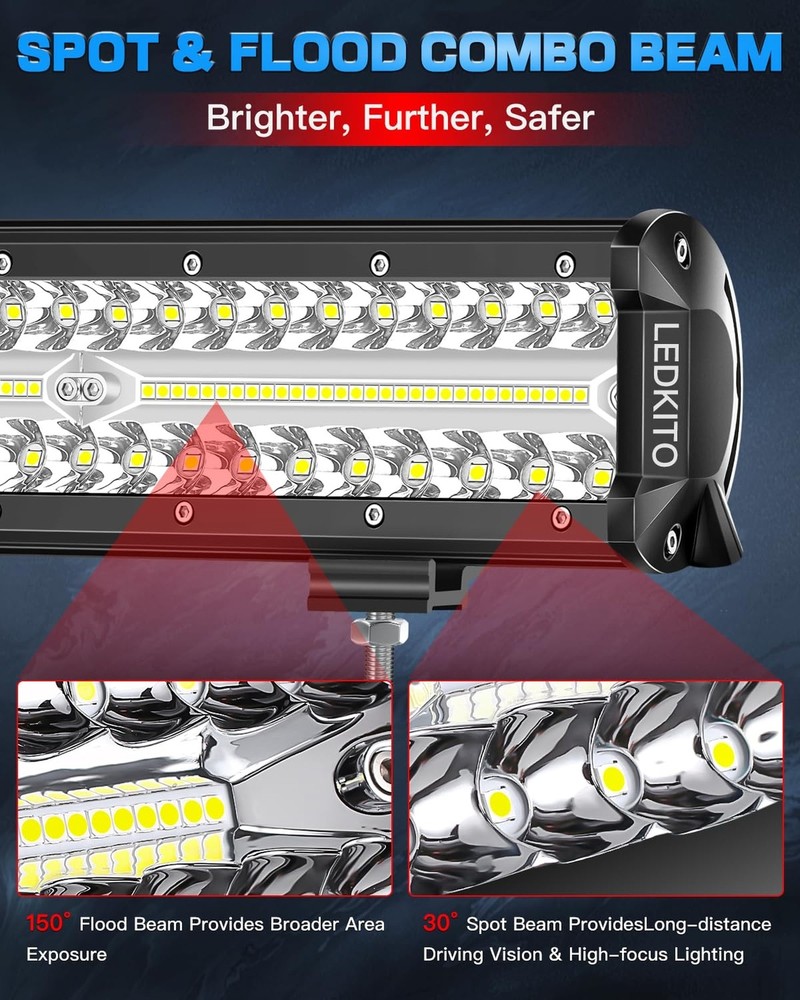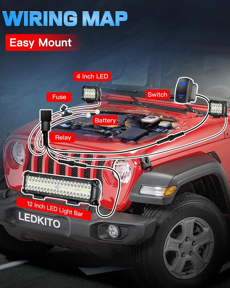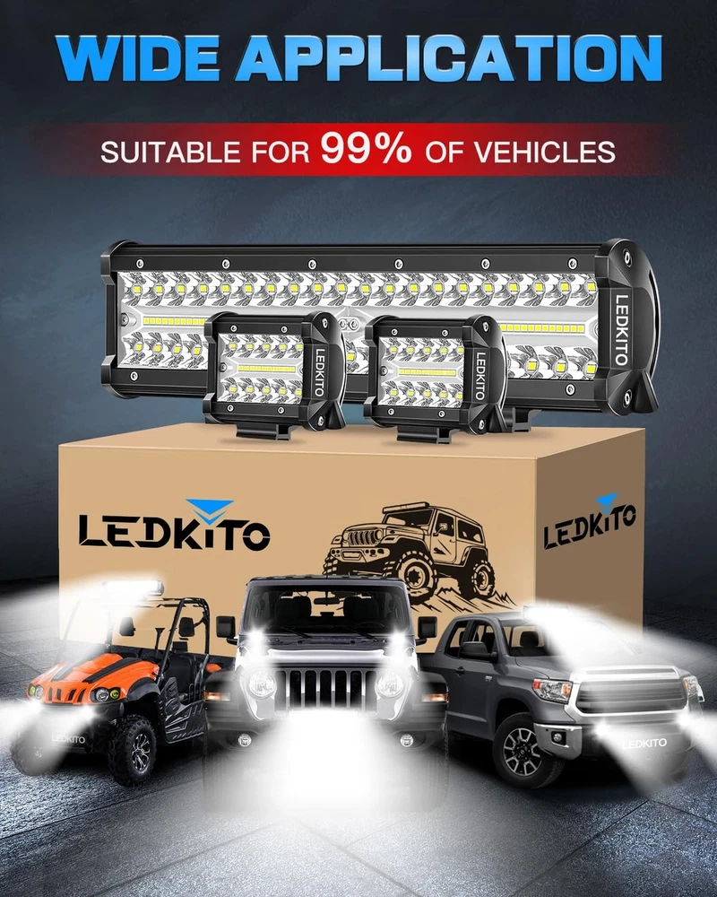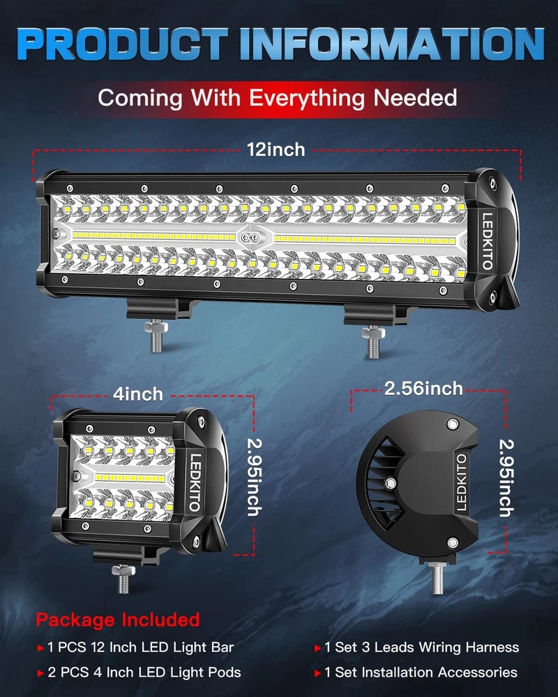 12 Inch LED Light Bar and 2PCS 4 Inch LED Pods with Rocker Switch 3 Lead Wiring Harness Kit Triple Row Off Road Light Bar Spot Flood Combo Light Bar for UTV Truck Tractor Product Details Size: 12+4in LED Light Bar Kit with Rocker Switch Brand: LEDKITO MPN: 12+4in LED Light Bar with Rocker Switch UPC: Does not apply EAN: Does not apply Item dimensions L x W x H: 12 x 2.56 x 2.95 inches Brand: LEDKITO Color: White Form Factor: Bar, Pod Recommended Uses For Product: Bumper Light, Work Light, Off-Road Light, Driving Light Auto Part Position: Front Included Components: 2PCS 4in led cube pod lights, Necessary mounting hardware, 4PCS Adjustable Sliding Mounting Brackets, 1PCS 12 inch Led Light Bar, 3 leads 12ft 5 Pin Rocker Switch Wiring Harness See more Connectivity Technology: Plug-and-Play Connector Special Feature: Adjustable Voltage Range Material: Aluminum Product Dimensions : 12 x 2.56 x 2.95 inches; 4.54 Pounds Item model number : 12+4in LED Light Bar with Rocker Switch Date First Available : June 6, 2024 Manufacturer : Kito-Light Country of Origin : China Customer Reviews: 4.3 4.3 out of 5 stars 82 ratings Item dimensions L x W x H: 12 x 2.56 x 2.95 inches Brand: LEDKITO Color: White Form Factor: Bar, Pod Recommended Uses For Product: Bumper Light, Work Light, Off-Road Light, Driving Light Auto Part Position: Front Included Components: 2PCS 4in led cube pod lights, Necessary mounting hardware, 4PCS Adjustable Sliding Mounting Brackets, 1PCS 12 inch Led Light Bar, 3 leads 12ft 5 Pin Rocker Switch Wiring Harness Connectivity Technology: Plug-and-Play Connector Special Feature: Adjustable Voltage Range Material: Aluminum Water Resistance Level: Waterproof Manufacturer: Kito-Light Part Number: 12+4in LED Light Bar with Rocker Switch Item Weight: 4.53 pounds Product Dimensions: 12 x 2.56 x 2.95 inches Country of Origin: China Item model number: 12+4in LED Light Bar with Rocker Switch Assembled Height: 2.95 inches Assembled Length: 12 inches Assembled Width: 2.56 inches Item Package Quantity: 3 Style: Modern Shape: Rectangular Number of Lights: 140 Special Features: Adjustable Voltage Range Shade Material: Aluminum Power Source: Battery Powered Switch Installation Type: Pole Mount Batteries Included?: No Batteries Required?: No Certification: IP68 Bulb Features: Spot Beam, Flood Beam, Spot & Flood Combo Beam, Shock & Vibration Resistant Color Temperature: 6500 Kelvin Date First Available: June 6, 2024 Bright Combo Beam LED Light Bar and Pod Lights KitLEDKITO 12 Inch LED Light Bar and 2PCS 4 Inch LED Pods Kit Total Adopt 140PCS High Bright LEDs for Spot/Flood/Combo Lighting.Emit 6000k Bright White Light.The 30 Spot Beam Provide High-focus & Long-distance Illumination or for Specific Areas Search.While The 150 Flood Beam Provides Broader Area Exposure for Wider Vision.The Spot & Flood Combo That Emits Brighter,Broader & Farther Beam,Improve Overall Visibility.Perfect for Off Road Driving! Complete Off Road Lights KitLEDKITO 12 Inch LED Light Bar and 2PCS 4 Inch LED Pods Off Road Lights Kit With Switch 3 Lead Off-road Wiring Harness Kit[With Screws Down Caps for Waterproof,Quickly Connection,Inline Maximum Voltage DC 12V/40A Relay & 30A Blade Fuse],The Switch Can Prevent to Drain The Battery.The 12" LED Off Road Light Bar and The 2PCS 4" LED Work Light Pods With Sliding Mounting Base Brackets,45 Up & Down Adjustable!Easy to Wiring And Mount to Front Bumper,Roof Rack,Hood. Wide ApplicationLEDKITO 12 Inch Off Road LED Light Bar and 2PCS 4 inch LED Light Pods Kit Suitable for Various Off Road,SUV,ATV,UTV,Trucks,Boat,Golf Cart,Tractor,Van,Side by Side with DC 12V Power Supply.The 12 Inch LED Bar Light & 4 Inch Pod Lights Kit is Perfect to Be Used As Off Road Light,Work Light,Fog Light,Driving Light, etc. Outstanding Waterproof PerformanceSilicone Ring Sealed PC Lamp Cover and Silicone Side Cover Gasket Sealed Body,IP68 Waterproof & Dustproof.The Off Road Wiring Harness With Scres Down Cap Connectors for Waterproof.All Full Sealed Design to Allow the 12in LED Bar Light and 4 Inch LED Cube Pods Works in Any Harsh Weather and Conditions:Rain,Dency Fog,Snow,Mud,Wading,Even Frozen.Extend Over 80,000H Lifespan. Excellent Heat DissipationHigh Strength,Durability,Anti-corrosion,Anti-rust,Anti-collision Aviation Aluminum Made LEDKITO 12 in LED Off Road Light Bar & 2PCS 4 Inch LED Pods,Each Adopt 10PCS Heat Dissipation Ribbed Fin Sink,Maximize Heat Dissipation Area,Improved Cooling Efficiency,Ensure The Heat Generated Can Be Dissipated in Time of The LED Off-road Driving Fog Lights Kit Long Time Works,Without Light Decay,Bright as Ever. IMPORTANT NOTEThe Comes With RELAY[OF THE WIRING HARNESS] MAXIMUM VOLTAGE RANGE IS DC 12V, If You Want to Use on Other Vehicles Exceeding DC 12V, Please REPLACE THE CORRESPONDING VOLTAGE RANGE RELAY to Avoid Burning Out the Circuit or The 12in LED Light Bar/4in LED Cube Pod Lights! LEDKITO SupportLEDKITO offer 24 hours online heartfelt service.If you have any questions about our 12in led off-road light bar & 4in LED Pods Kit,Please to contact us and we will do our best to serve you! The package including: 1PCS 12 inch Led Light Bar,2PCS 4in led cube pod lights,3 lead 12ft 5 Pin Rocker Switch Wiring Harness,4PCS Adjustable Sliding Mounting Brackets,other necessary mounting hardware.