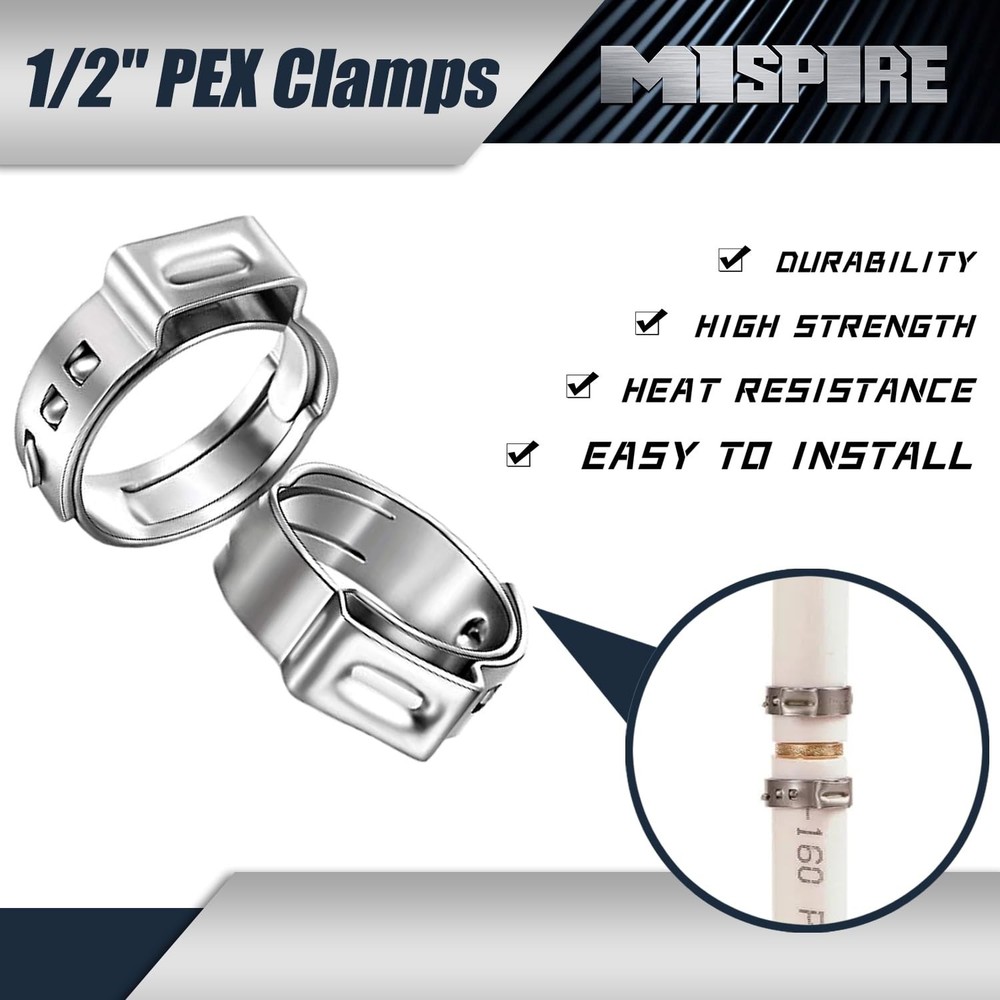 1/2 inch PEX Pipe Clamps 50 PCS, PEX Cinch Clamps Stainless Steel 304 Pinch Clamps for PEX Pipe Tubing Fitting Connections by MISPIRE Product Details Size: 1/2", 50 Pack Brand: MISPIRE MPN: MI-PC-012-50 UPC: Does not apply EAN: Does not apply Material: Stainless Steel Brand: MISPIRE Color: Silver Style: PEX Pipe Clamps Item Weight: 0.2 Kilograms Manufacturer: MISPIRE Manufacturer: MISPIRE Part Number: MI-PC-012-50 Item Weight: 7 ounces Package Dimensions: 7.6 x 5.63 x 1.14 inches Item model number: MI-PC-012-50 Size: 1/2", 50 Pack Color: Silver Style: PEX Pipe Clamps Material: Stainless Steel Shape: PEX Pipe Clamps Item Package Quantity: 50 Included Components: pex clamps Batteries Included?: No Batteries Required?: No Date First Available: September 24, 2023 [Package & Quantity] Pack of 50, 1/2 inch (17.5mm) PEX cinch clamp rings, fit for 1/2 inch PEX pipe. [Premium Quality] -High precision PEX clamps are made of 304 Stainless Steel, has good corrosion resistance, heat resistance, low temperature strength and mechanical properties, a good choice for long-term use. PEX cinch clamps are used to seal various types of pipes. [Leak-Proof & Easy to Use] -These interlocking rings provide a fast and reliable connection of all PEX pipes fittings. Form a complete 360-Degree watertight seal protection. The slide the clamp ring onto the pipe, push the pipe onto the fitting and squeeze it with a clamp tool. Provide a firm, leak-free and reliable crimp joint connection. [Widely Applications] -Widely applications in all plumbing system - Hydronic heating system, air condition system, water heater, Telecommunications electrical plumbing, food pipeline system etc. Providing a strong and reliable crimp fitting application. [Customer Service] Please feel free contact MISPIRE customer service team if any issues, we will do our best to fix the issue you meet.