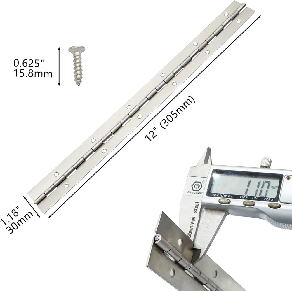 12 Inch Stainless Steel Continuous & Piano Hinge, 2Pcs Heavy Duty Polished Hinge Specification: 12 inch in length, 1/22" (1.1mm) blade thickness and 1-3/16" (30mm) opening width, 2 in. spacing between the screw holes. Ideal for a variety of doors, table leaves, and lids: This hinges provide continuous support along the entire length of the door and lid for durability. Stainless Steel: Stainless steel with surface Polishing, rust-resistant and prevents misalignment, Long-term use and Looks good. FUNCTION: Countersunk mounting holes will not fall out, surface mount for easy installation, can be cut to desired length. Provide greater stability than traditional hinges, great for heavier doors and lids that require extra support. Shipping We offer FREE shipping on all orders! We ship within Three business days of payment, usually sooner. We use a selection of shipping services such as UPS, FedEx, USPS etc. We only ship to the lower 48 states, no APO/FPO addresses or PO Boxes allowed. Local pickups and combined shipping options are not provided at this time. Return You can return a product for up to 30 days from the date you purchased it. Any product you return must be in the same condition you received it and in the original packaging. Please keep the receipt. Customer satisfaction is very important to us. If you have any problem with your order, please contact us and we will do our best to make you satisfied. Contact Us If you have any queries, please contact us via ebay. We usually respond within 24 hours on weekdays. Please visit our eBay store to check out other items for sale! Thank you for shopping at our store.
